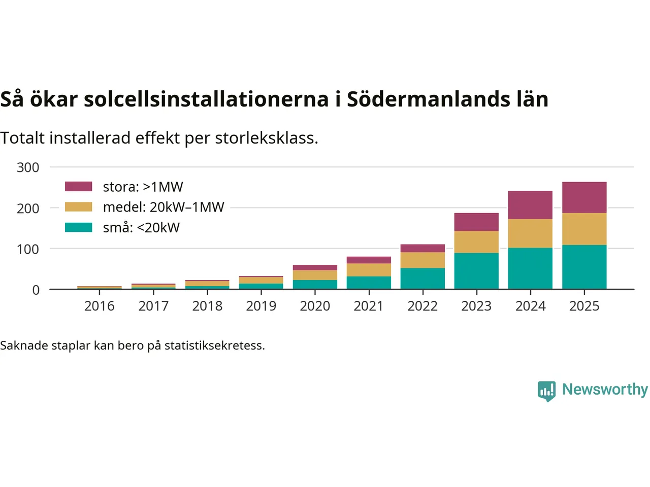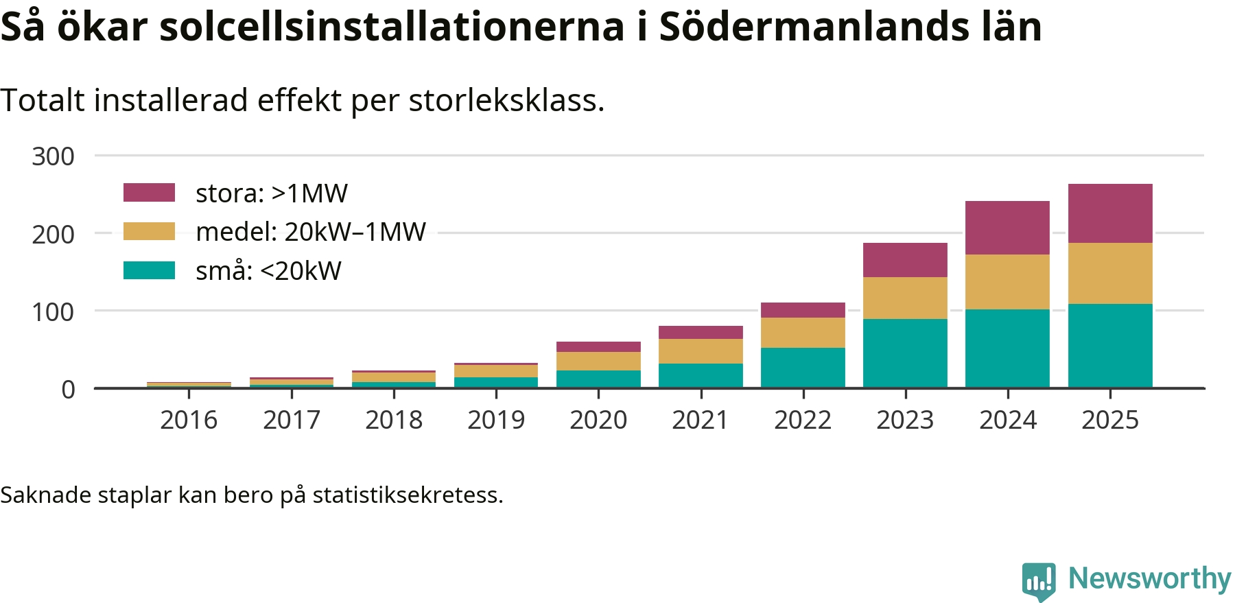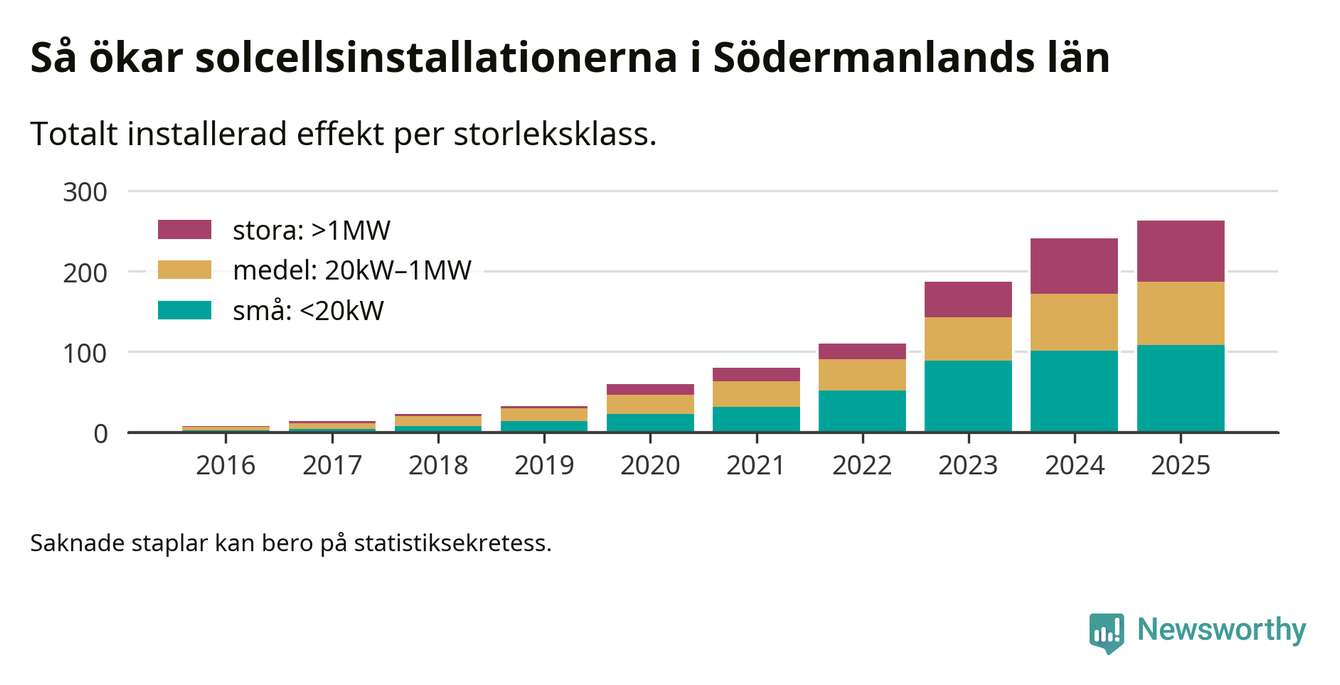 Det är framför allt de stora anläggningarna som driver tillväxten. Småskalig solel dominerar fortfarande produktionen – mer än hälften av effekten finns i anläggningar under 20 kilowatt – men det är bland de stora anläggningarna vi ser den största ökningstakten.