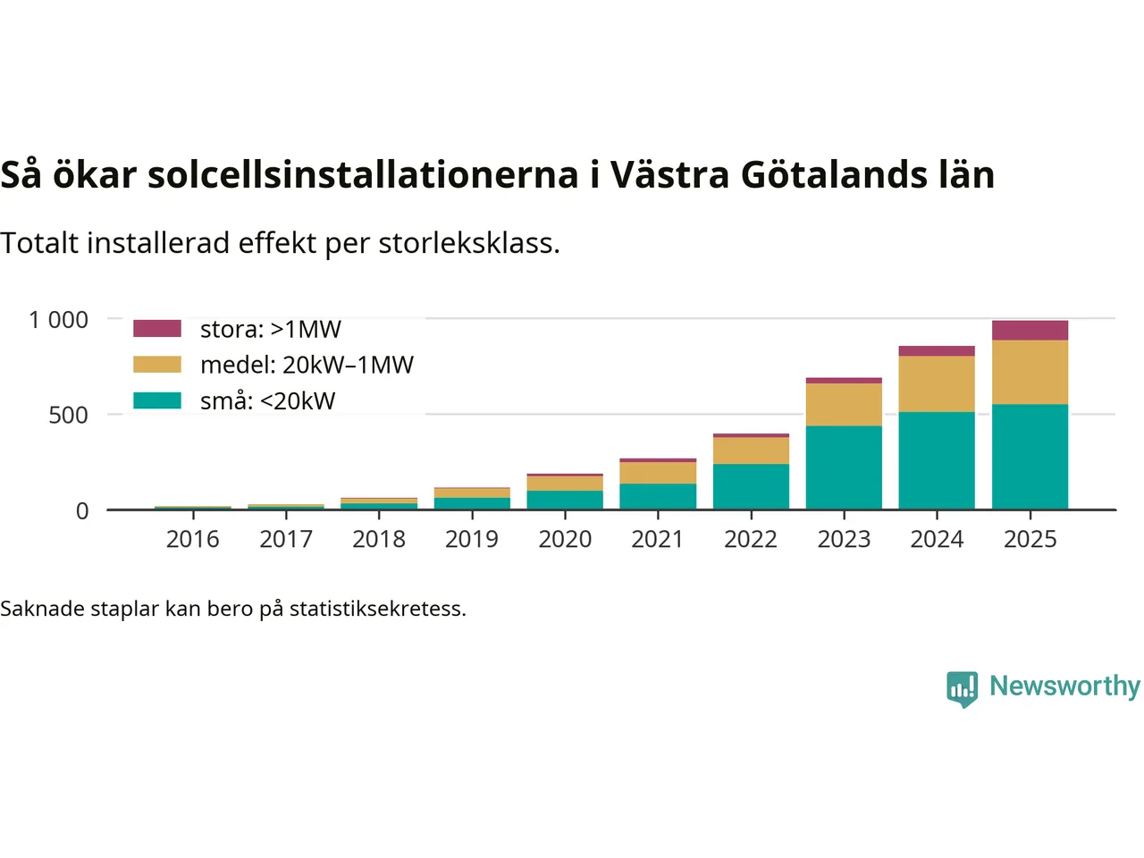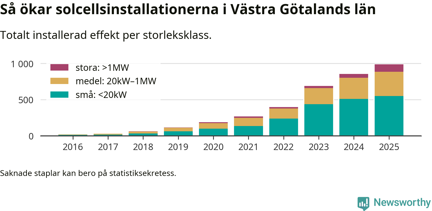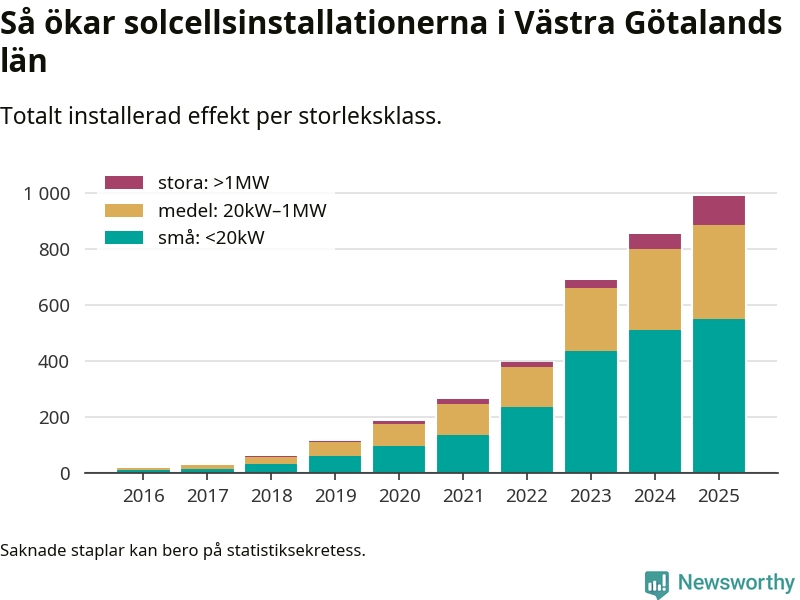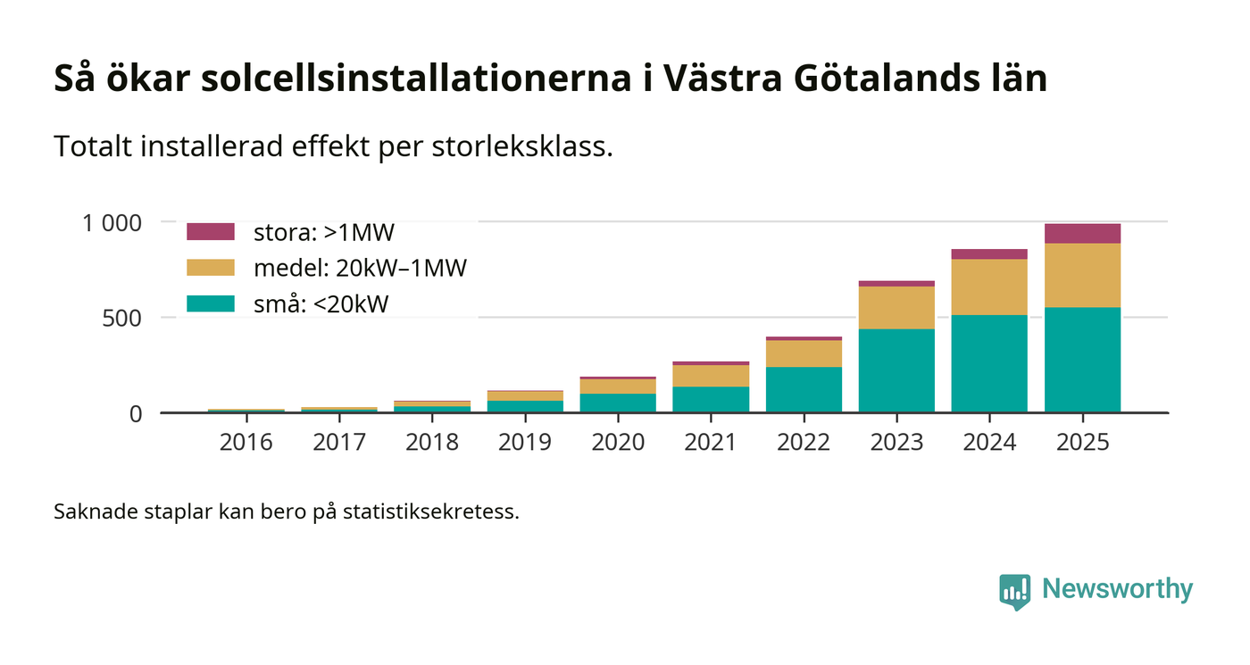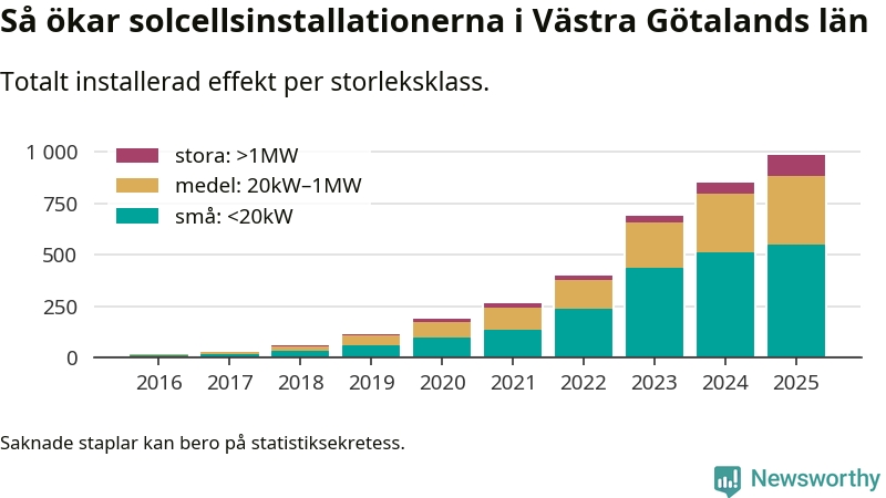 Det är framför allt de stora anläggningarna som driver tillväxten. Småskalig solel dominerar fortfarande produktionen – mer än hälften av effekten finns i anläggningar under 20 kilowatt – men det är bland de stora anläggningarna vi ser den största ökningstakten.