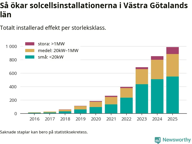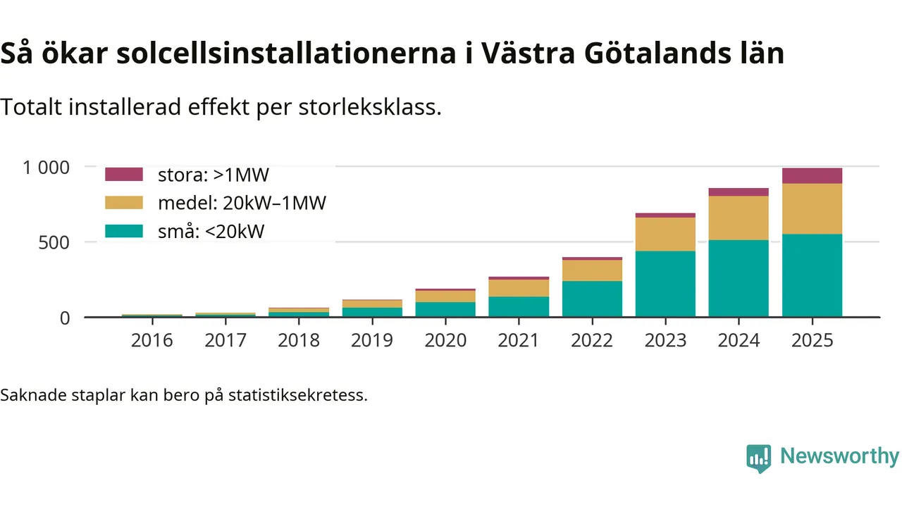 Under 2025 anslöts 116,6 megawatt ny solel till elnätet i Västra Götalands län, en ökning med 13 procent jämfört med året innan.