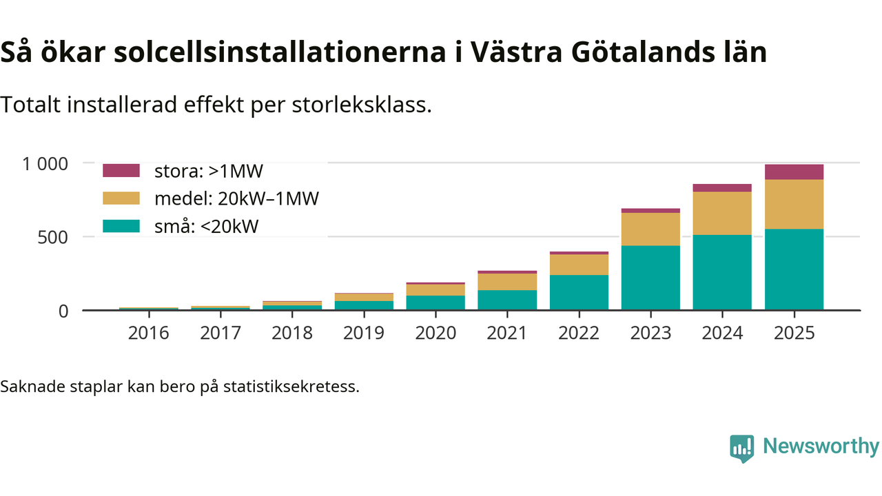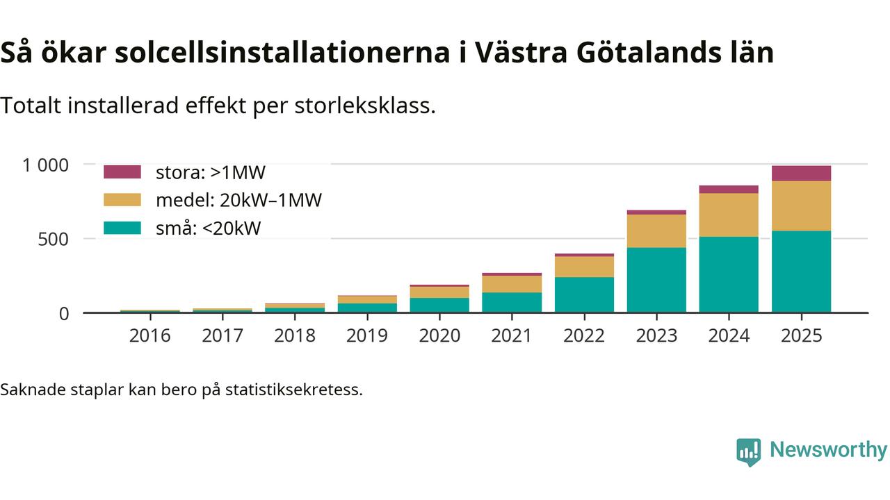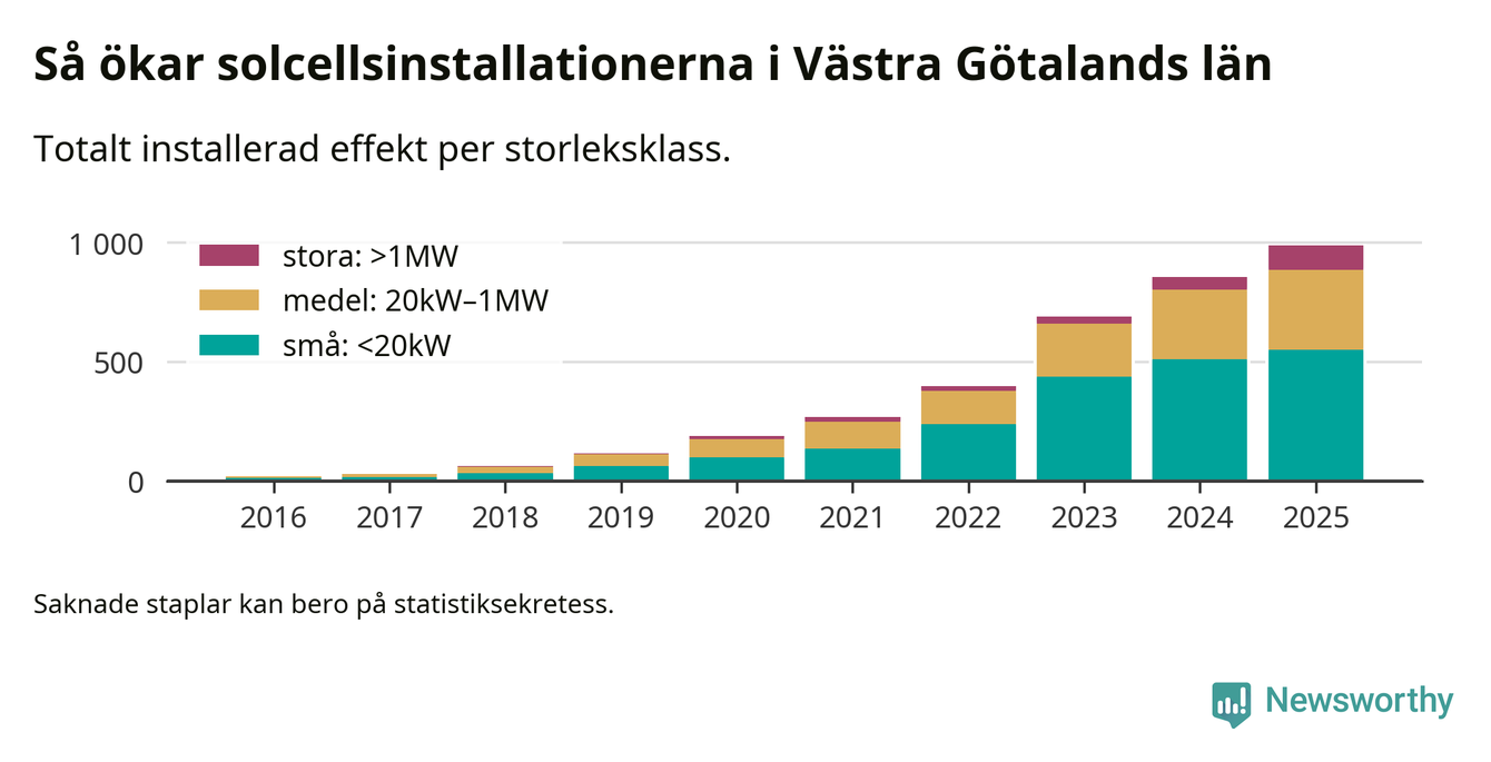 Totalt finns 56 515 nätanslutna anläggningar, om sammanlagt 987,8 megawatt i länet. Det motsvarar, i runda tal, en elproduktion på någonstans mellan 17 och 20 procent av vad hushållen i Västra Götaland förbrukar per år.1