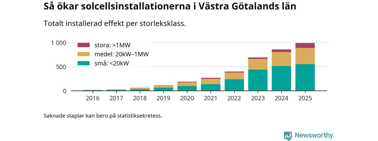 Den största delen av solelen i Västra Götaland, 56 procent, kommer från småskaliga anläggningar, totalt 50 899 stycken. Det påminner om hur det ser ut i riket som helhet. I hela Sverige står anläggningar under 20 kilowatt för mer än hälften av den installerade effekten. Generellt är deras andel störst i kommuner med många villahushåll, medan större anläggningar dominerar i tätbefolkade kommuner med fler flerfamiljsbostäder – och förstås i de småkommuner som har någon av landets stora markanläggningar för solel.