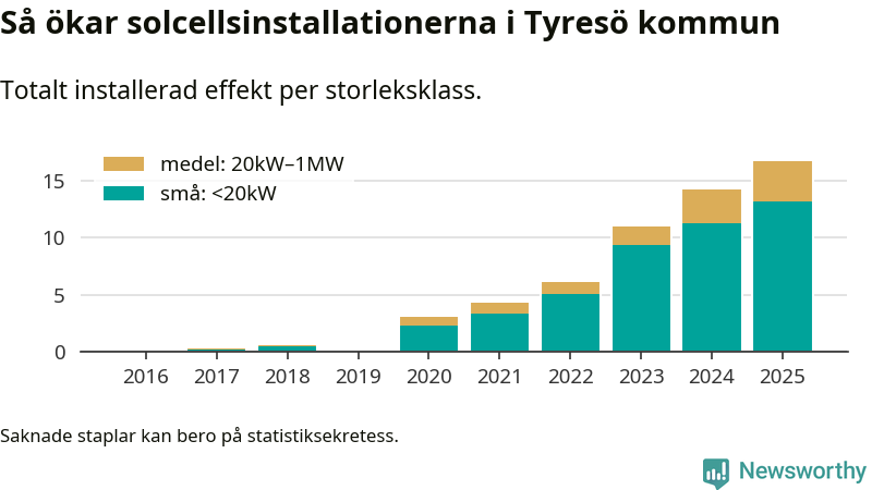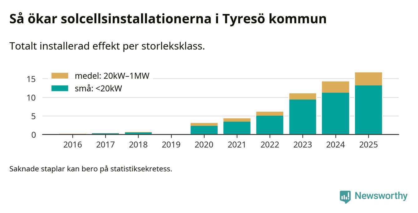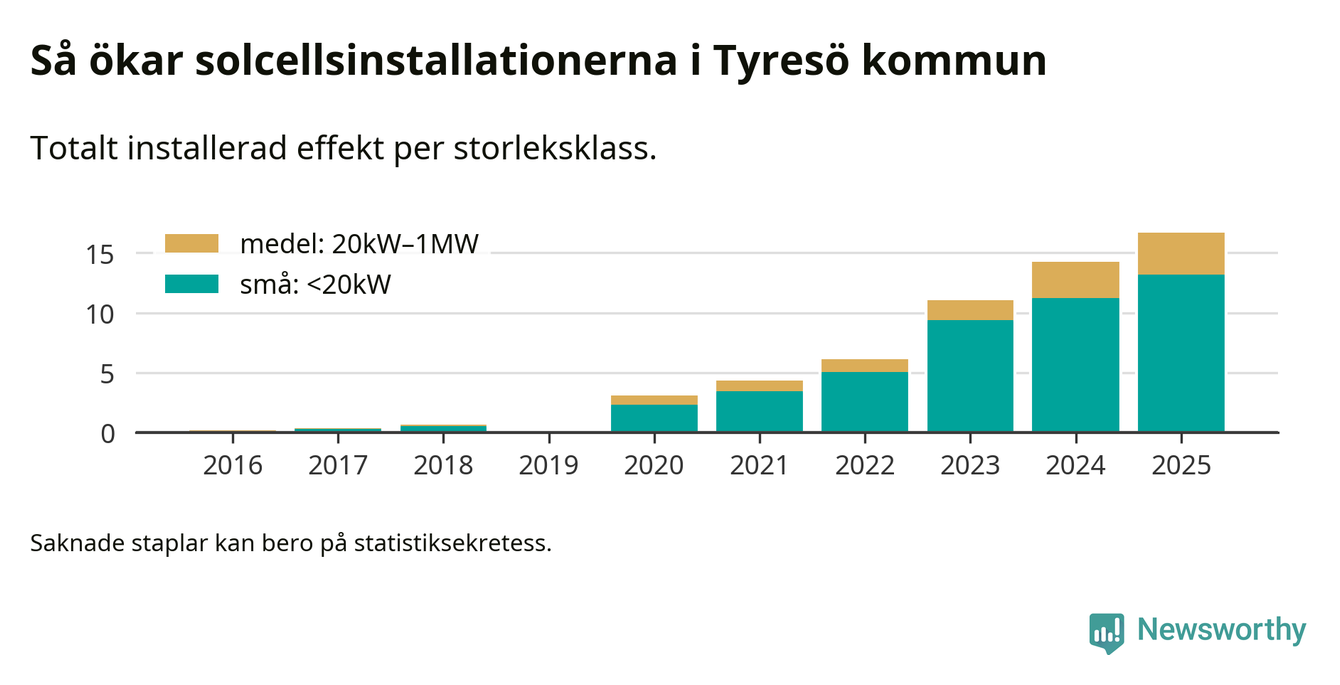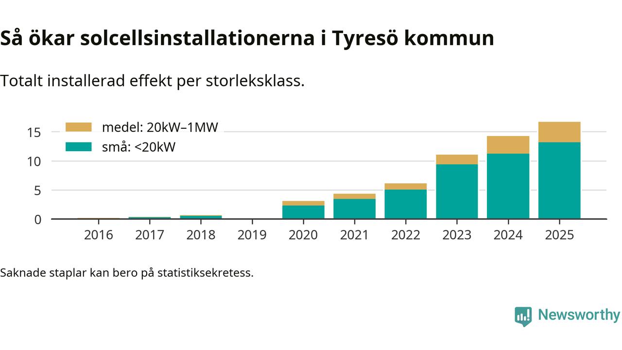 Under 2025 anslöts 2,4 megawatt ny solel till elnätet i Tyresö kommun, en ökning med 17 procent jämfört med året innan.