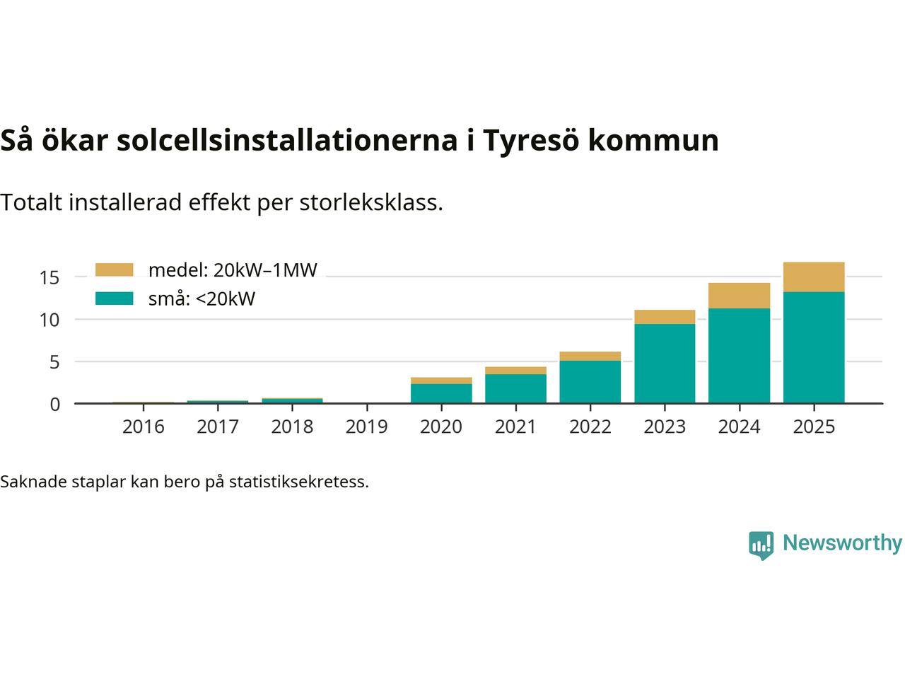 Det är framför allt de stora anläggningarna som driver tillväxten. Småskalig solel dominerar fortfarande produktionen – mer än hälften av effekten finns i anläggningar under 20 kilowatt – men det är bland de stora anläggningarna vi ser den största ökningstakten.