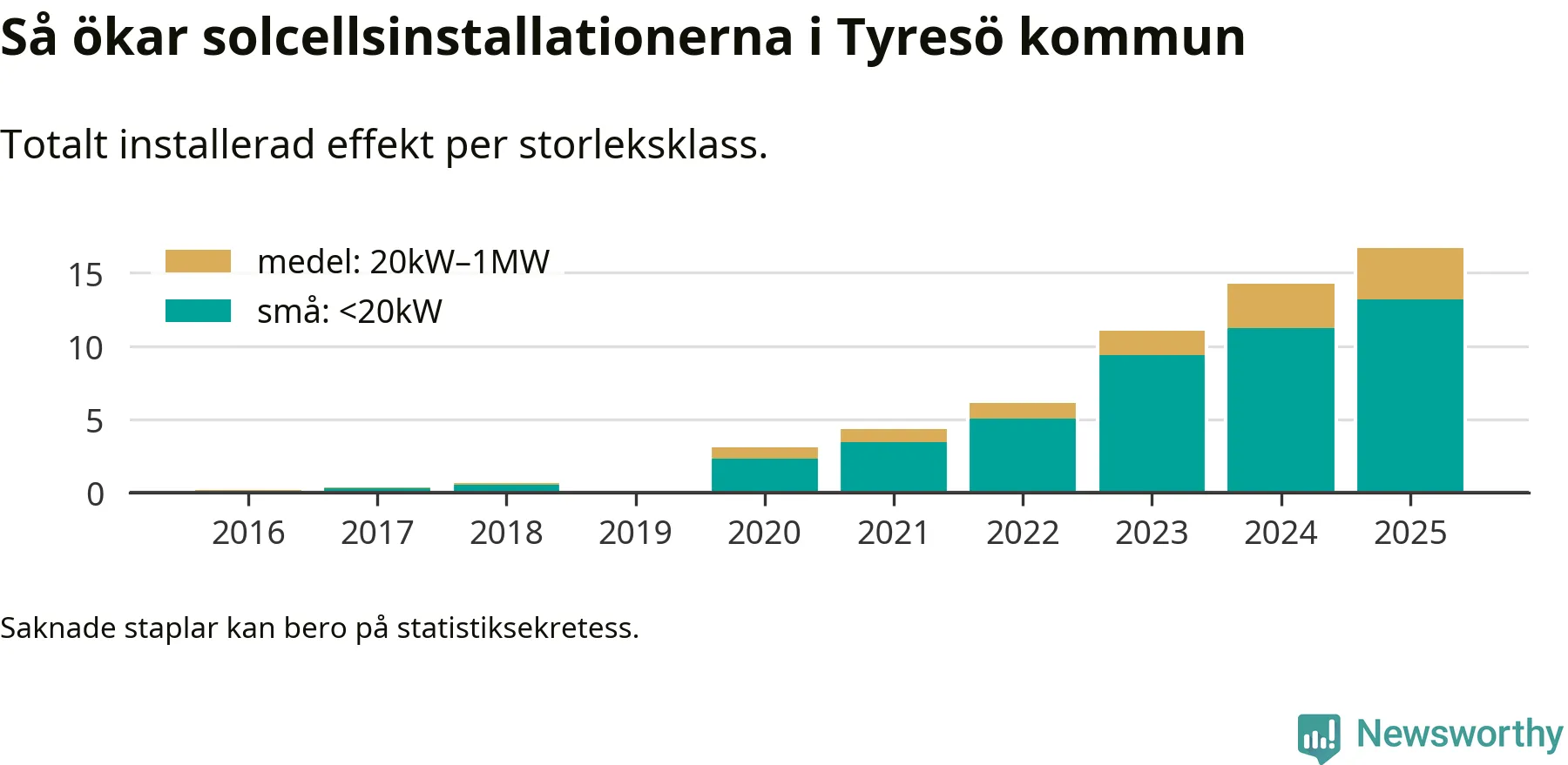 Den största delen av solelen i Tyresö, 79 procent, kommer från småskaliga anläggningar, totalt 1 268 stycken. Det påminner om hur det ser ut i riket som helhet. I hela Sverige står anläggningar under 20 kilowatt för mer än hälften av den installerade effekten. Generellt är deras andel störst i kommuner med många villahushåll, medan större anläggningar dominerar i tätbefolkade kommuner med fler flerfamiljsbostäder – och förstås i de småkommuner som har någon av landets stora markanläggningar för solel.