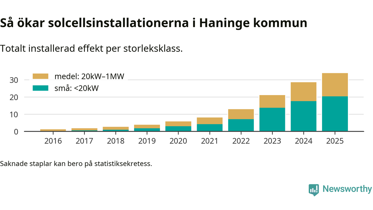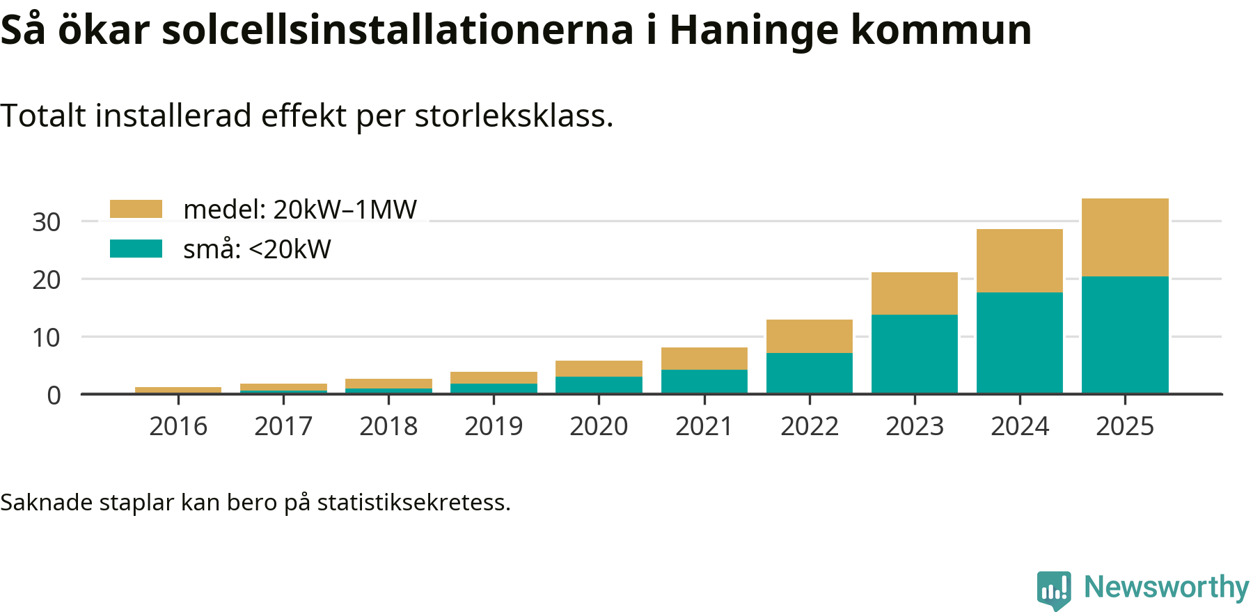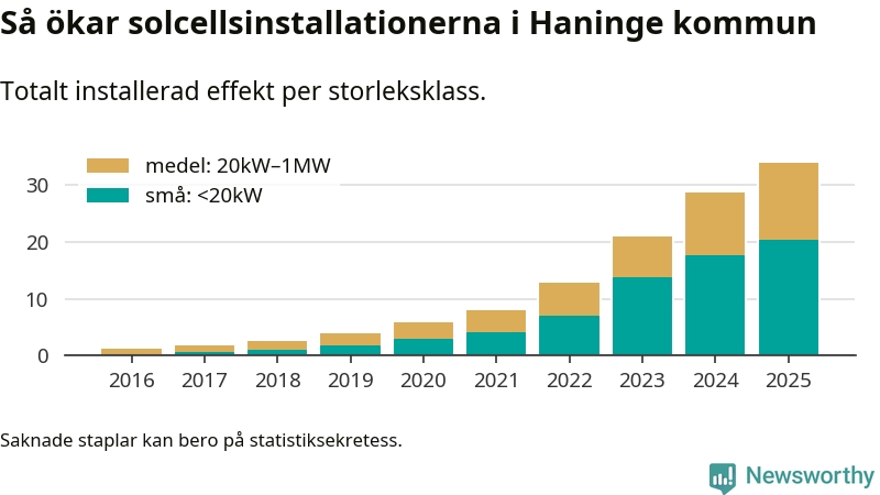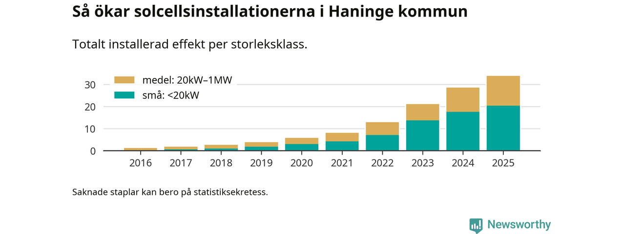 Totalt finns 2 140 nätanslutna anläggningar, om sammanlagt 33,8 megawatt i kommunen. Det motsvarar, i runda tal, en elproduktion på någonstans mellan elva och 13 procent av vad hushållen i Haninge förbrukar per år.1
