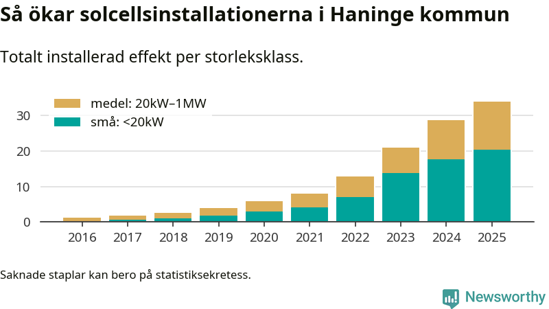 Den största delen av solelen i Haninge, 60 procent, kommer från småskaliga anläggningar, totalt 1 970 stycken. Det påminner om hur det ser ut i riket som helhet. I hela Sverige står anläggningar under 20 kilowatt för mer än hälften av den installerade effekten. Generellt är deras andel störst i kommuner med många villahushåll, medan större anläggningar dominerar i tätbefolkade kommuner med fler flerfamiljsbostäder – och förstås i de småkommuner som har någon av landets stora markanläggningar för solel.