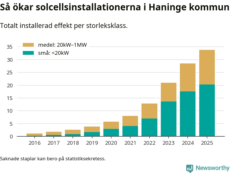 I Haninge kommun ökade den installerade solelseffekten i fjol med 18,4 procent, vilket var ungefär som i riket som helhet. Det visar ny statistik från Energimyndigheten.