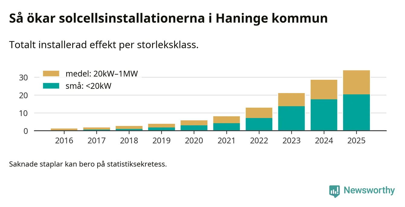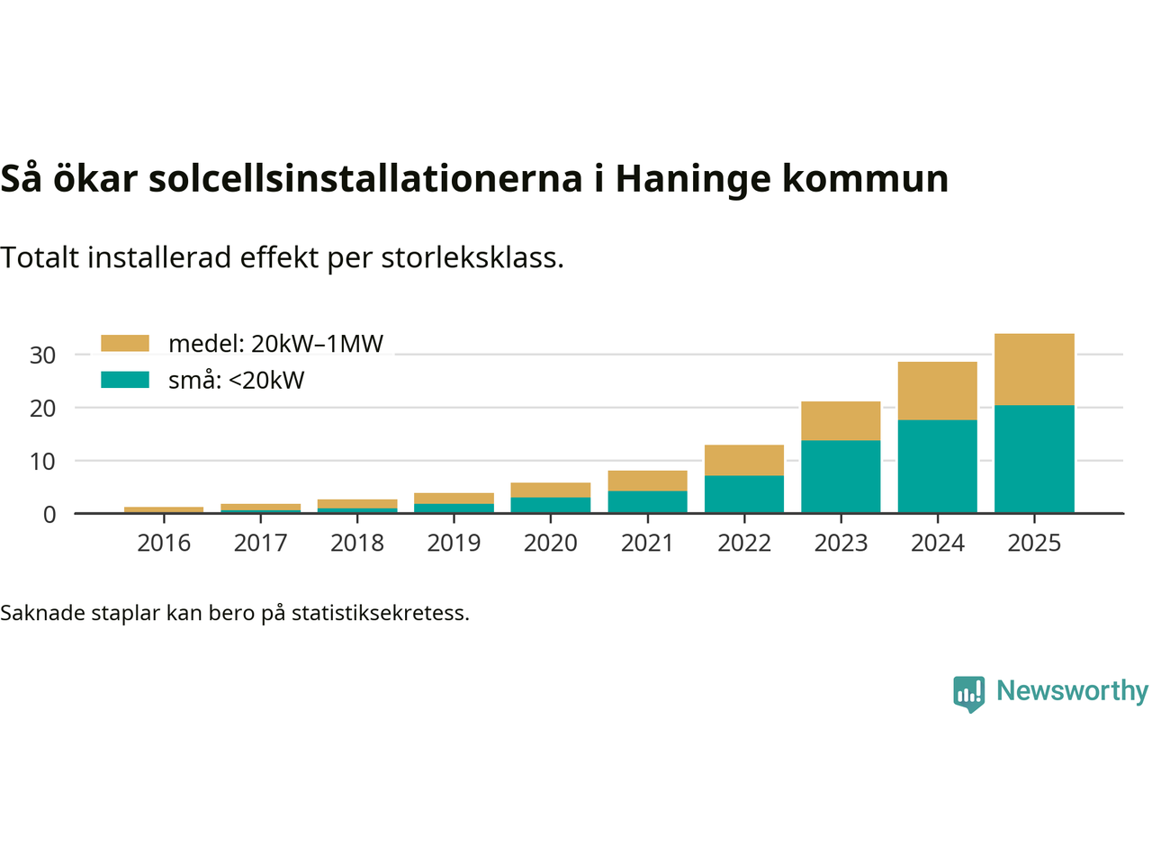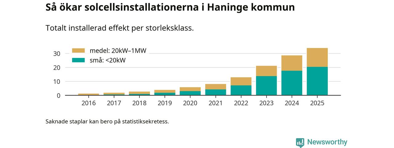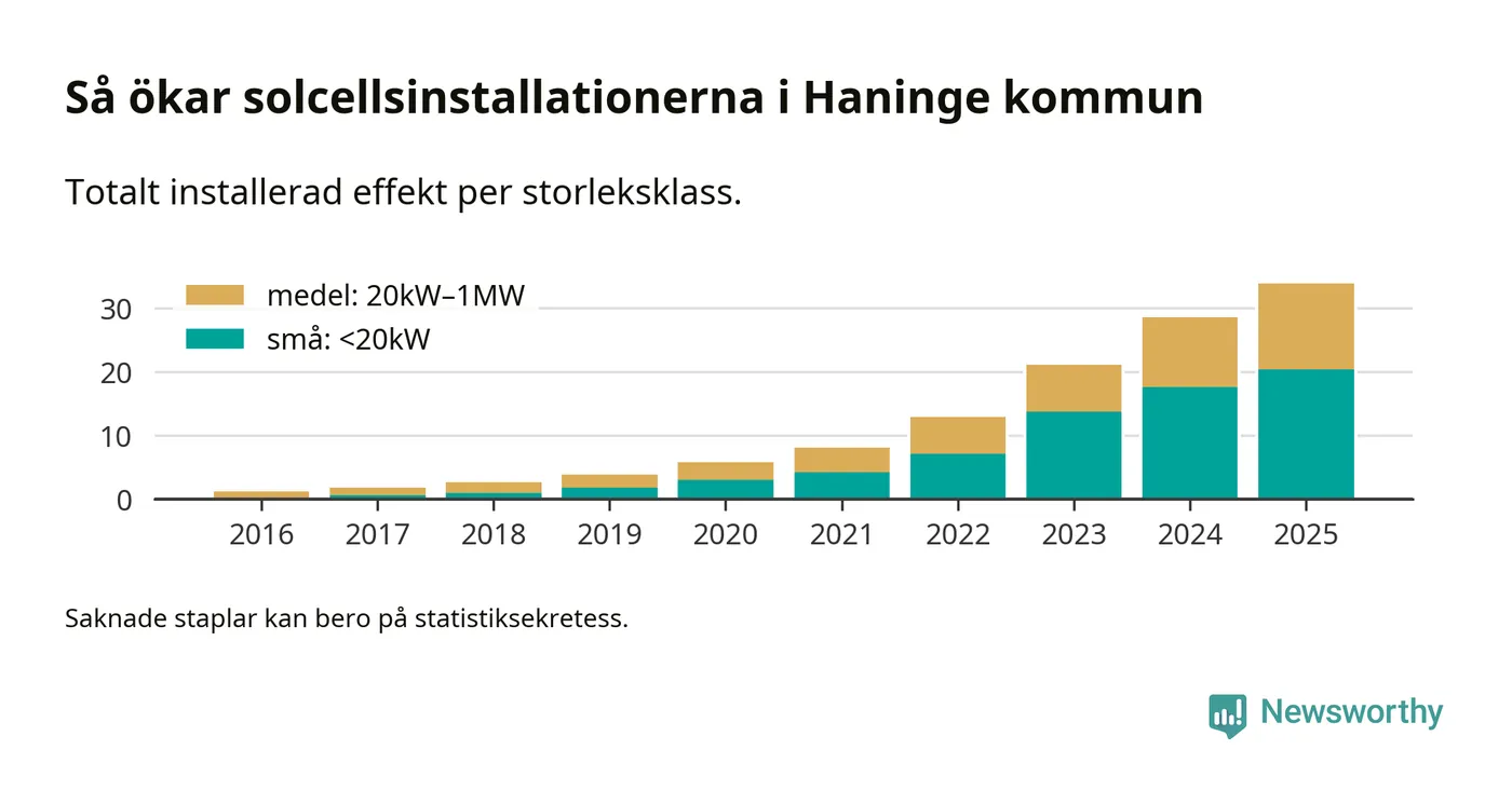 Under 2025 anslöts 5,3 megawatt ny solel till elnätet i Haninge kommun, en ökning med 18 procent jämfört med året innan.