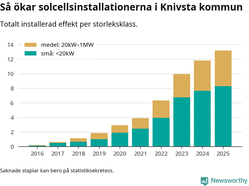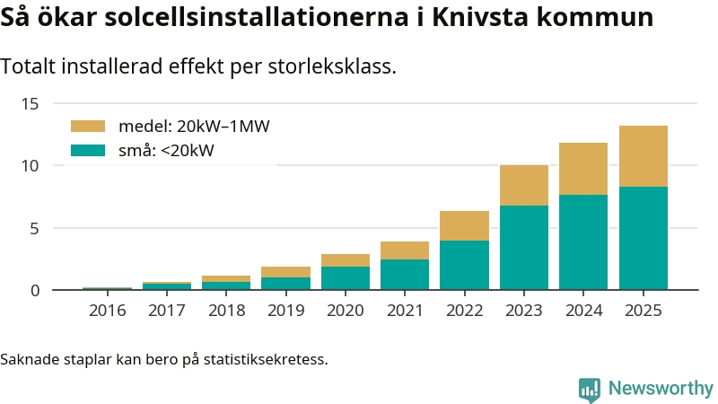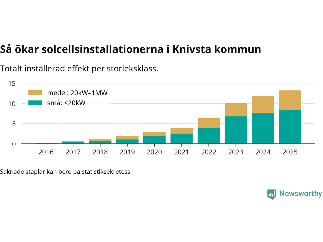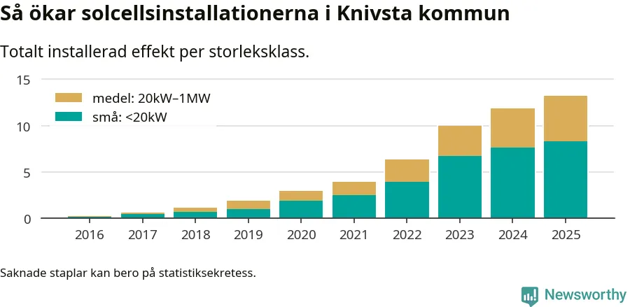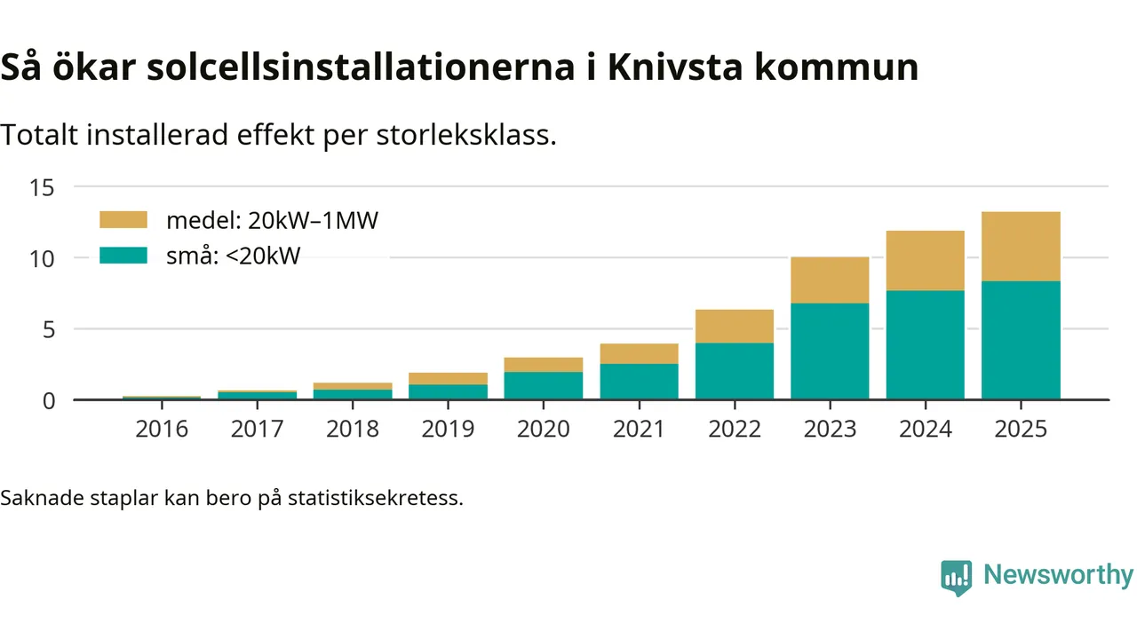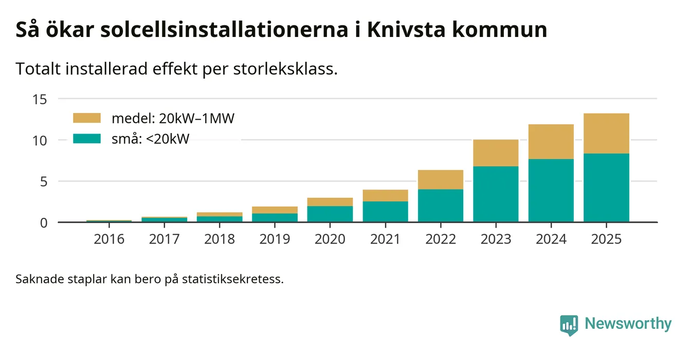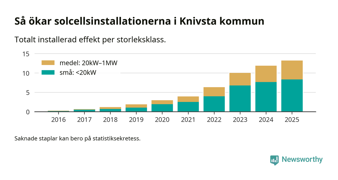 Under 2025 anslöts 1,3 megawatt ny solel till elnätet i Knivsta kommun, en ökning med 11 procent jämfört med året innan.