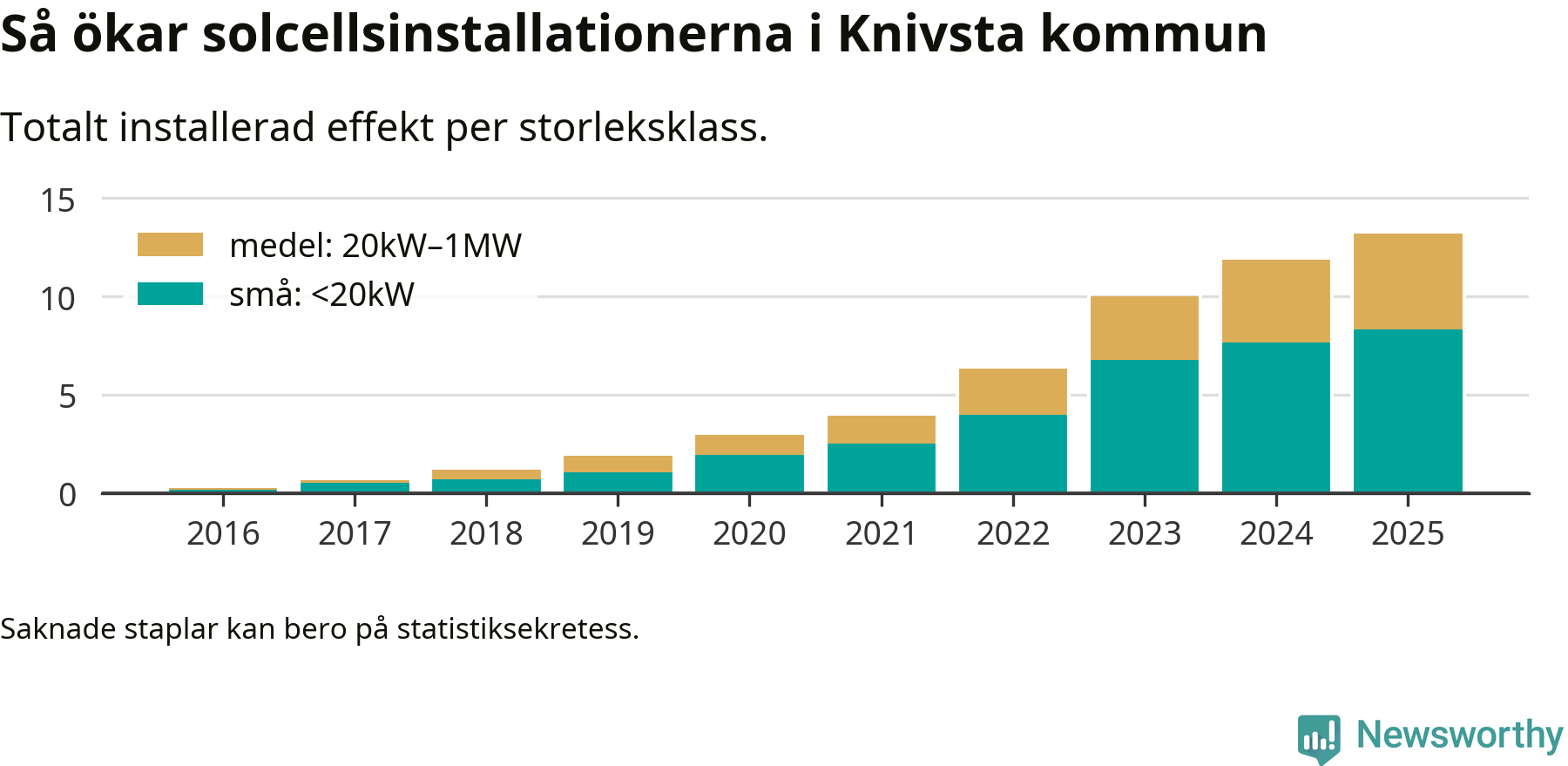 Totalt finns 863 nätanslutna anläggningar, om sammanlagt 13,2 megawatt i kommunen. Det motsvarar, i runda tal, en elproduktion på någonstans mellan 19 och 22 procent av vad hushållen i Knivsta förbrukar per år.1
