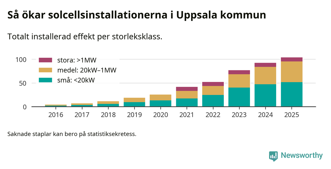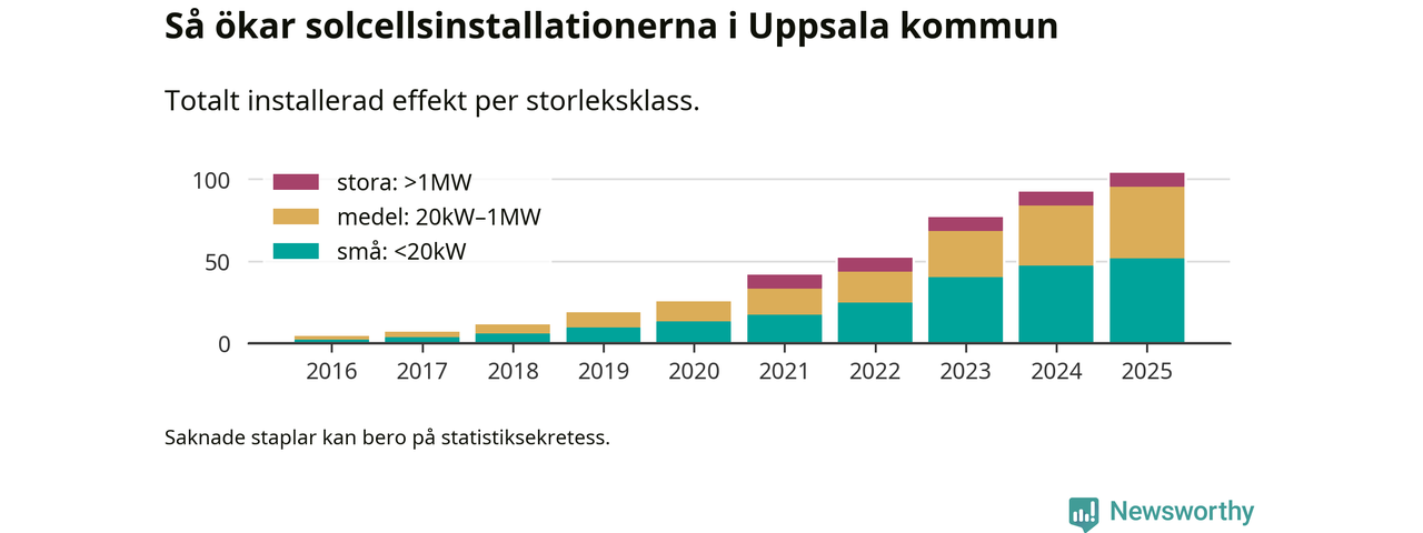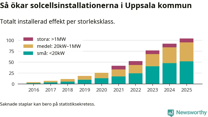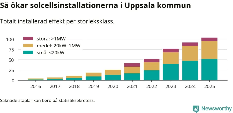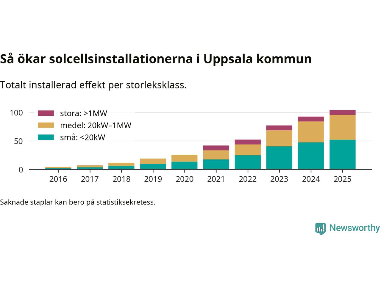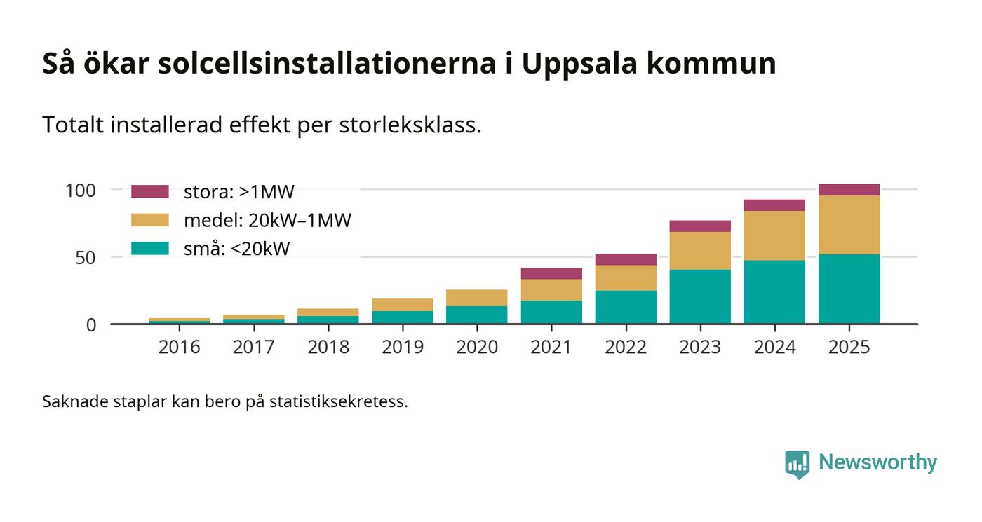 Under 2025 anslöts 11,6 megawatt ny solel till elnätet i Uppsala kommun, en ökning med 13 procent jämfört med året innan.