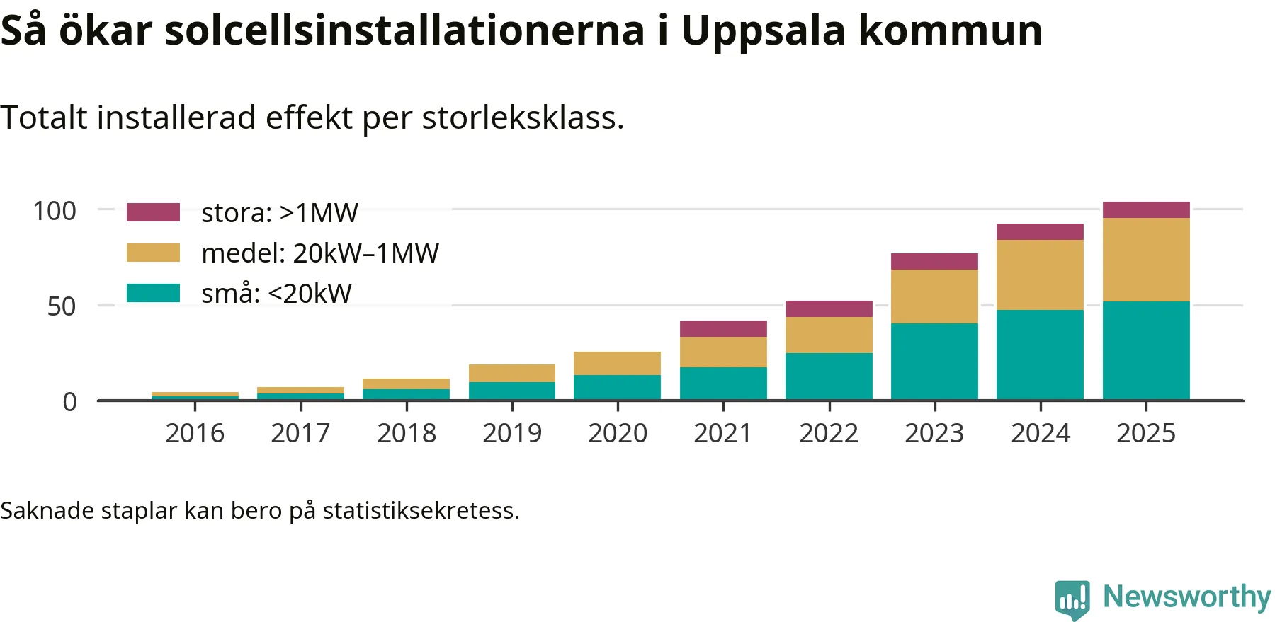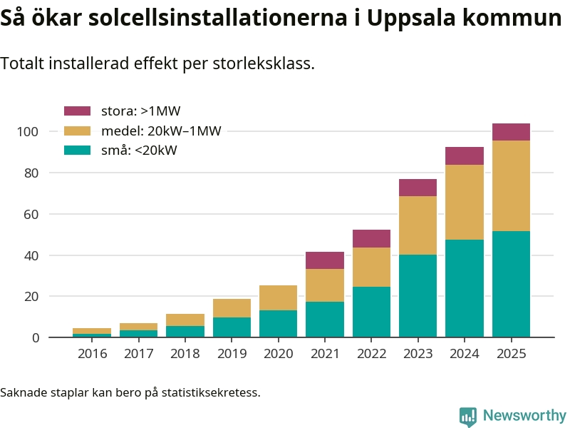 Det är framför allt de stora anläggningarna som driver tillväxten. Småskalig solel dominerar fortfarande produktionen – mer än hälften av effekten finns i anläggningar under 20 kilowatt – men det är bland de stora anläggningarna vi ser den största ökningstakten.
