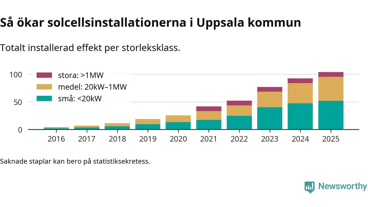 50 procent av solelen i Uppsala kommun kommer från småskaliga anläggningar, totalt 5 035 stycken. Det påminner om hur det ser ut i riket som helhet. I hela Sverige står anläggningar under 20 kilowatt för mer än hälften av den installerade effekten. Generellt är deras andel störst i kommuner med många villahushåll, medan större anläggningar dominerar i tätbefolkade kommuner med fler flerfamiljsbostäder – och förstås i de småkommuner som har någon av landets stora markanläggningar för solel.