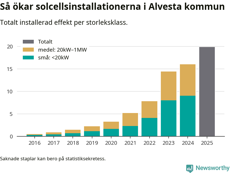 Det är framför allt de stora anläggningarna som driver tillväxten. Småskalig solel dominerar fortfarande produktionen – mer än hälften av effekten finns i anläggningar under 20 kilowatt – men det är bland de stora anläggningarna vi ser den största ökningstakten.