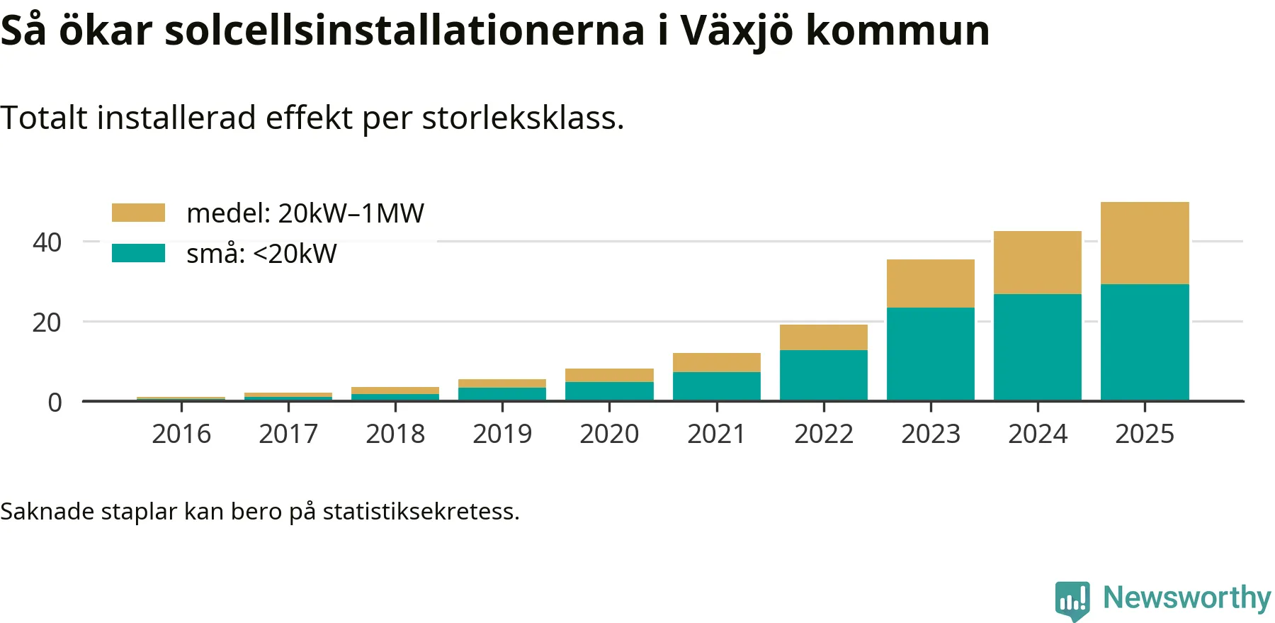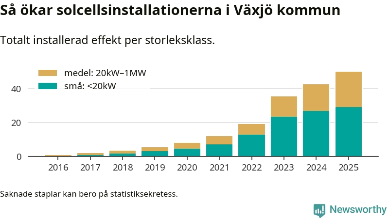 Det är framför allt de stora anläggningarna som driver tillväxten. Småskalig solel dominerar fortfarande produktionen – mer än hälften av effekten finns i anläggningar under 20 kilowatt – men det är bland de stora anläggningarna vi ser den största ökningstakten.