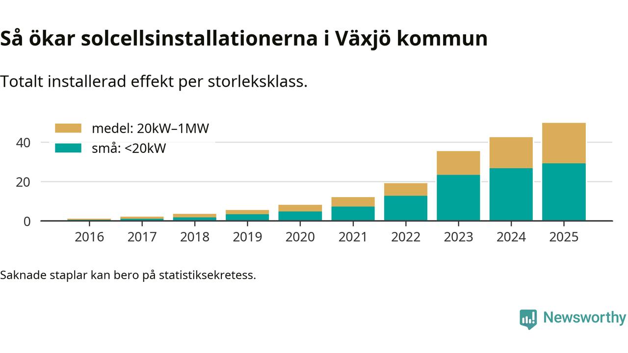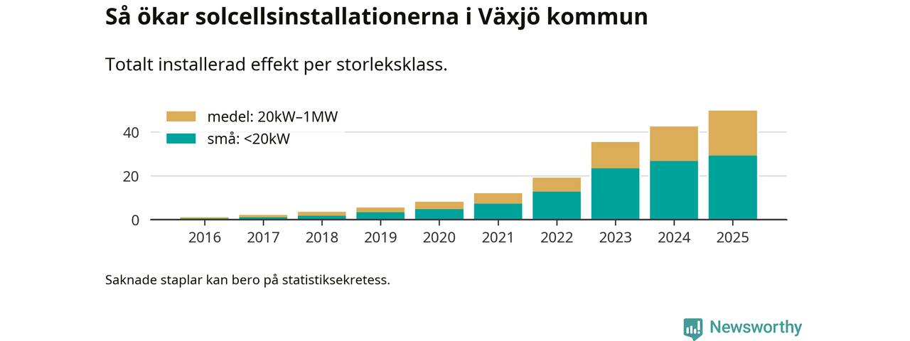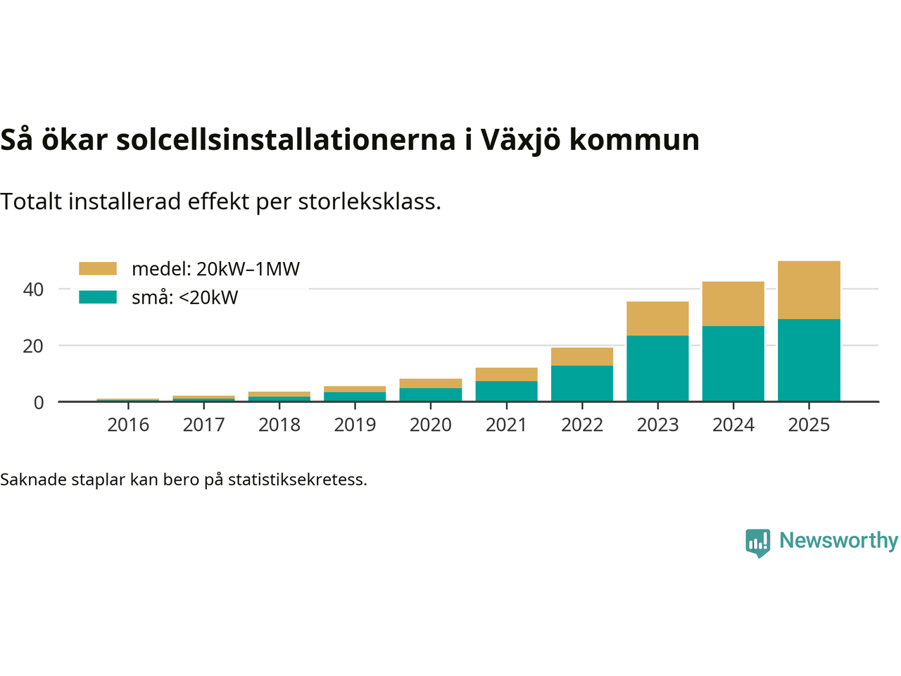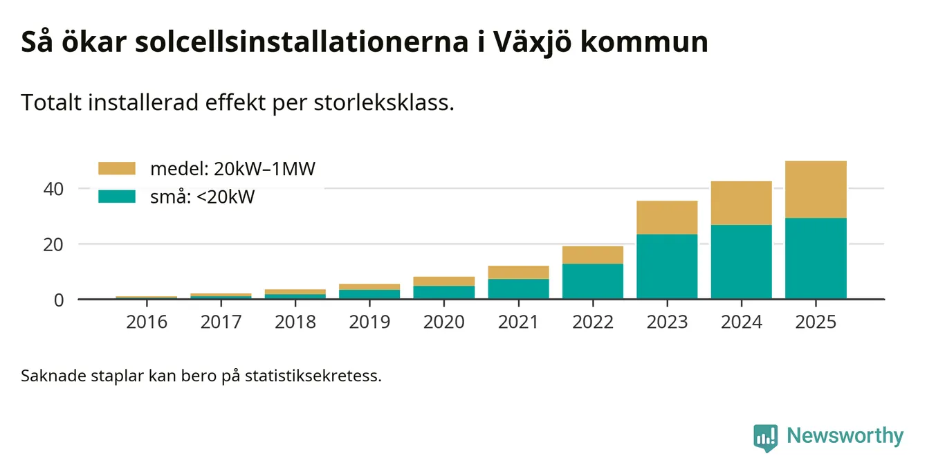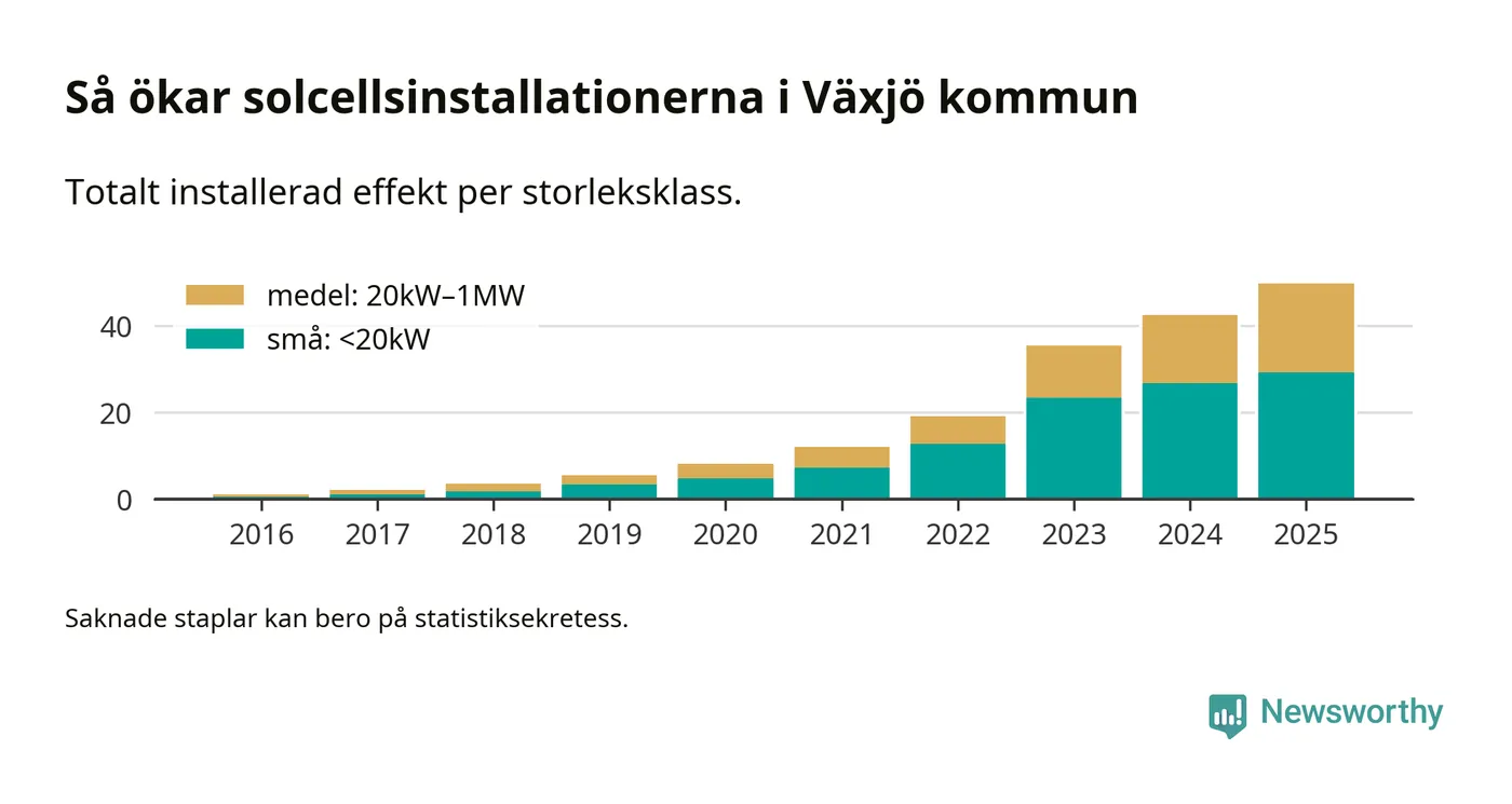 Under 2025 anslöts 7,2 megawatt ny solel till elnätet i Växjö kommun, en ökning med 17 procent jämfört med året innan.
