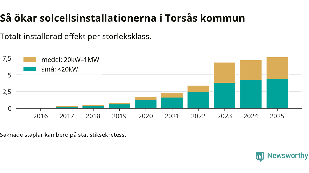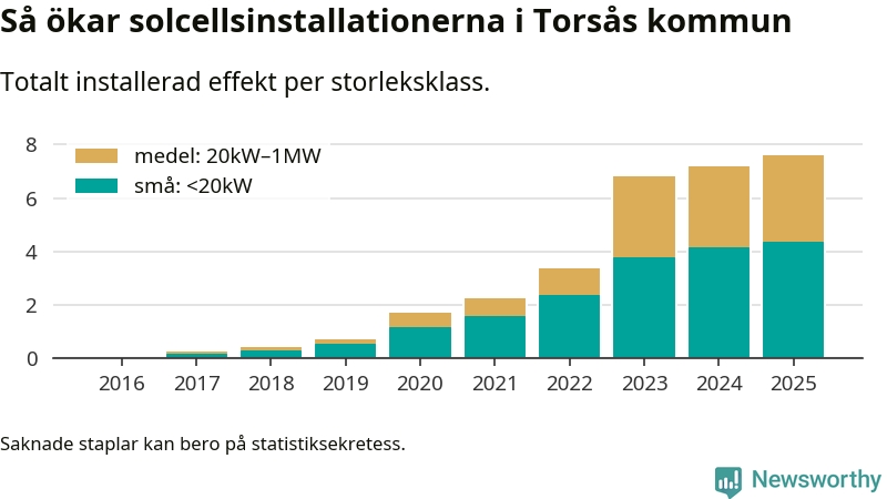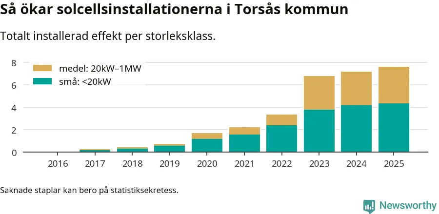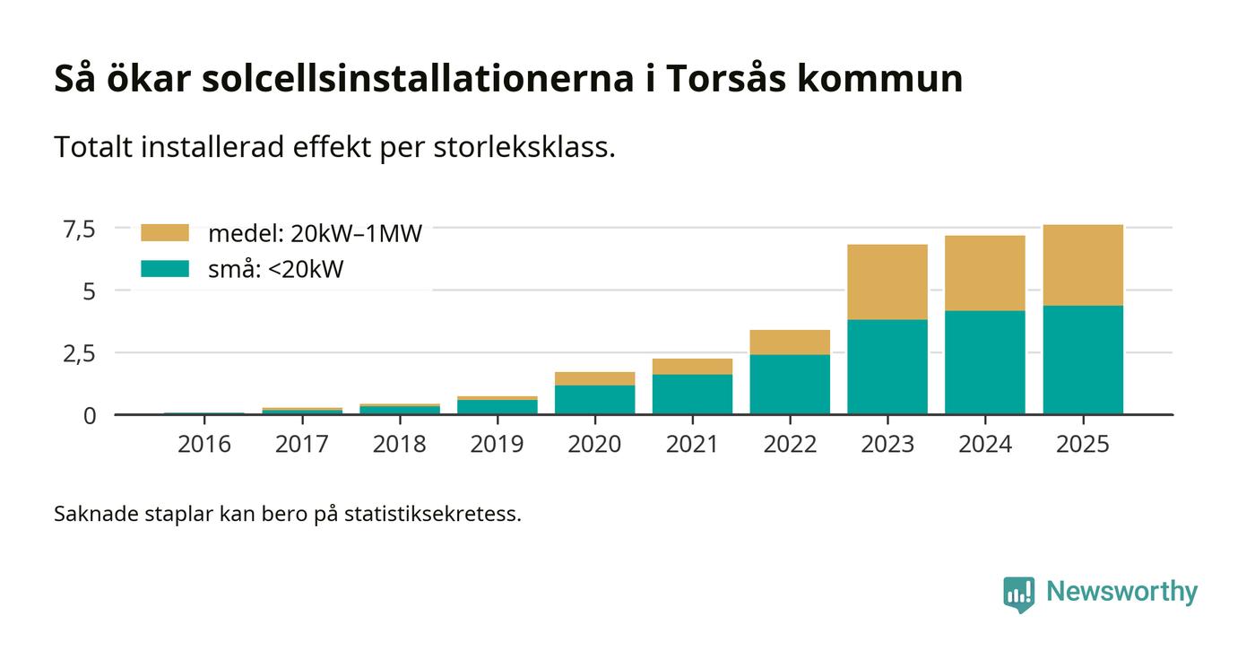 Den största delen av solelen i Torsås, 58 procent, kommer från småskaliga anläggningar, totalt 426 stycken. Det påminner om hur det ser ut i riket som helhet. I hela Sverige står anläggningar under 20 kilowatt för mer än hälften av den installerade effekten. Generellt är deras andel störst i kommuner med många villahushåll, medan större anläggningar dominerar i tätbefolkade kommuner med fler flerfamiljsbostäder – och förstås i de småkommuner som har någon av landets stora markanläggningar för solel.