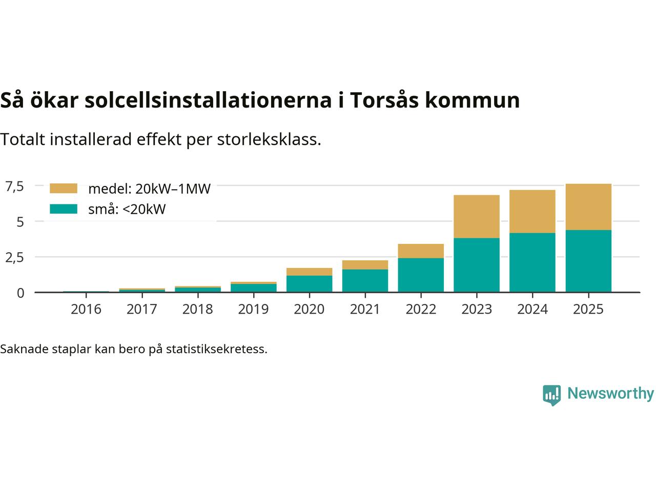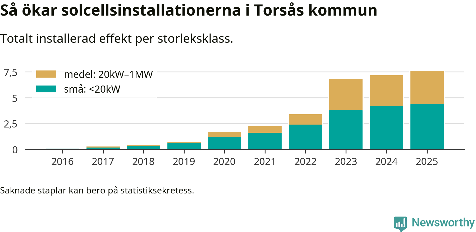Det är framför allt de stora anläggningarna som driver tillväxten. Småskalig solel dominerar fortfarande produktionen – mer än hälften av effekten finns i anläggningar under 20 kilowatt – men det är bland de stora anläggningarna vi ser den största ökningstakten.