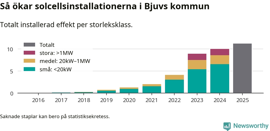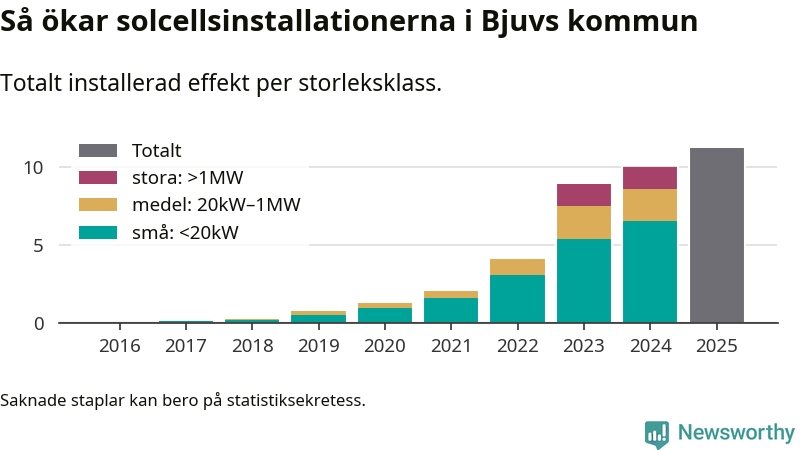 Totalt finns 706 nätanslutna anläggningar, om sammanlagt 11,2 megawatt i kommunen. Det motsvarar, i runda tal, en elproduktion på någonstans mellan 19 och 20 procent av vad hushållen i Bjuv förbrukar per år.1