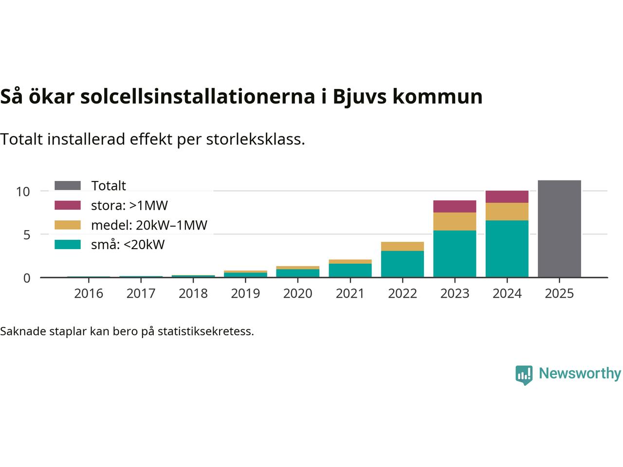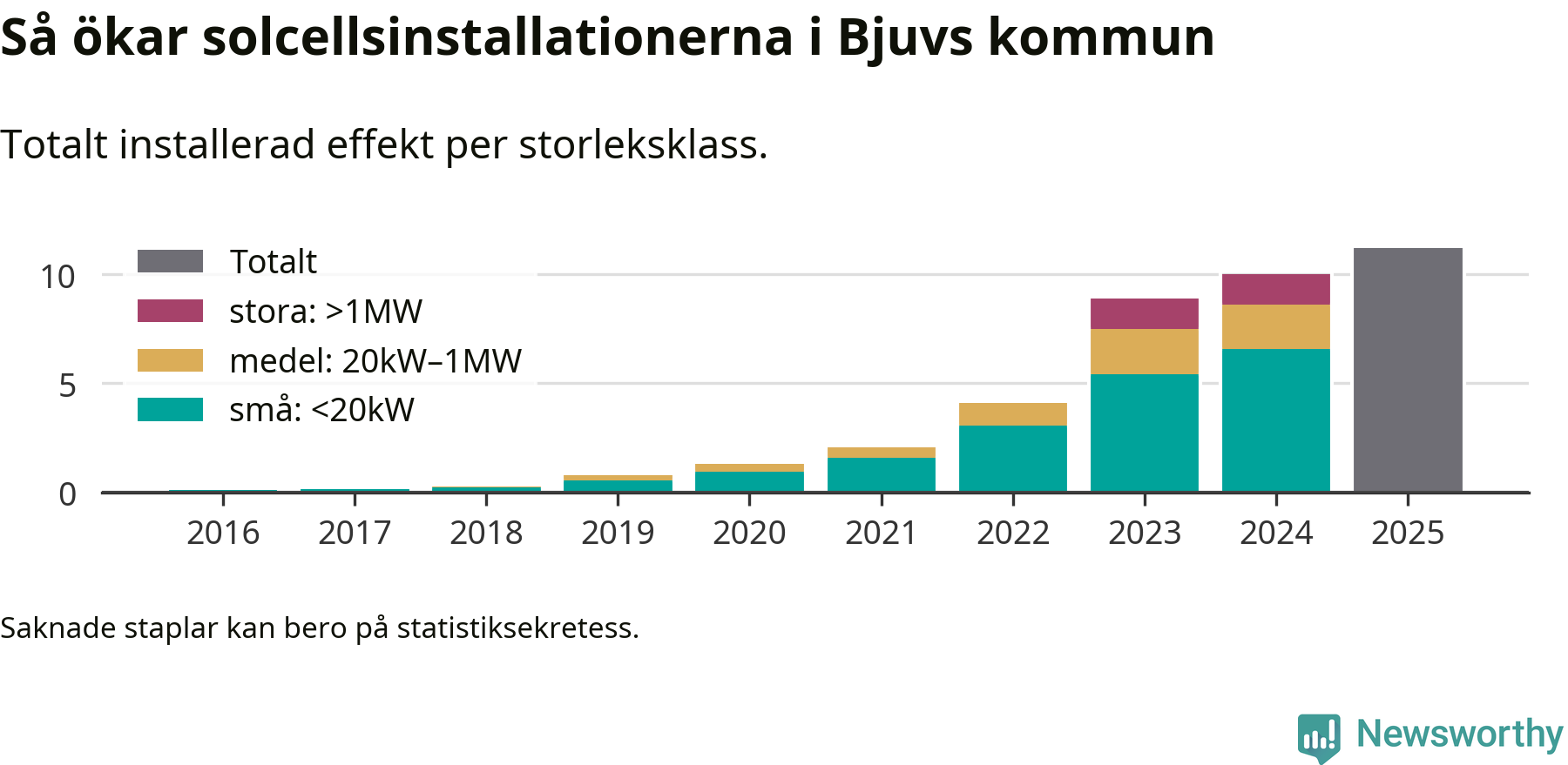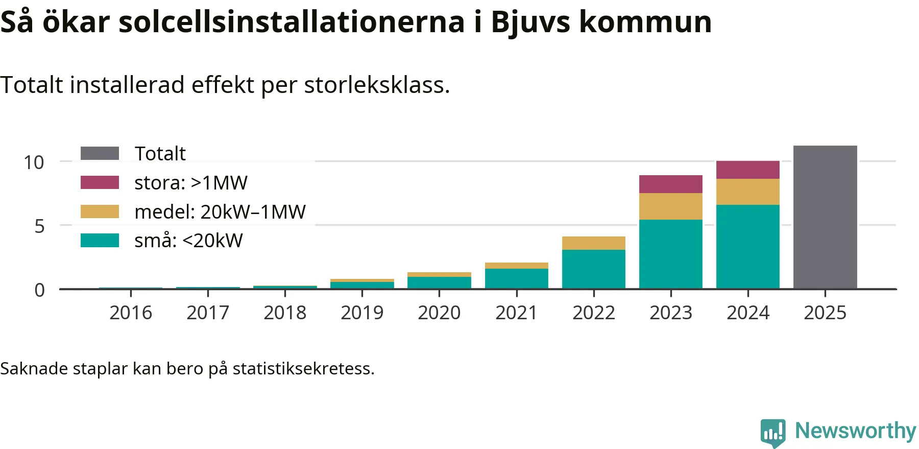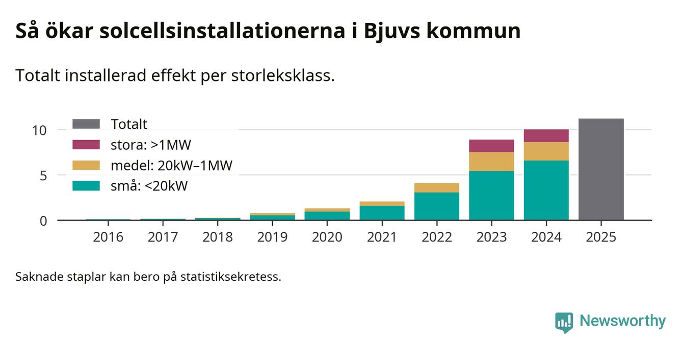 Det är framför allt de stora anläggningarna som driver tillväxten. Småskalig solel dominerar fortfarande produktionen – mer än hälften av effekten finns i anläggningar under 20 kilowatt – men det är bland de stora anläggningarna vi ser den största ökningstakten.