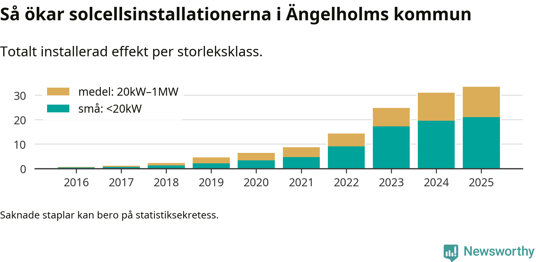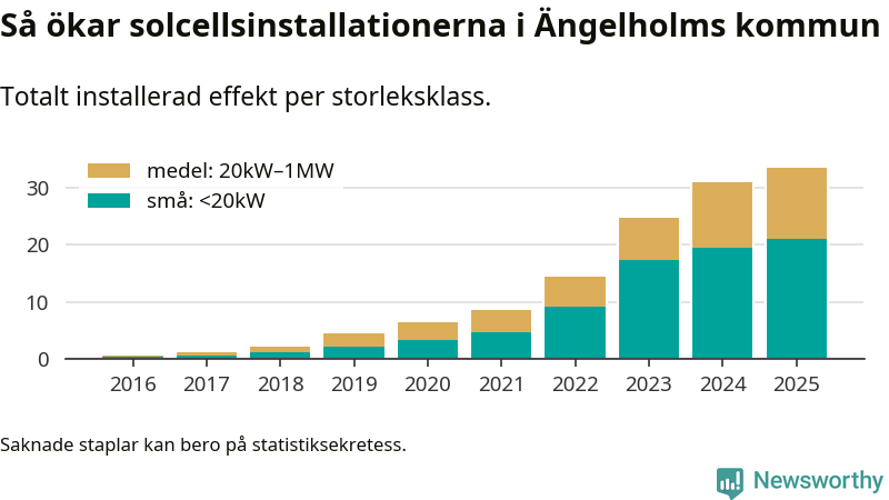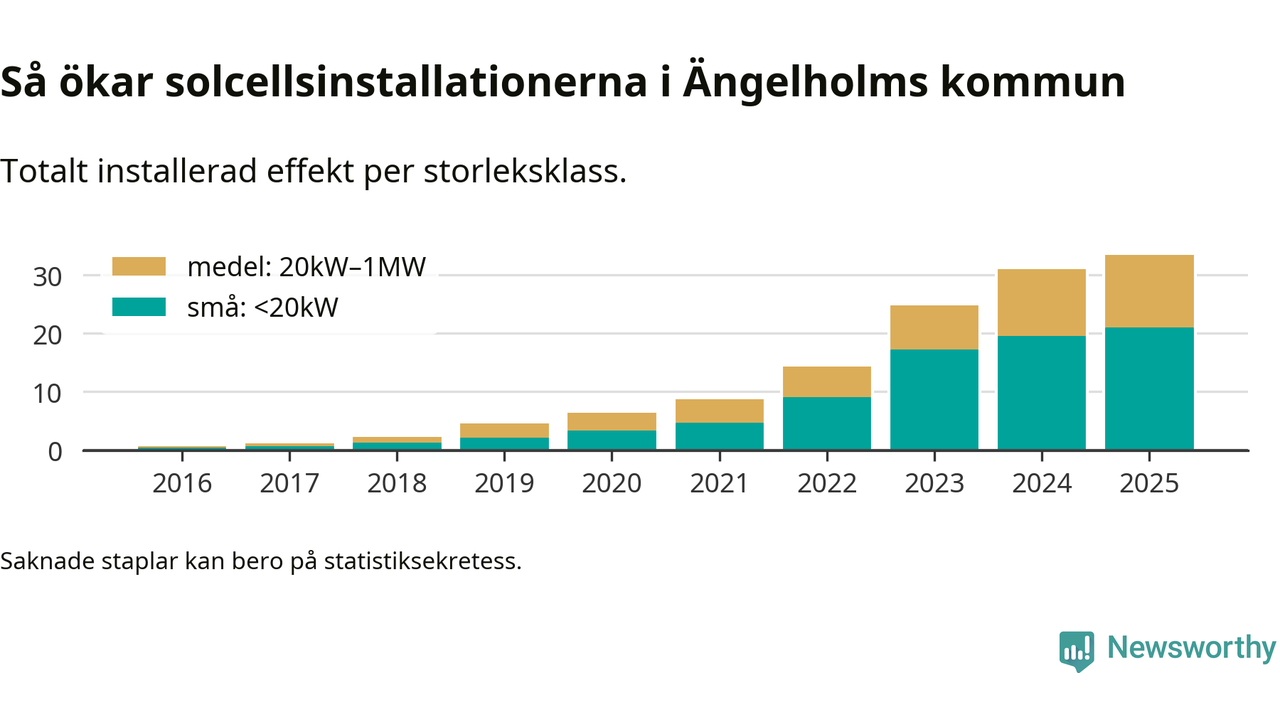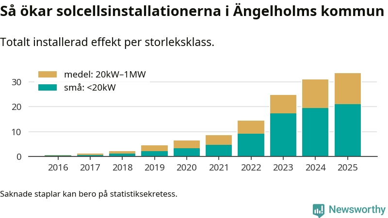 Det är framför allt de stora anläggningarna som driver tillväxten. Småskalig solel dominerar fortfarande produktionen – mer än hälften av effekten finns i anläggningar under 20 kilowatt – men det är bland de stora anläggningarna vi ser den största ökningstakten.
