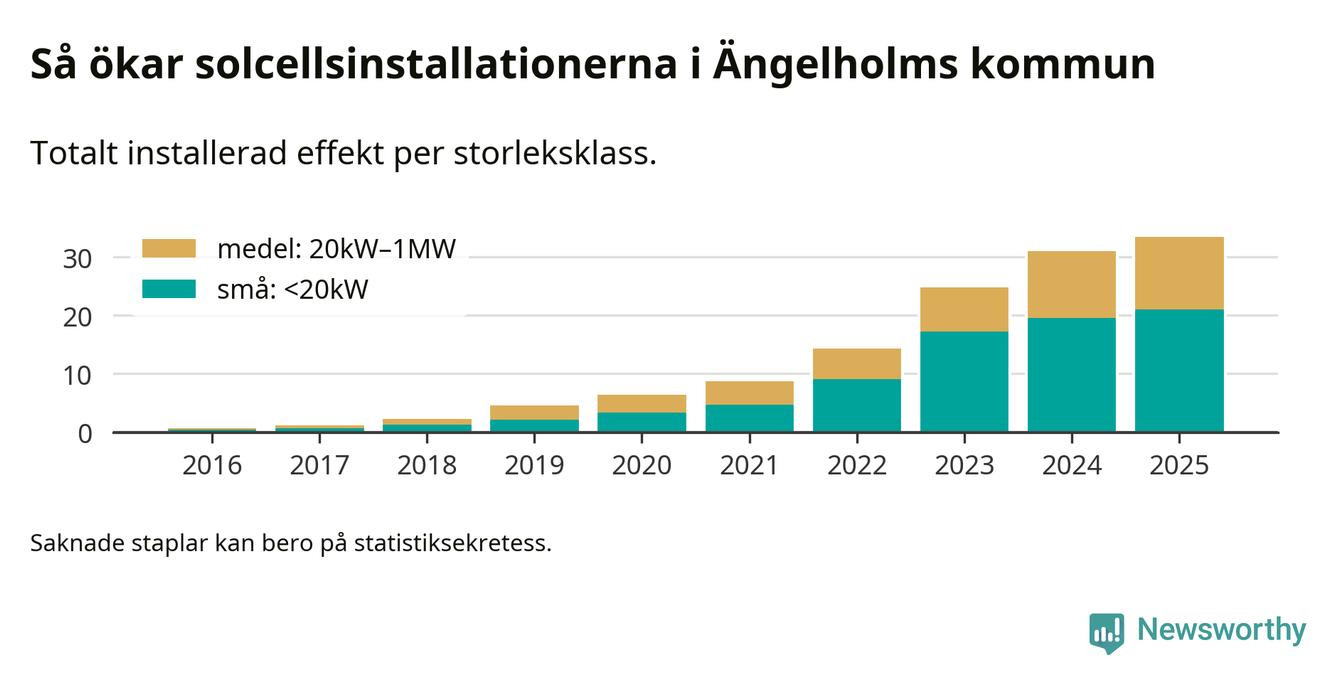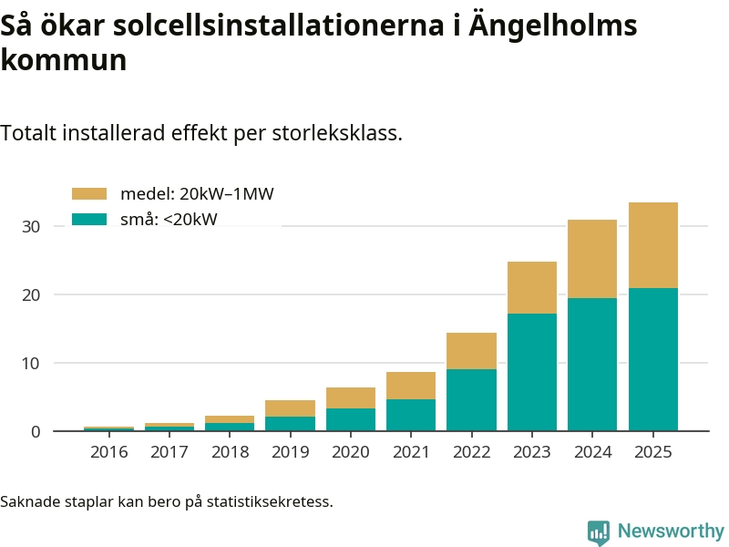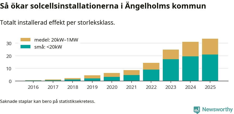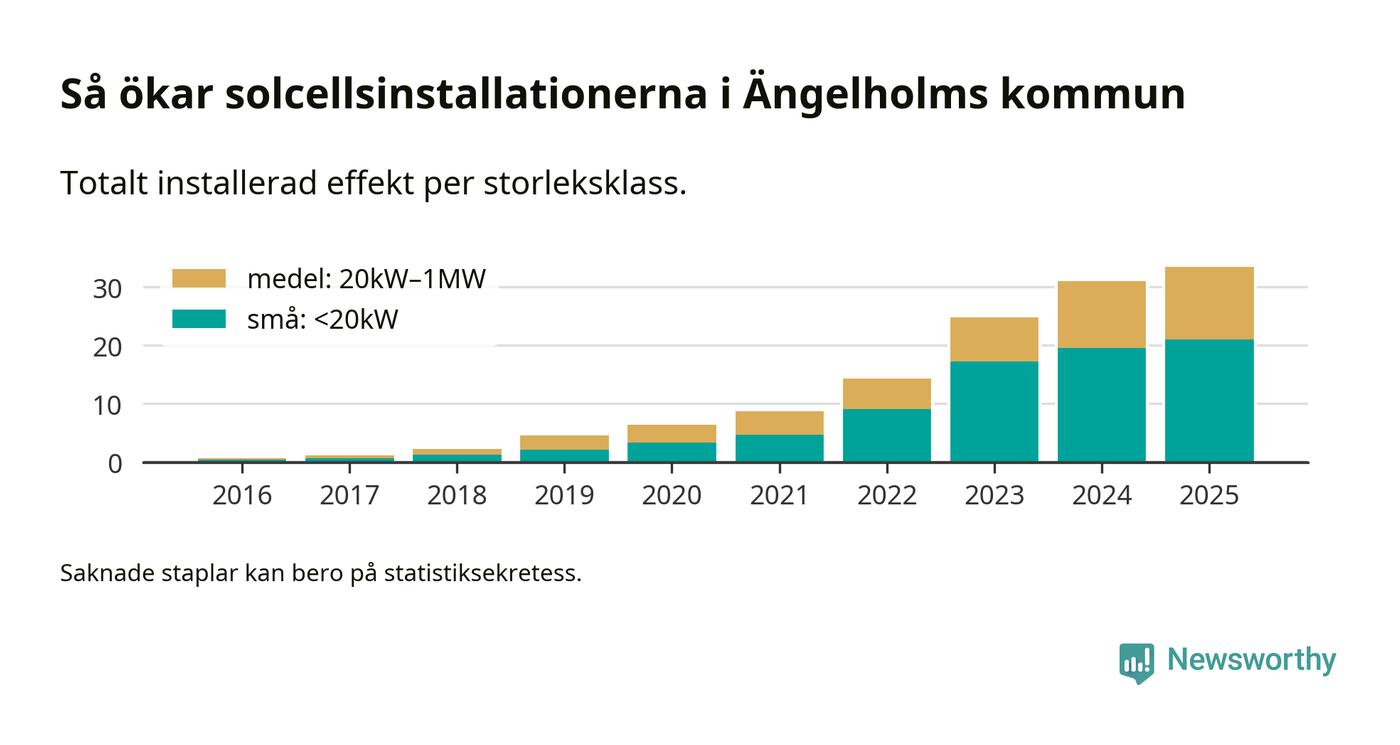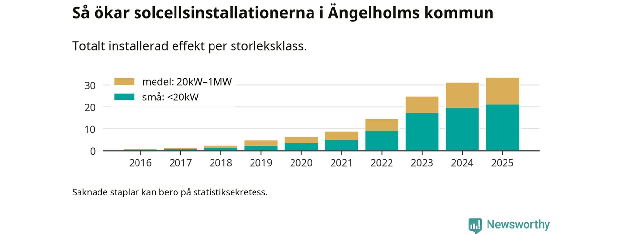 Under 2025 anslöts 2,4 megawatt ny solel till elnätet i Ängelholms kommun, en ökning med 8 procent jämfört med året innan.