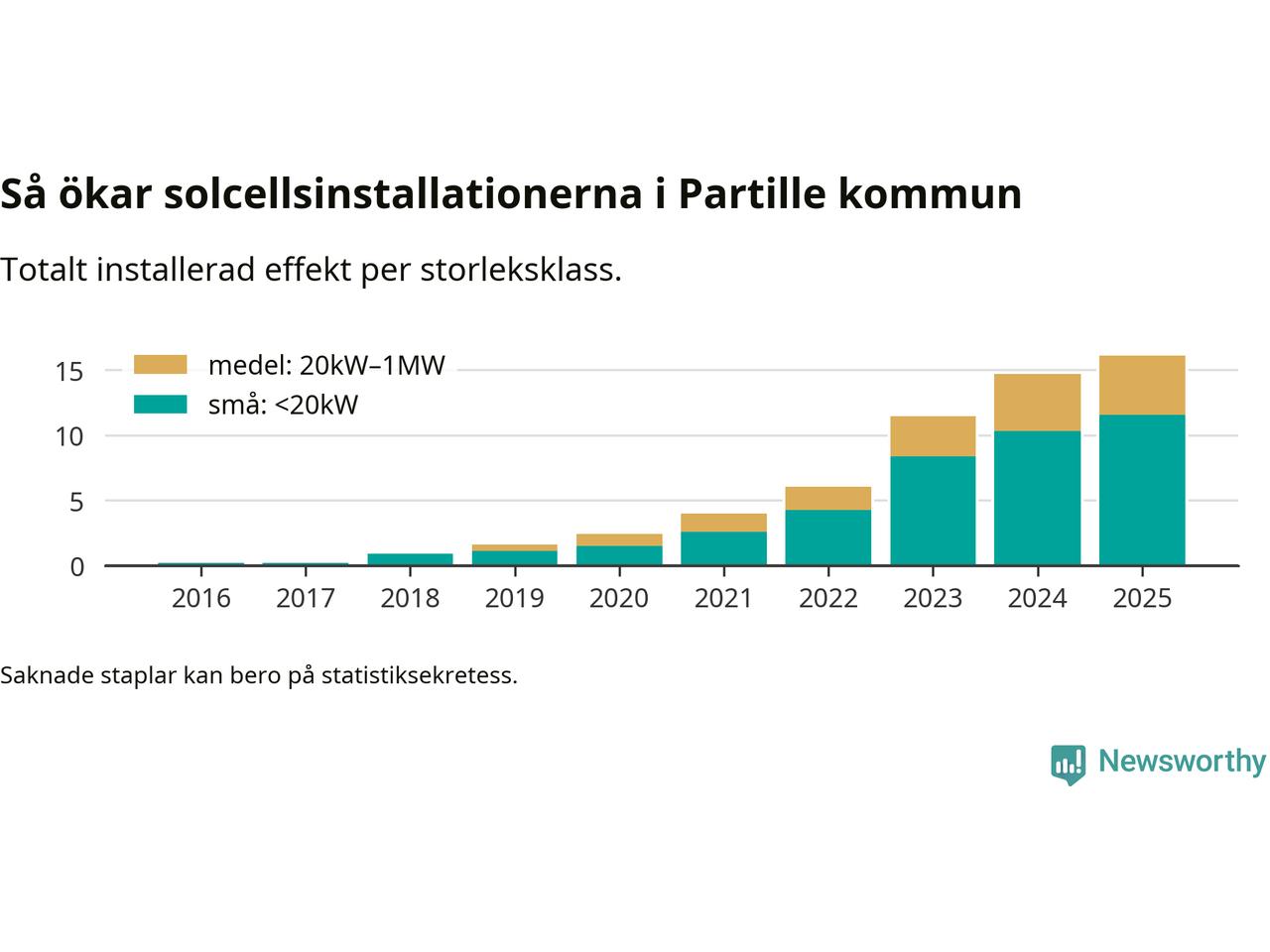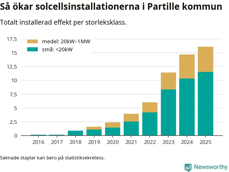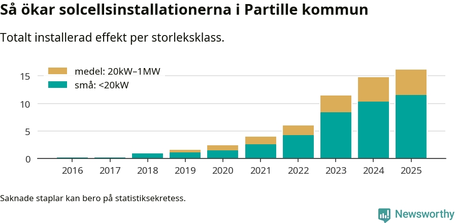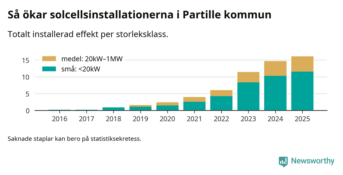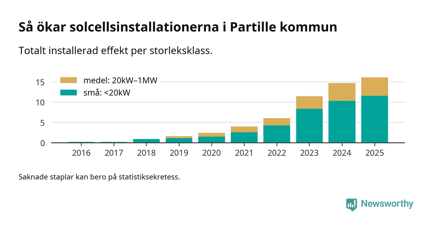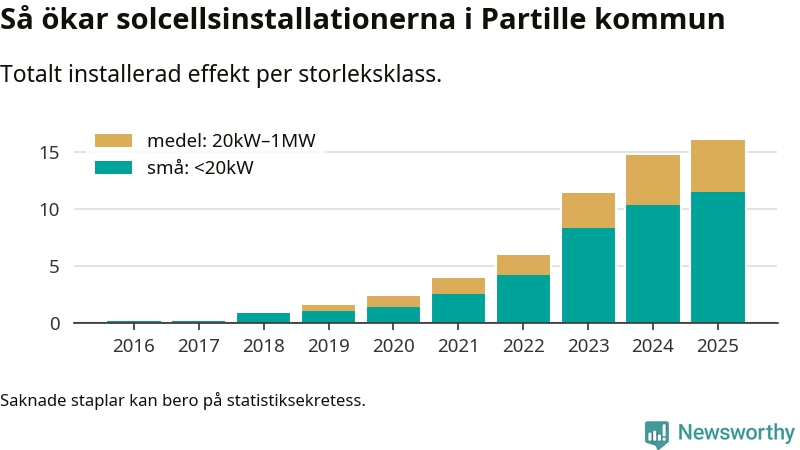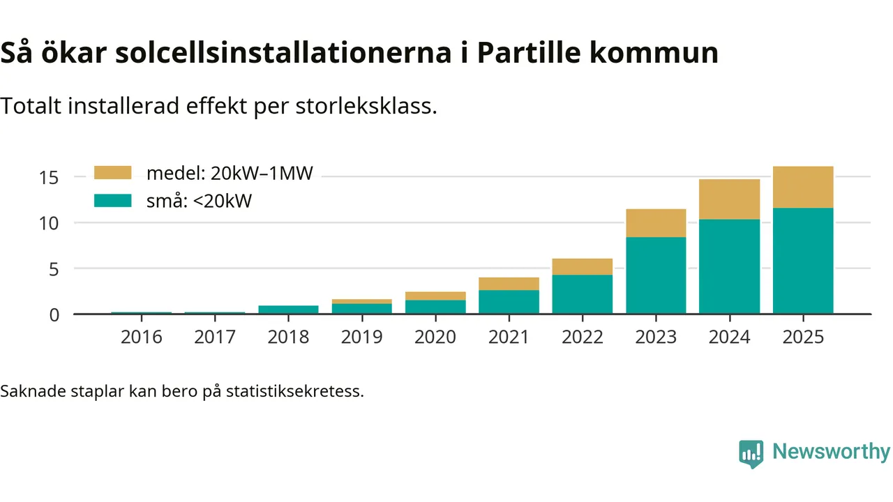 Under 2025 anslöts 1,4 megawatt ny solel till elnätet i Partille kommun, en ökning med 9 procent jämfört med året innan.