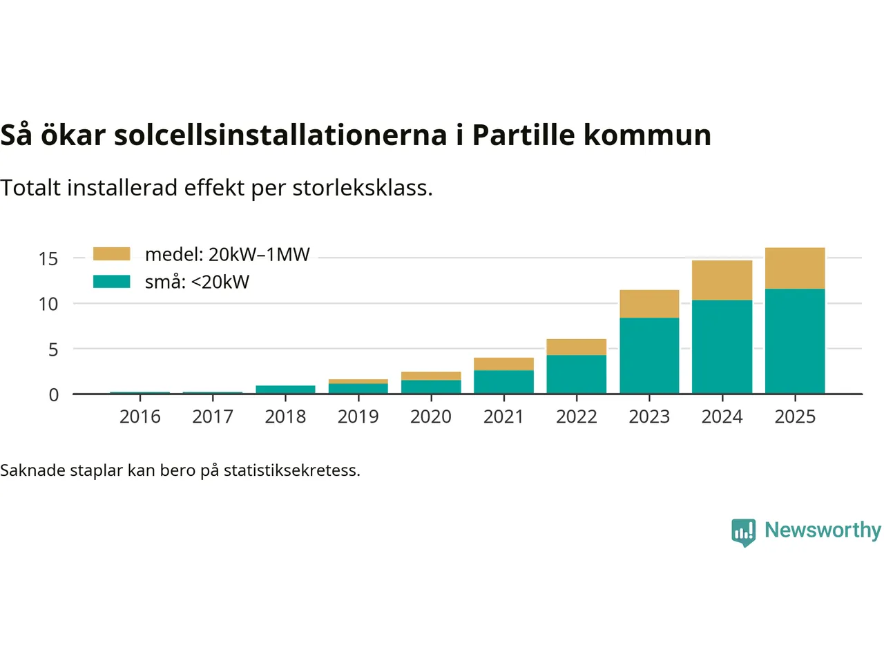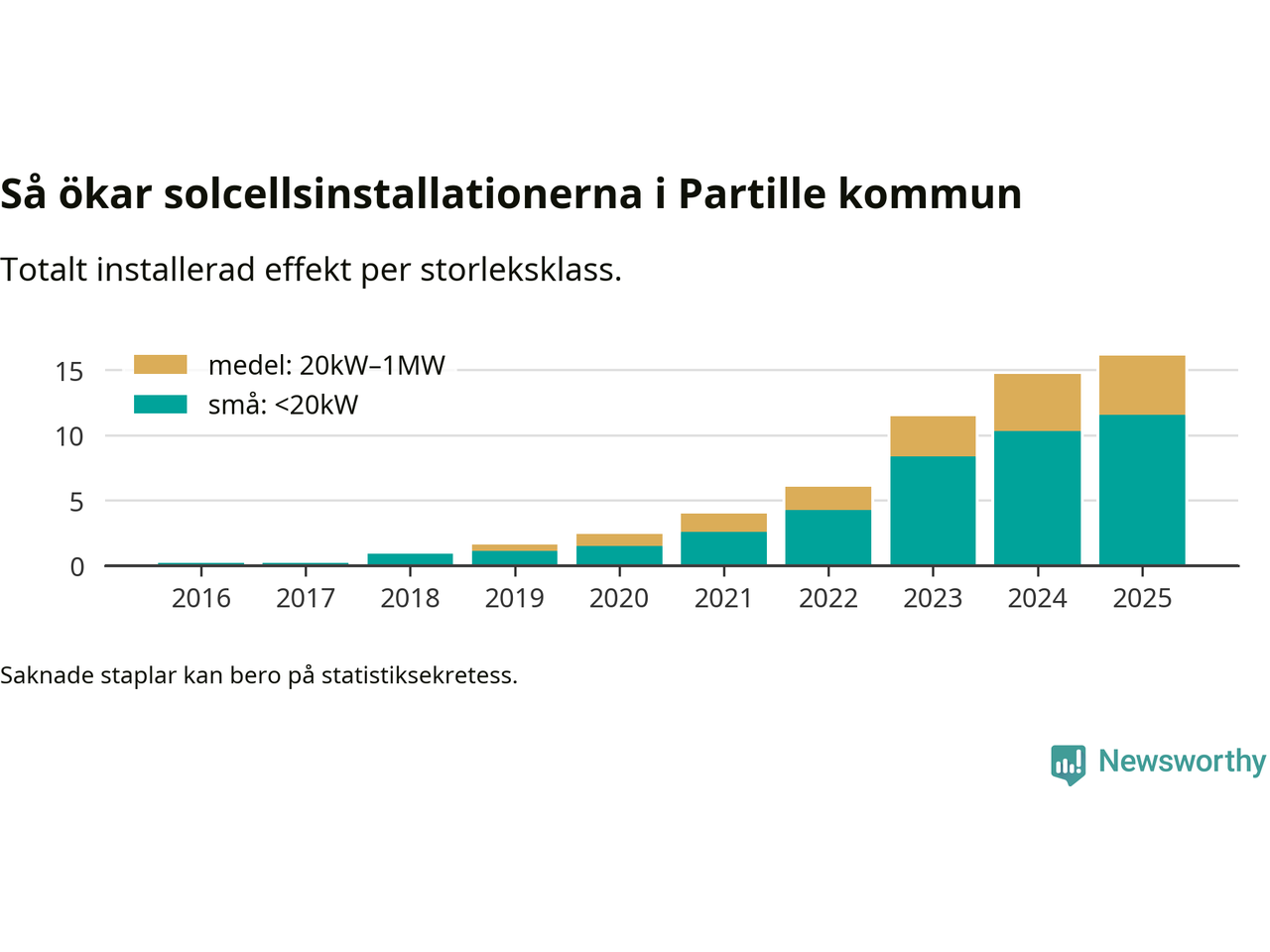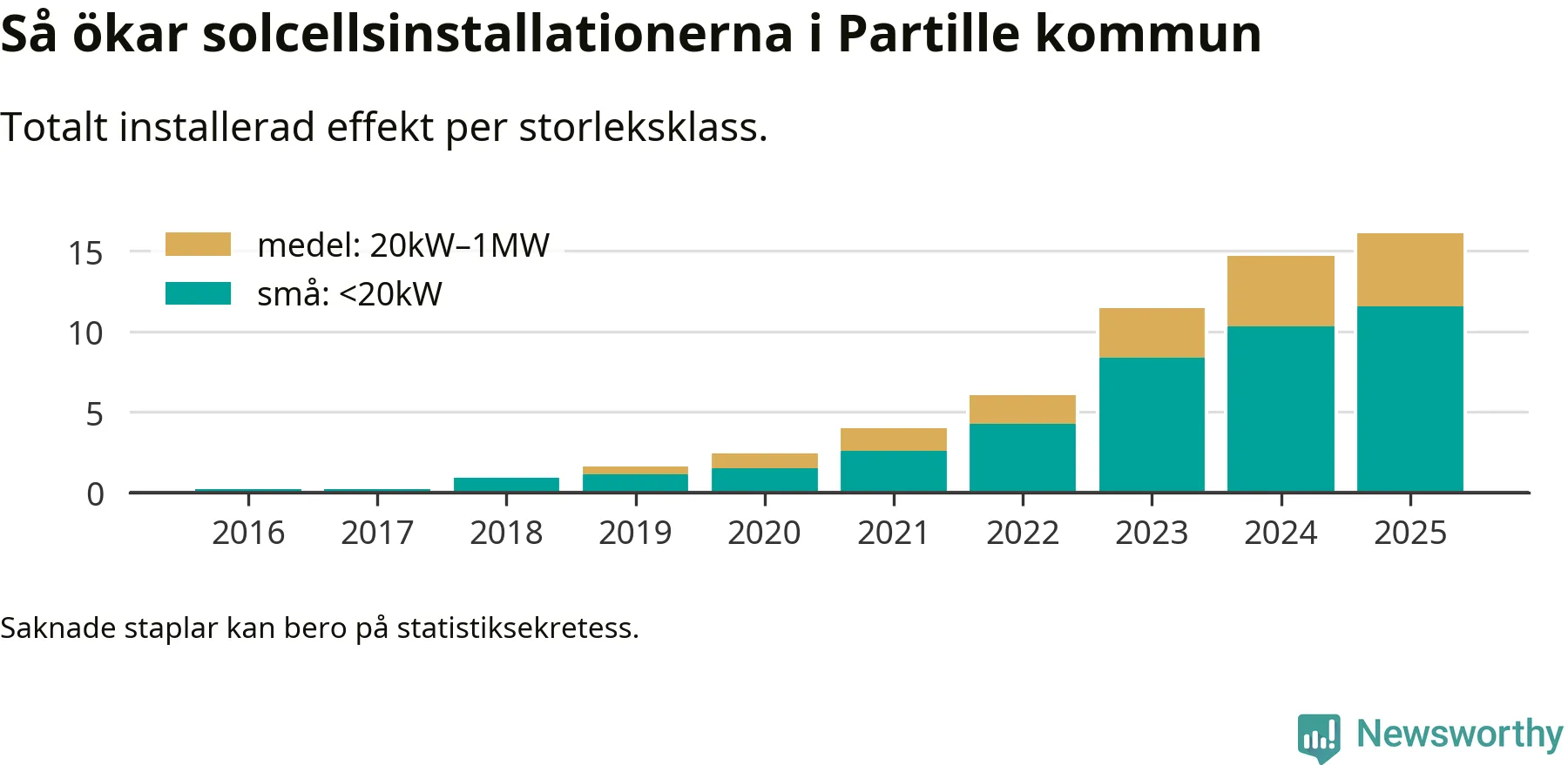 Det är framför allt de stora anläggningarna som driver tillväxten. Småskalig solel dominerar fortfarande produktionen – mer än hälften av effekten finns i anläggningar under 20 kilowatt – men det är bland de stora anläggningarna vi ser den största ökningstakten.