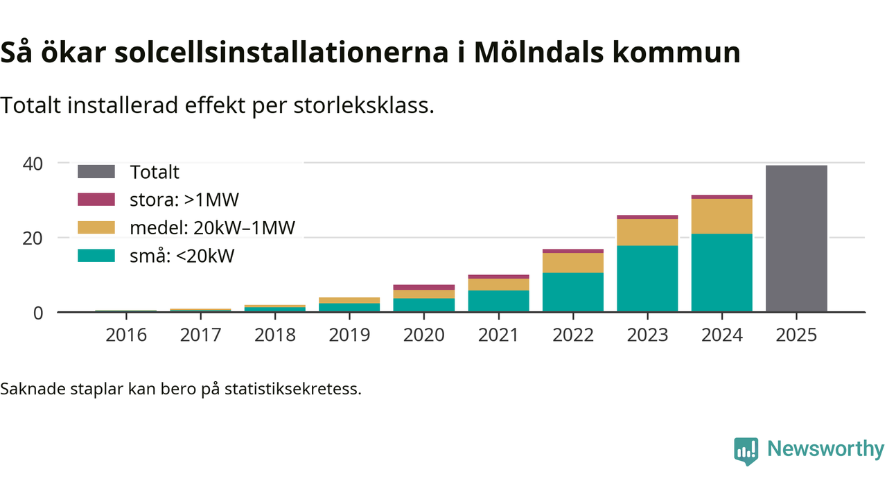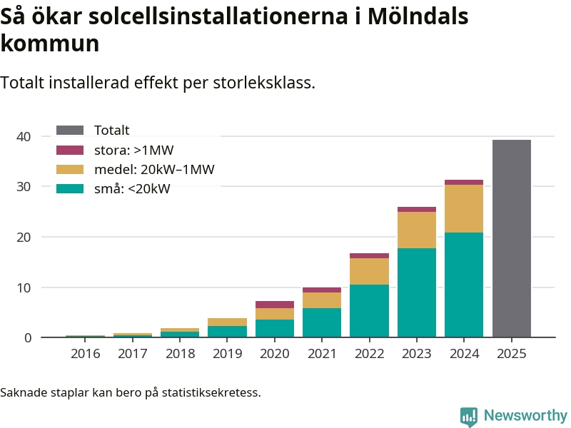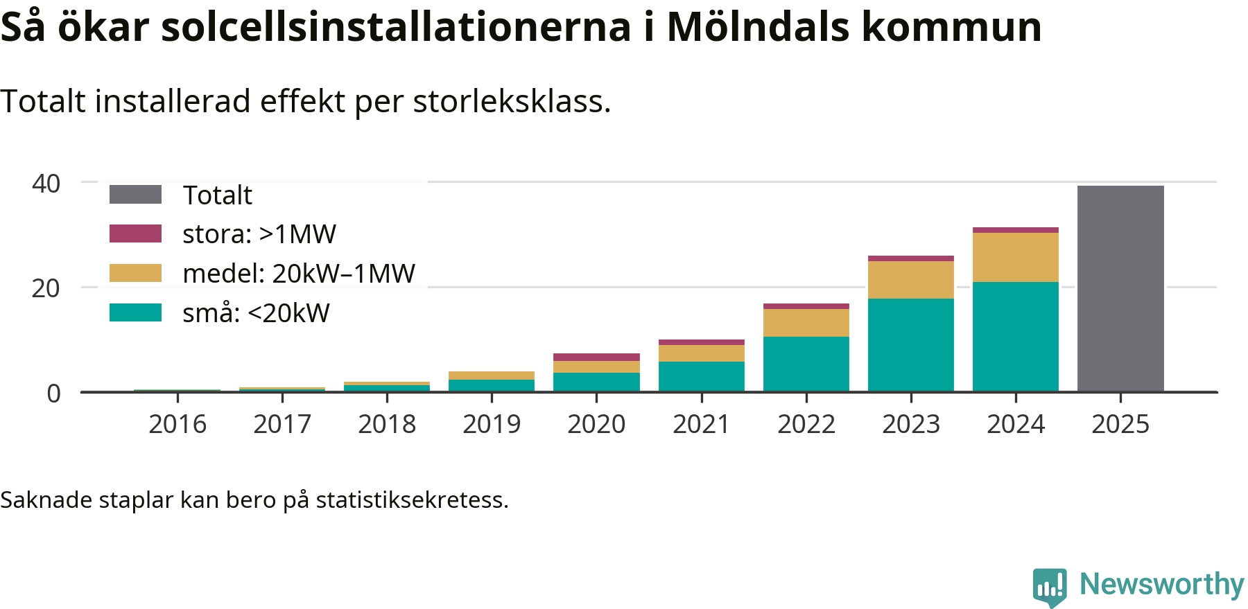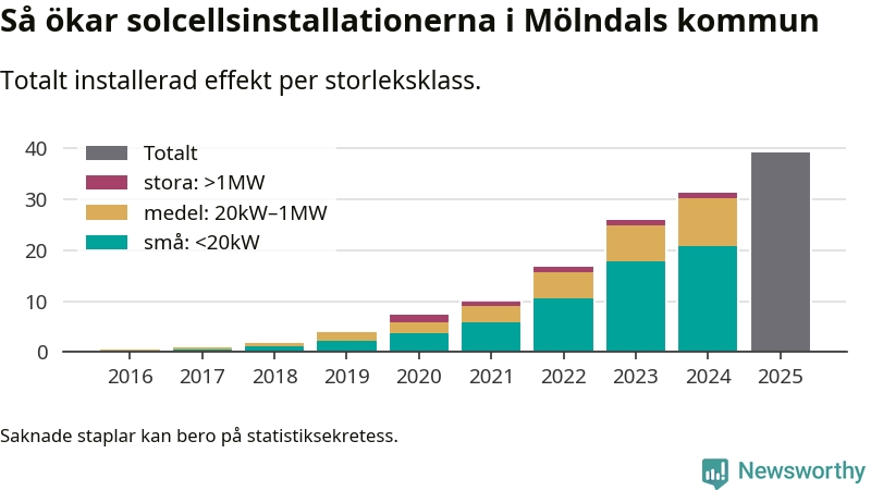 Totalt finns 2 262 nätanslutna anläggningar, om sammanlagt 39,2 megawatt i kommunen. Det motsvarar, i runda tal, en elproduktion på någonstans mellan 18 och 21 procent av vad hushållen i Mölndal förbrukar per år.1