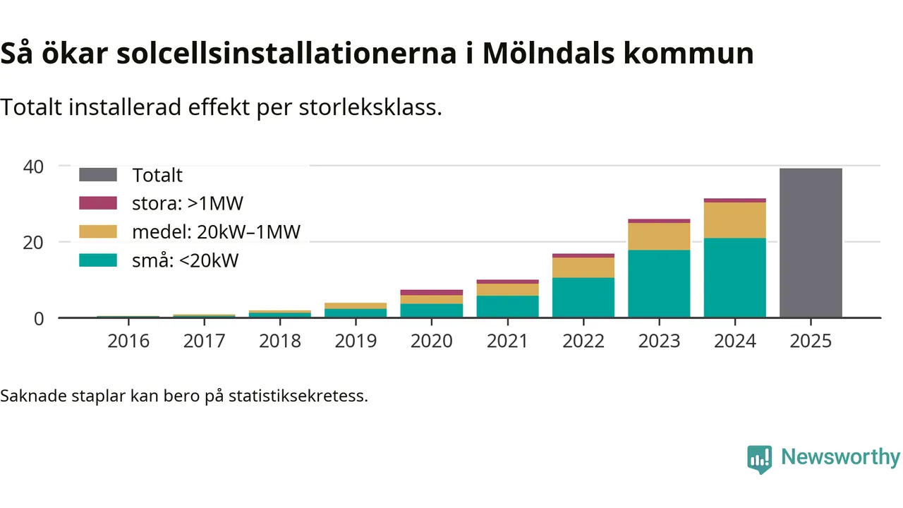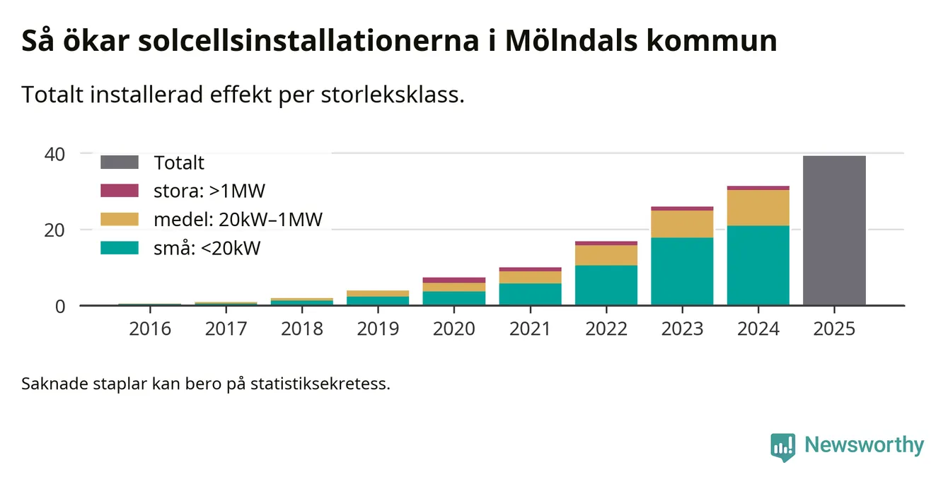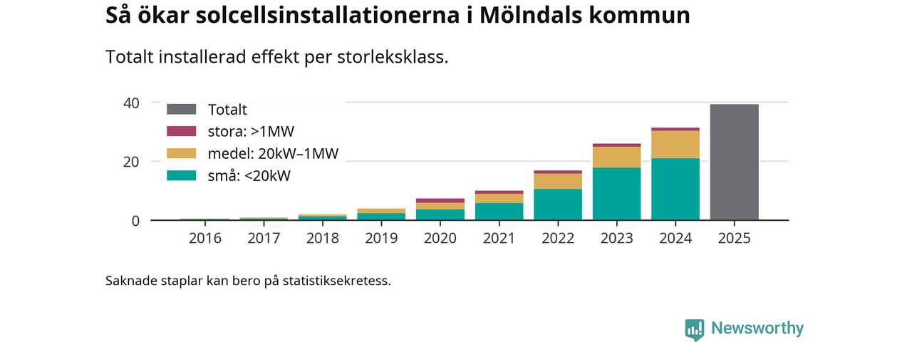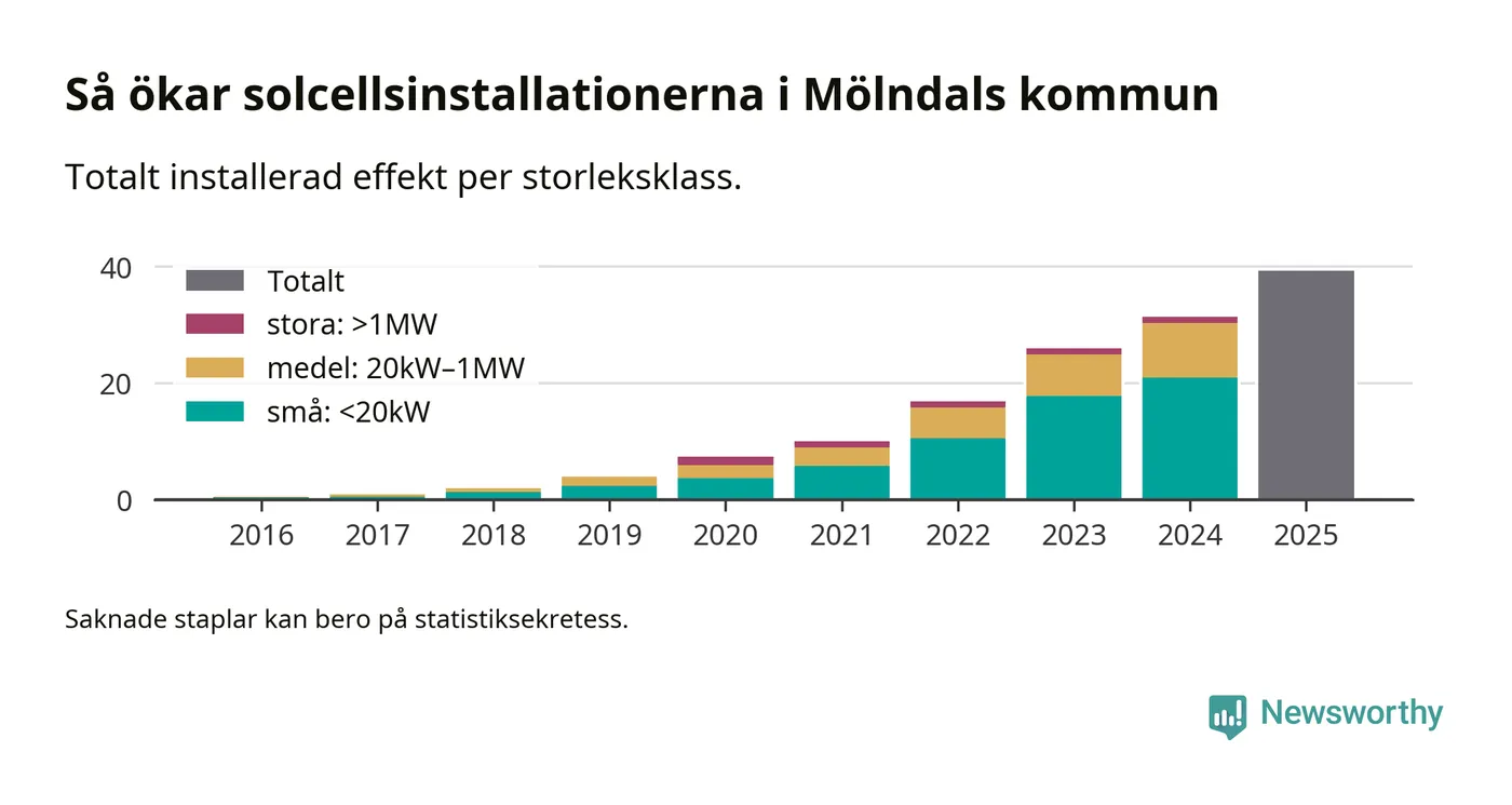 Under 2025 anslöts 7,9 megawatt ny solel till elnätet i Mölndals kommun, en ökning med 25 procent jämfört med året innan.