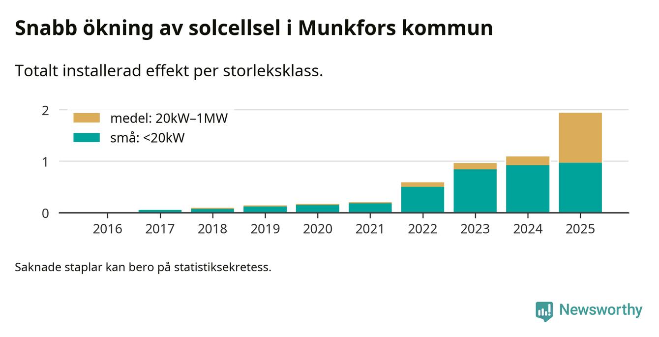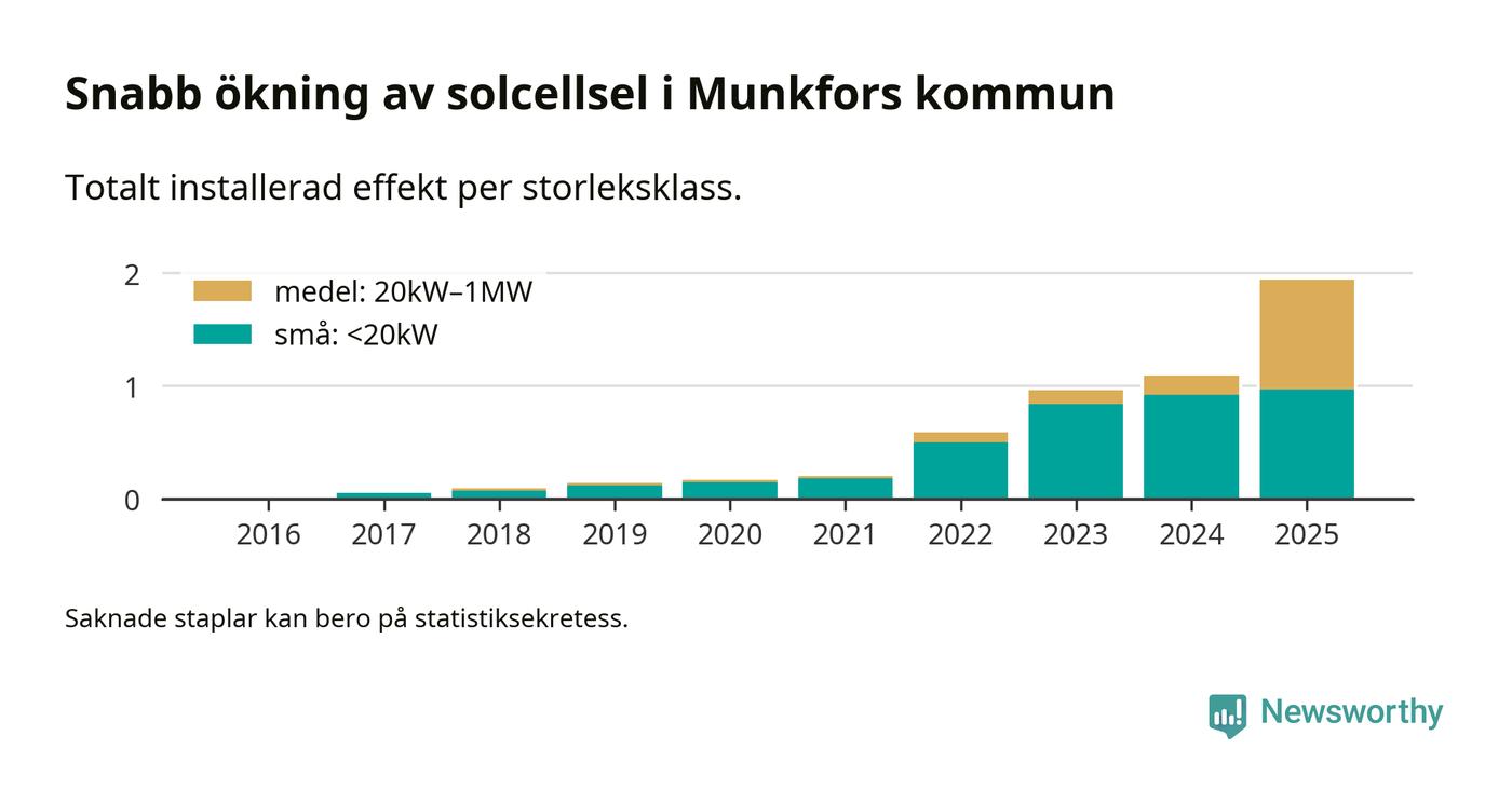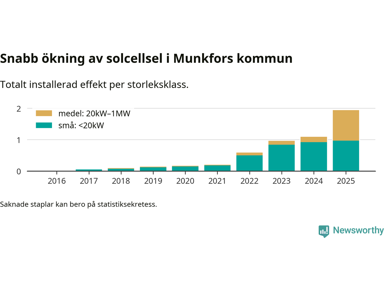 Under 2025 anslöts 0,8 megawatt ny solel till elnätet i Munkfors kommun, en ökning med 77 procent jämfört med året innan.