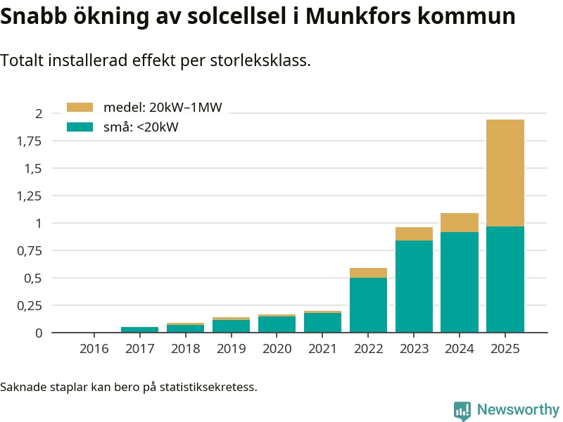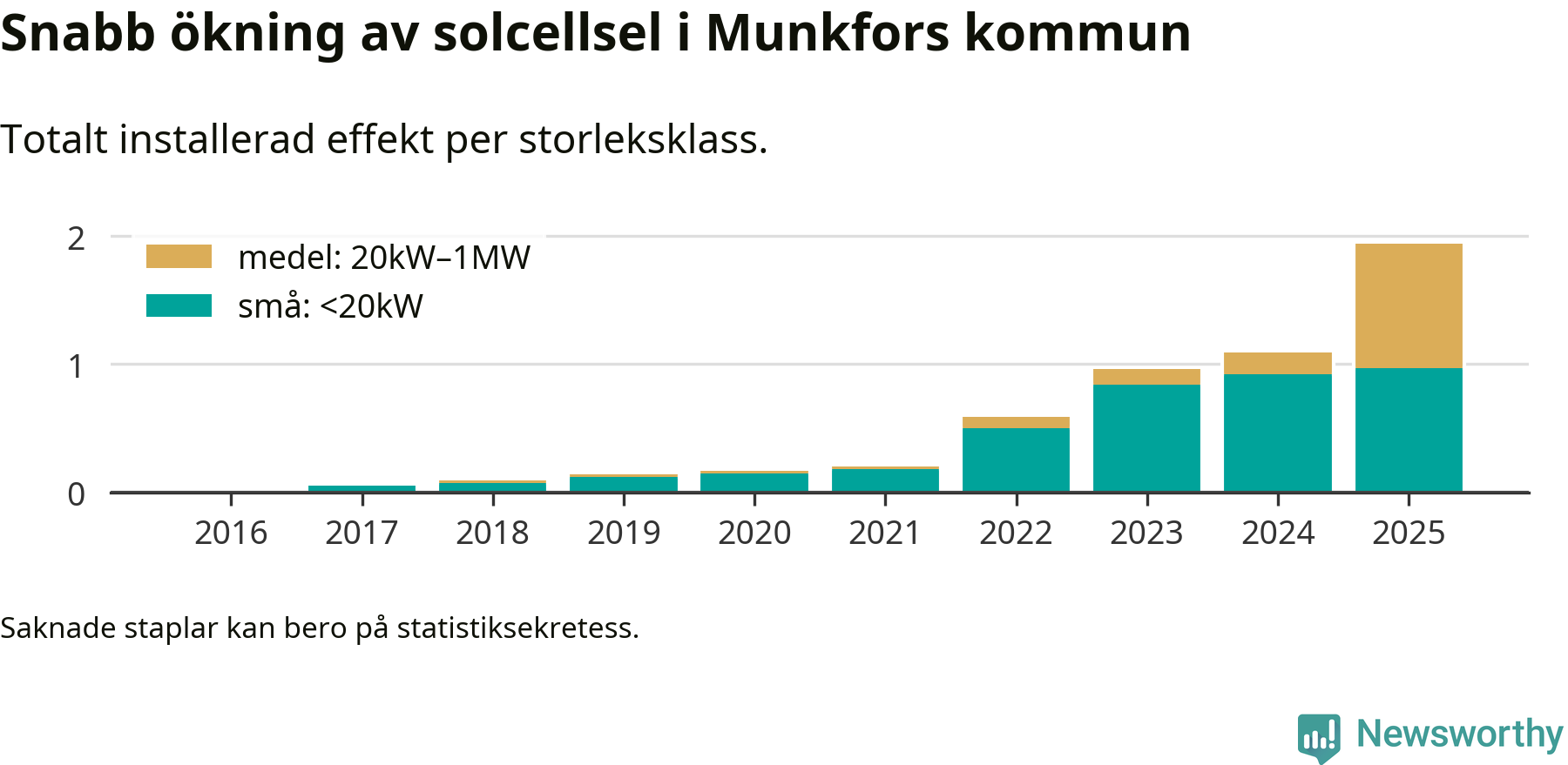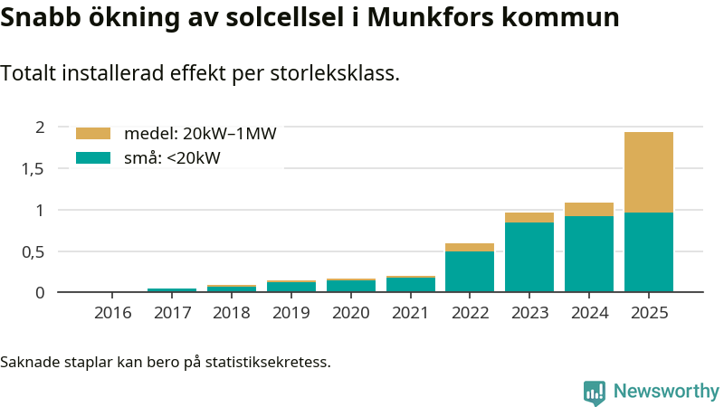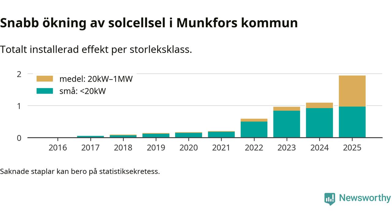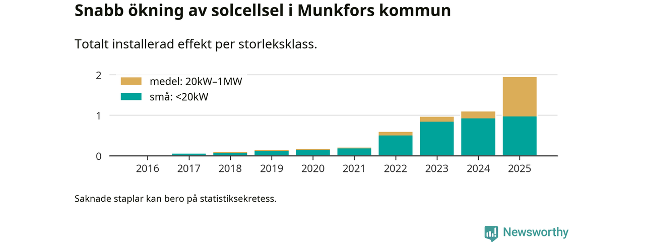 Under 2025 anslöts 0,8 megawatt ny solel till elnätet i Munkfors kommun, en ökning med 77 procent jämfört med året innan.