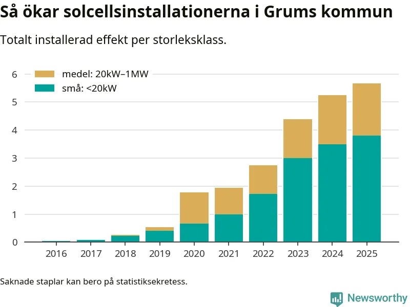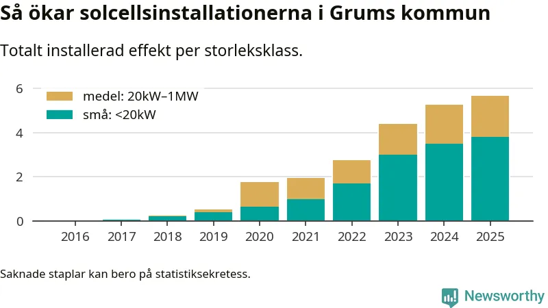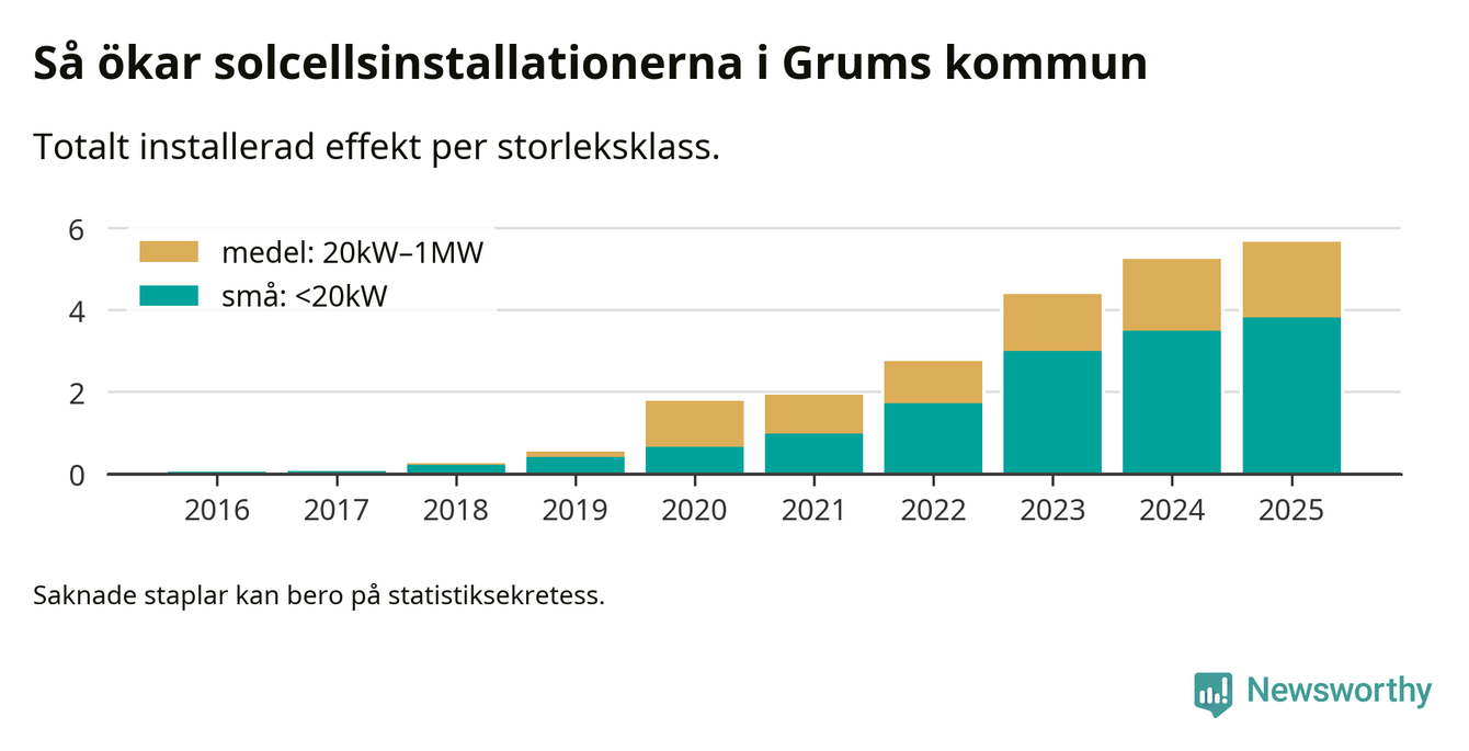 Det är framför allt de stora anläggningarna som driver tillväxten. Småskalig solel dominerar fortfarande produktionen – mer än hälften av effekten finns i anläggningar under 20 kilowatt – men det är bland de stora anläggningarna vi ser den största ökningstakten.