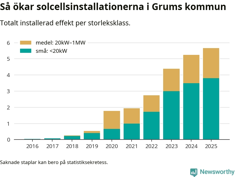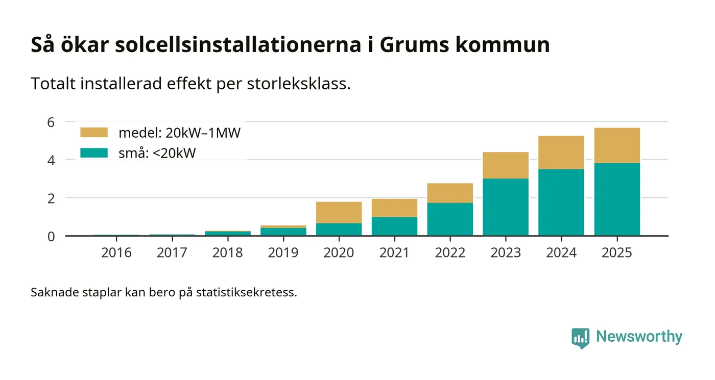 Den största delen av solelen i Grums, 67 procent, kommer från småskaliga anläggningar, totalt 364 stycken. Det påminner om hur det ser ut i riket som helhet. I hela Sverige står anläggningar under 20 kilowatt för mer än hälften av den installerade effekten. Generellt är deras andel störst i kommuner med många villahushåll, medan större anläggningar dominerar i tätbefolkade kommuner med fler flerfamiljsbostäder – och förstås i de småkommuner som har någon av landets stora markanläggningar för solel.