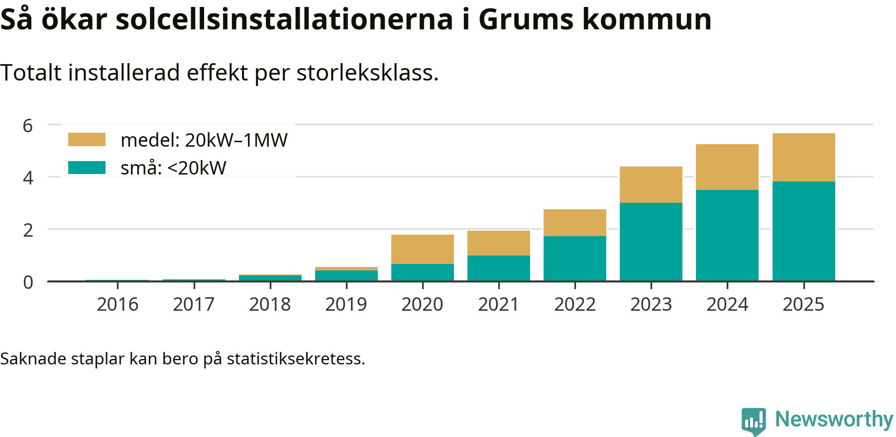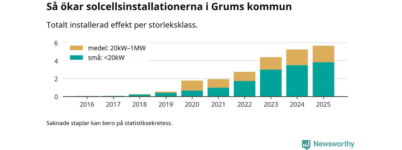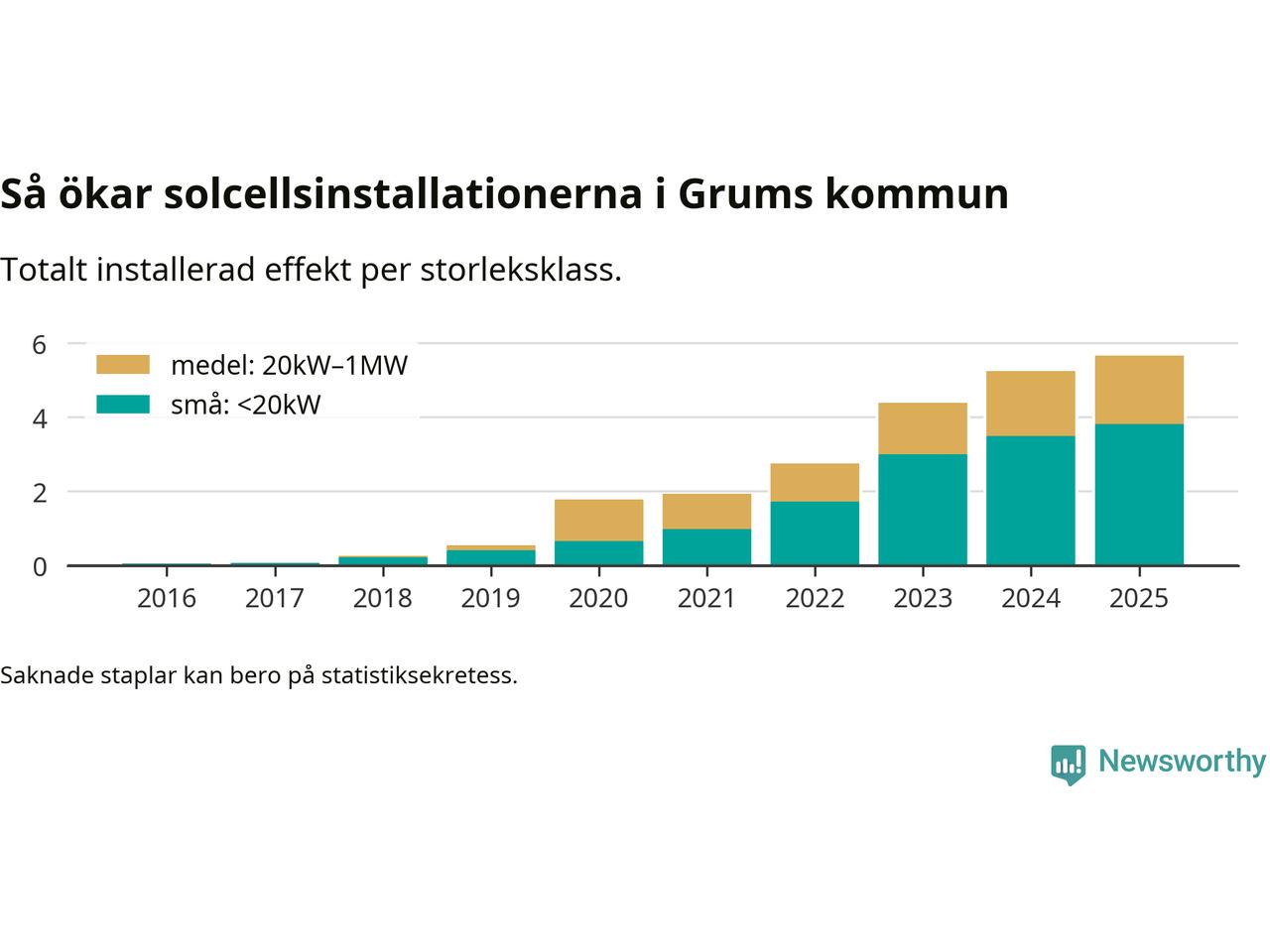 Totalt finns 394 nätanslutna anläggningar, om sammanlagt 5,7 megawatt i kommunen. Det motsvarar, i runda tal, en elproduktion på någonstans mellan 13 och 15 procent av vad hushållen i Grums förbrukar per år.1