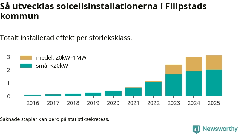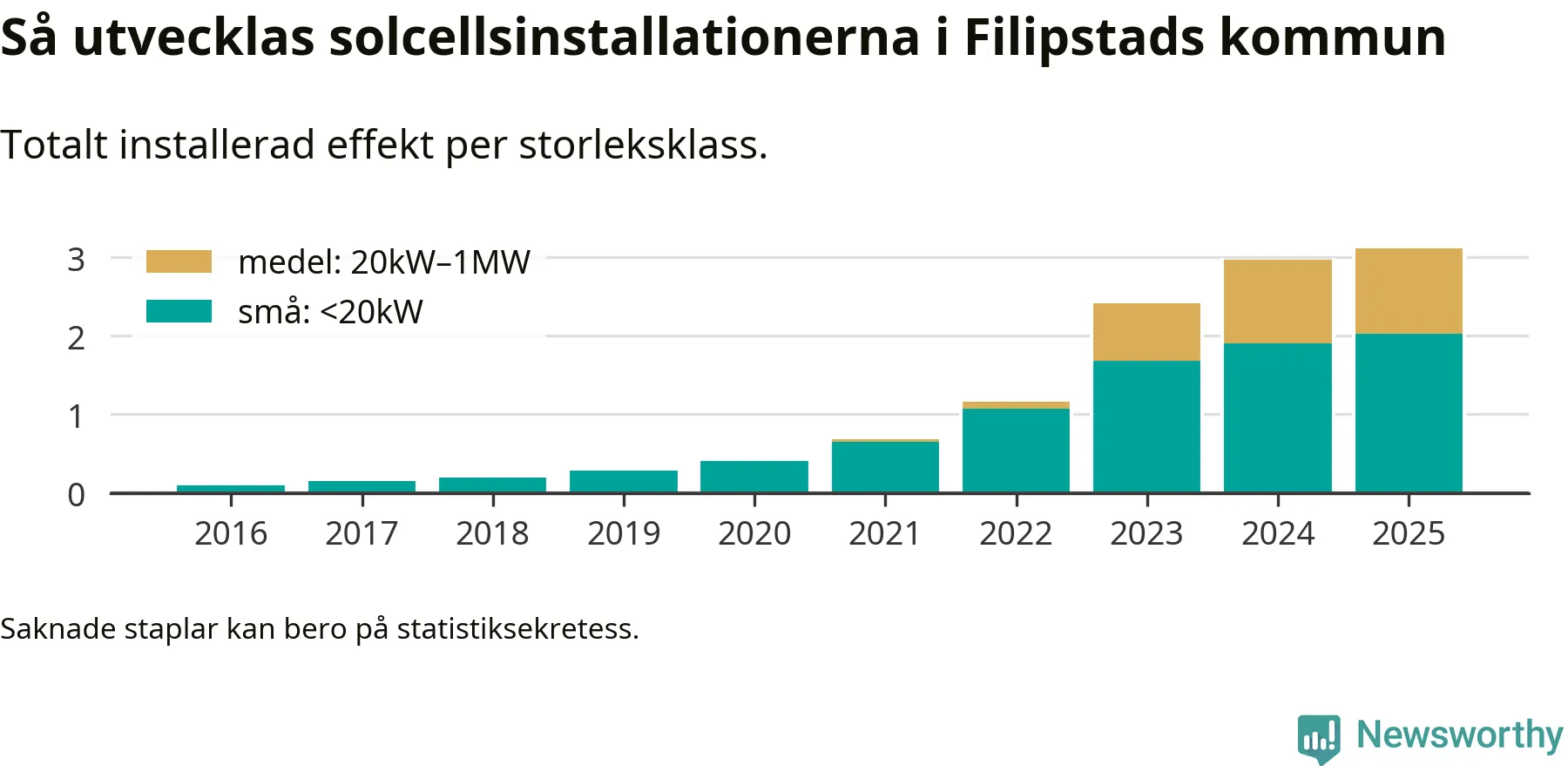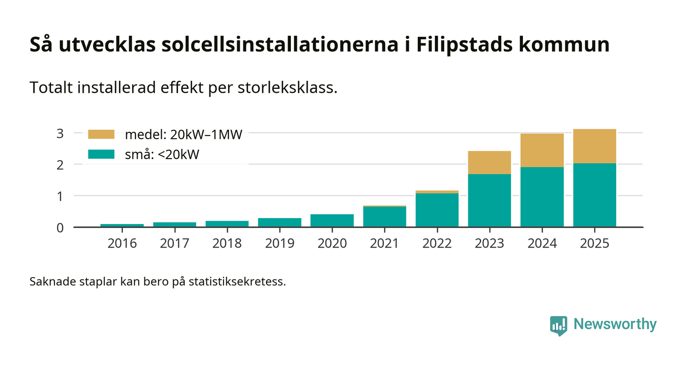 Den största delen av solelen i Filipstad, 65 procent, kommer från småskaliga anläggningar, totalt 202 stycken. Det påminner om hur det ser ut i riket som helhet. I hela Sverige står anläggningar under 20 kilowatt för mer än hälften av den installerade effekten. Generellt är deras andel störst i kommuner med många villahushåll, medan större anläggningar dominerar i tätbefolkade kommuner med fler flerfamiljsbostäder – och förstås i de småkommuner som har någon av landets stora markanläggningar för solel.