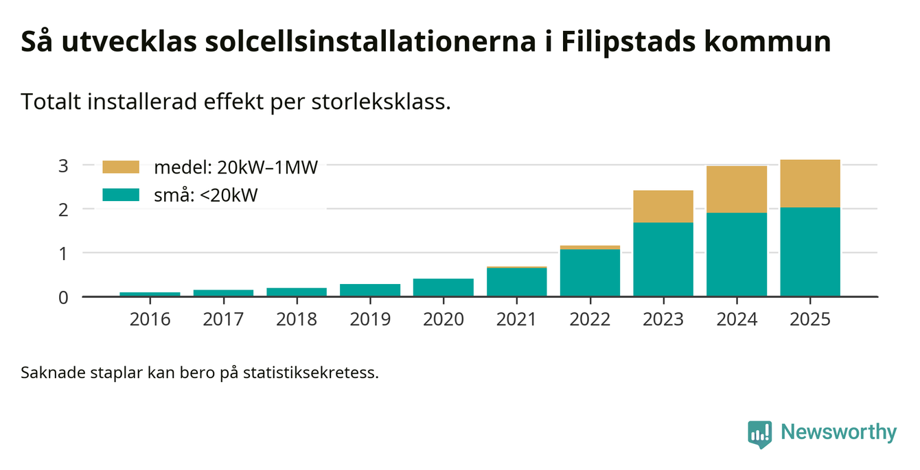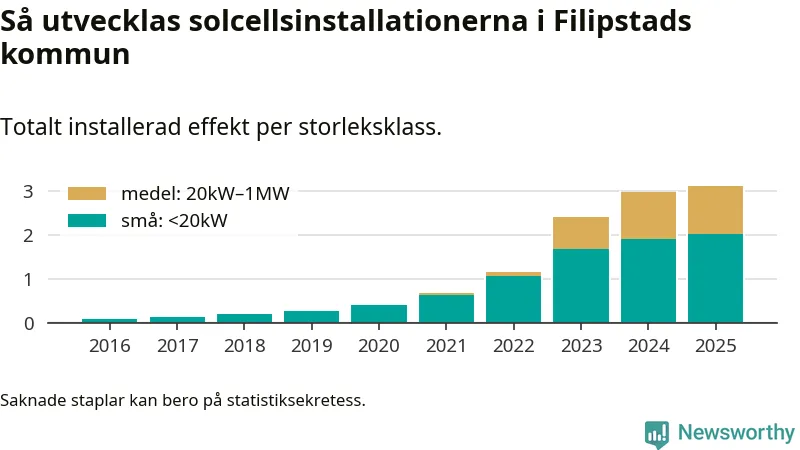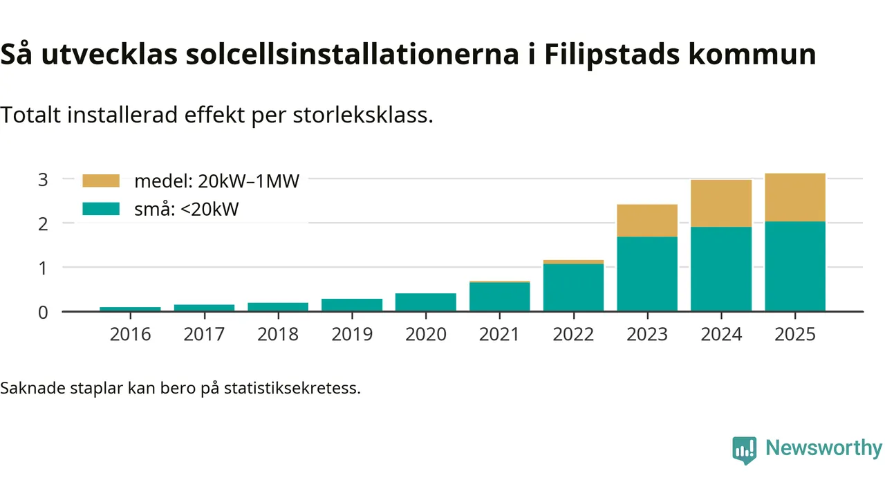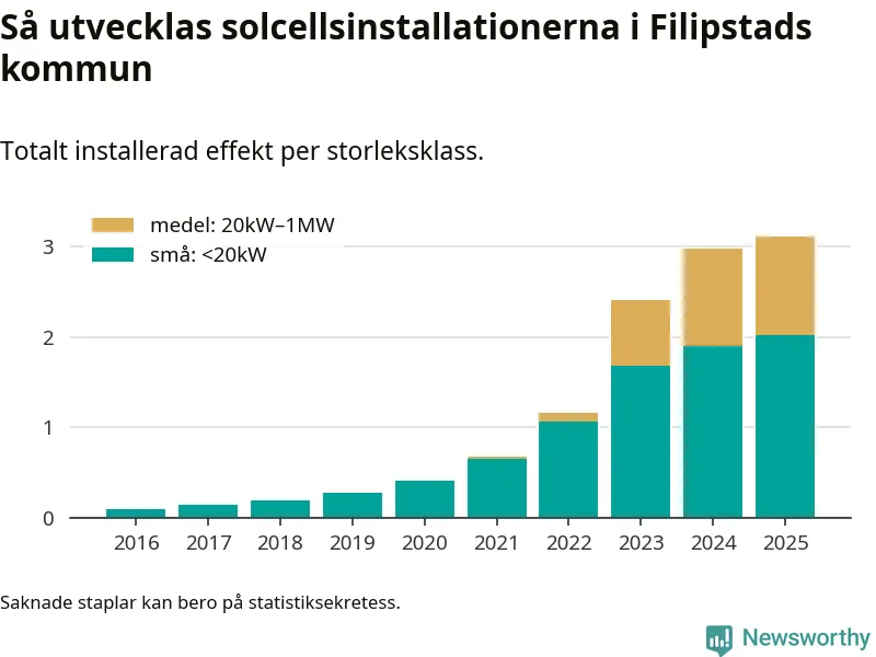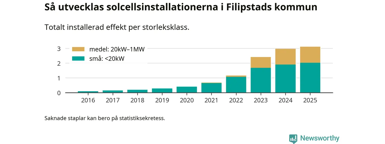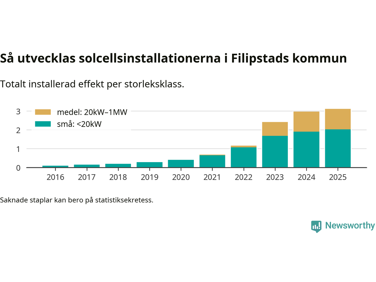 Under 2025 anslöts 140 kilowatt ny solel till elnätet i Filipstads kommun, en ökning med 5 procent jämfört med året innan.