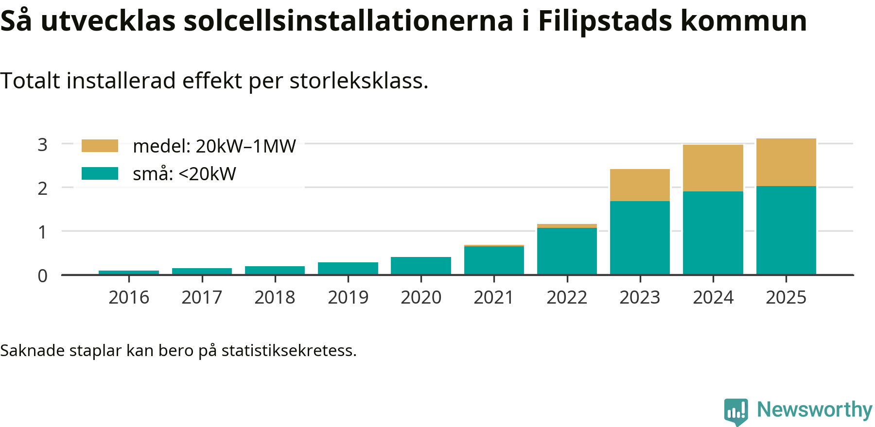 Det är framför allt de stora anläggningarna som driver tillväxten. Småskalig solel dominerar fortfarande produktionen – mer än hälften av effekten finns i anläggningar under 20 kilowatt – men det är bland de stora anläggningarna vi ser den största ökningstakten.