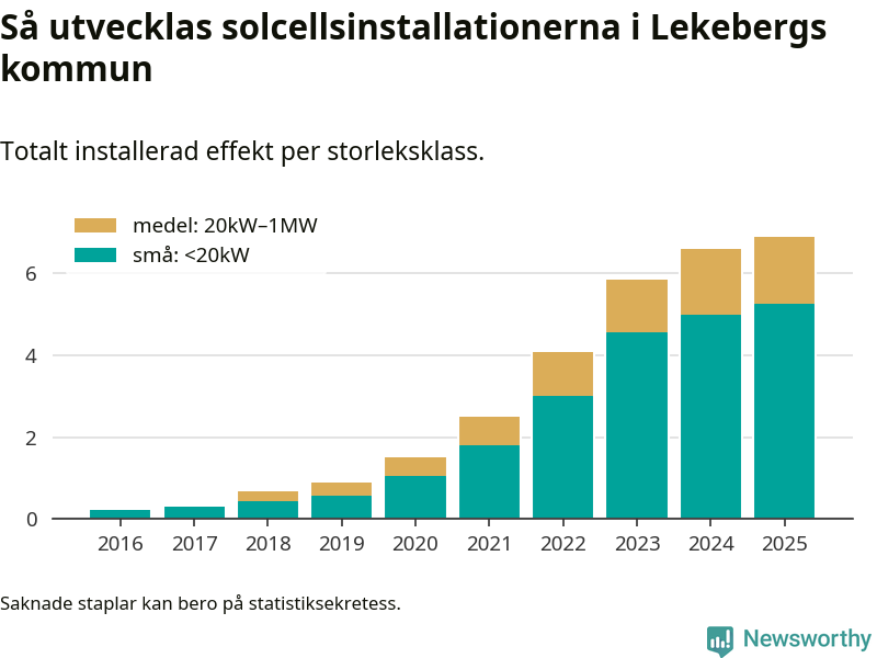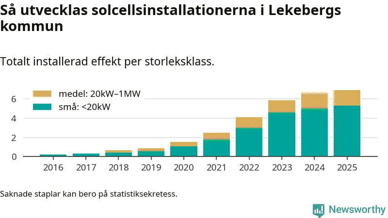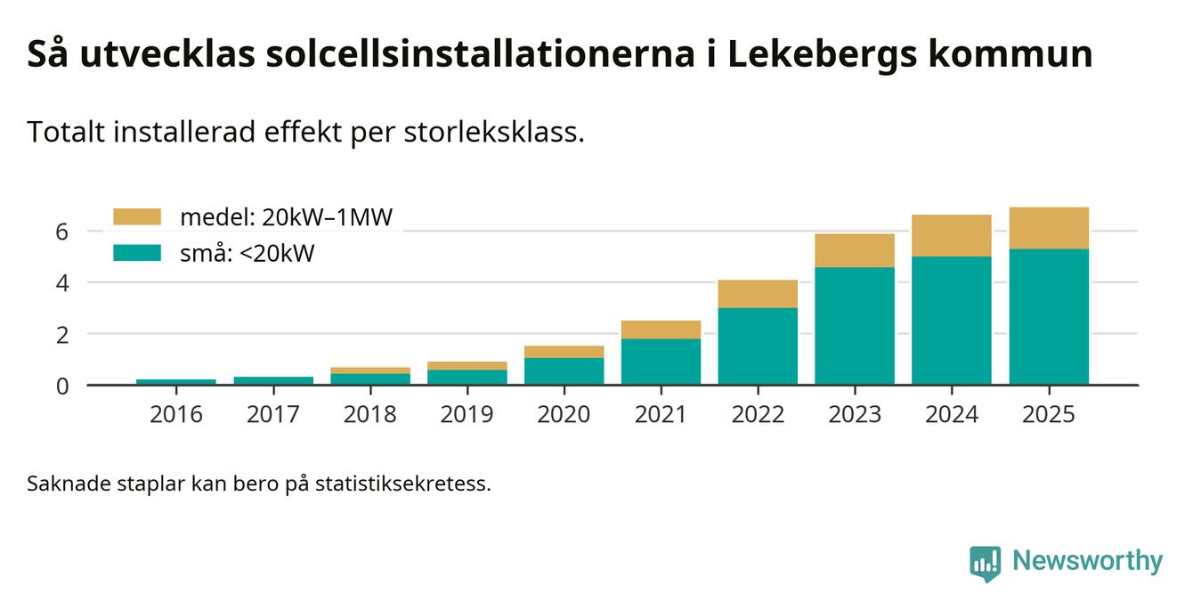 Det är framför allt de stora anläggningarna som driver tillväxten. Småskalig solel dominerar fortfarande produktionen – mer än hälften av effekten finns i anläggningar under 20 kilowatt – men det är bland de stora anläggningarna vi ser den största ökningstakten.