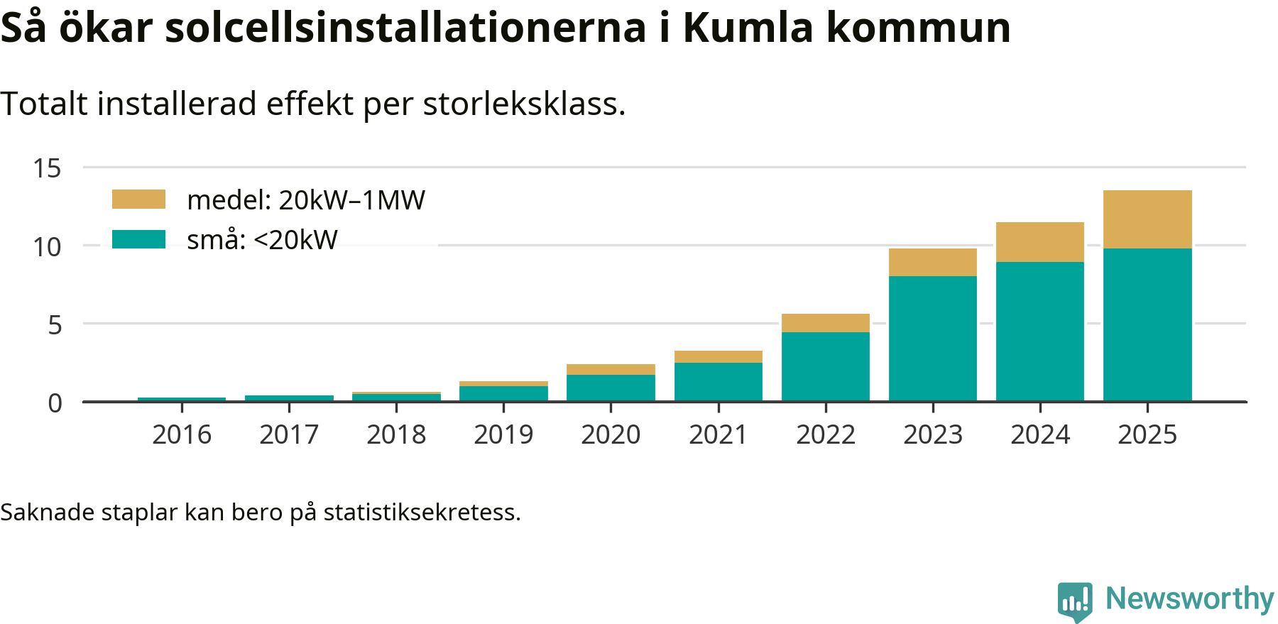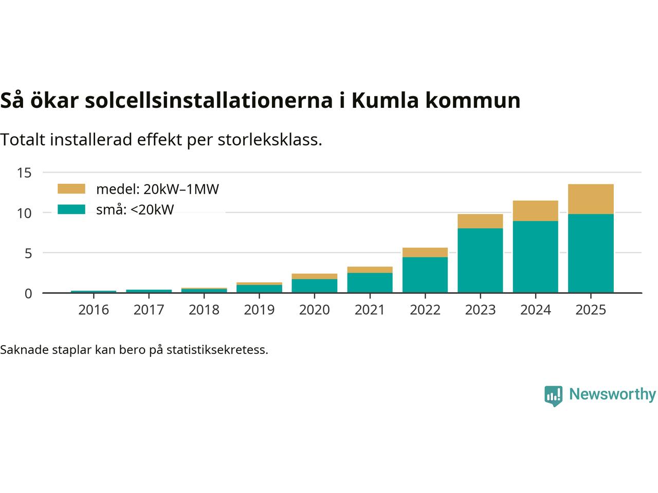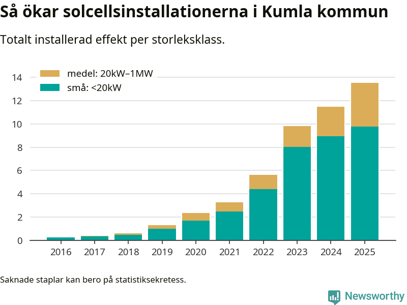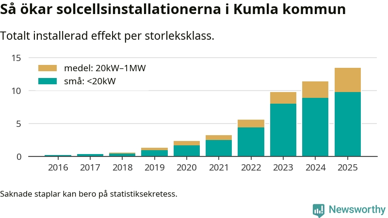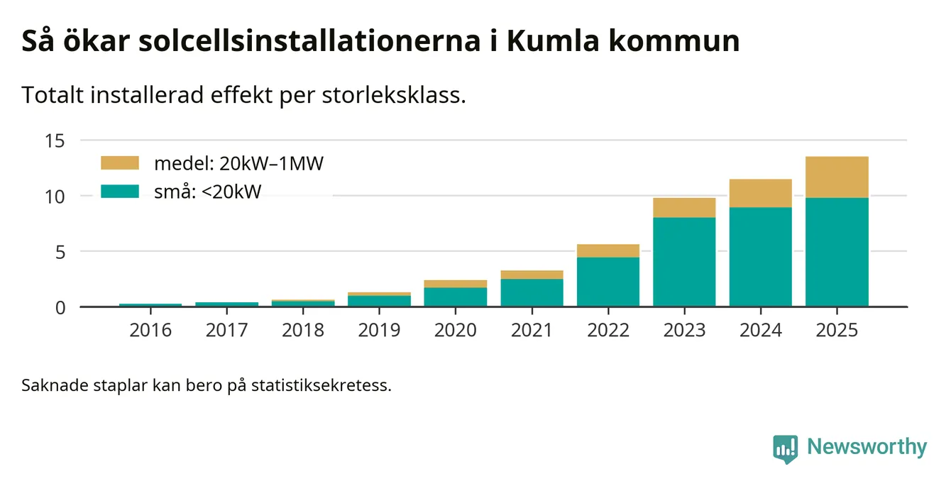 Det är framför allt de stora anläggningarna som driver tillväxten. Småskalig solel dominerar fortfarande produktionen – mer än hälften av effekten finns i anläggningar under 20 kilowatt – men det är bland de stora anläggningarna vi ser den största ökningstakten.