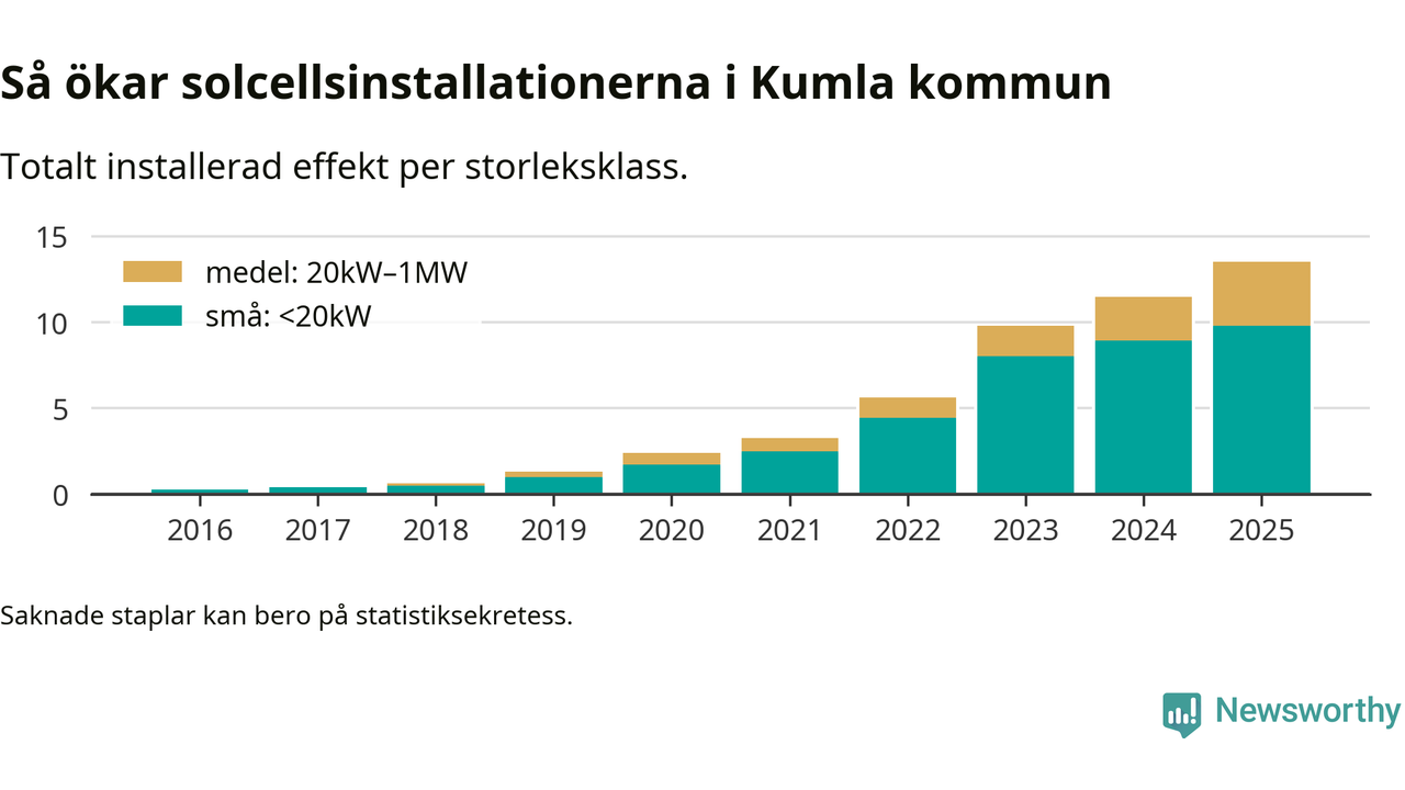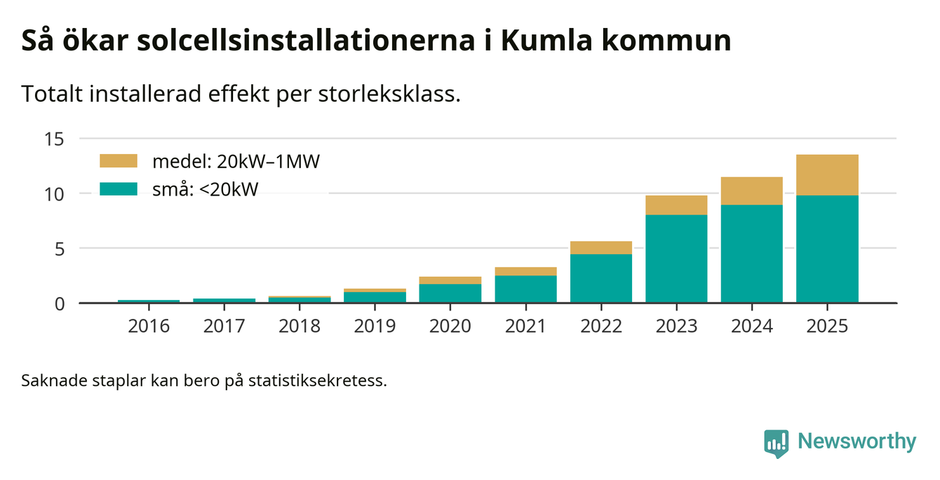 Totalt finns 972 nätanslutna anläggningar, om sammanlagt 13,5 megawatt i kommunen. Det motsvarar, i runda tal, en elproduktion på någonstans mellan 16 och 17 procent av vad hushållen i Kumla förbrukar per år.1