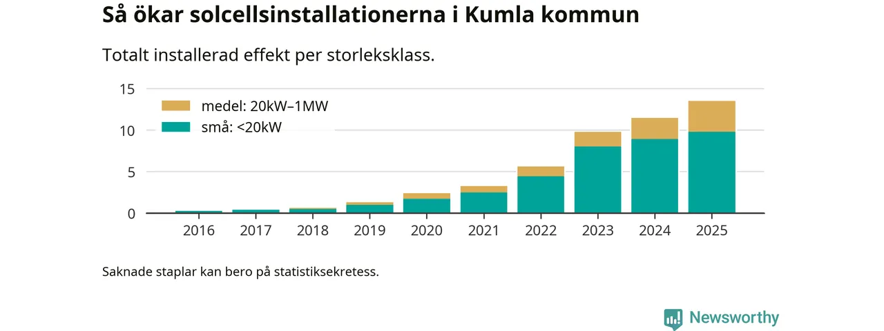 Under 2025 anslöts 2,1 megawatt ny solel till elnätet i Kumla kommun, en ökning med 18 procent jämfört med året innan.