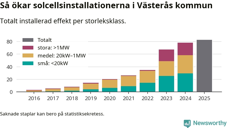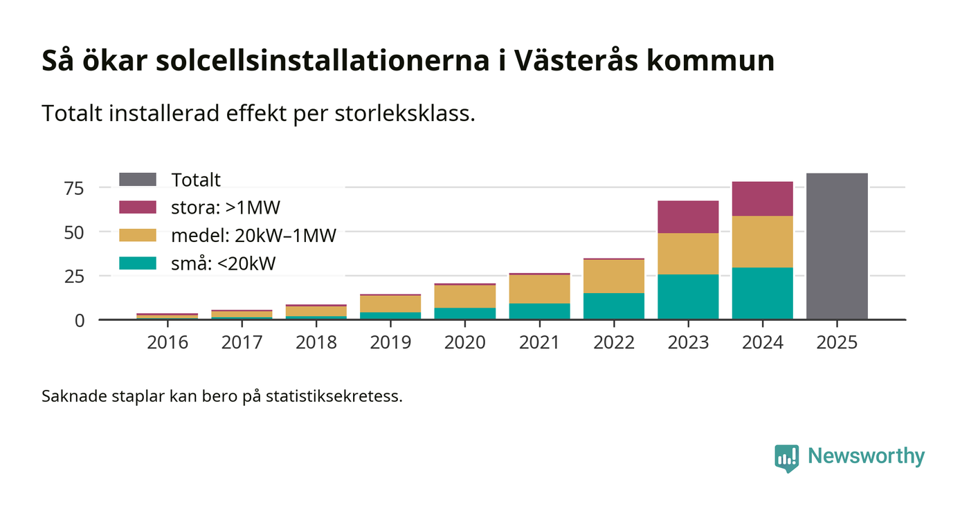 Totalt finns 3 568 nätanslutna anläggningar, om sammanlagt 82,9 megawatt i kommunen. Det motsvarar, i runda tal, en elproduktion på någonstans mellan 21 och 24 procent av vad hushållen i Västerås förbrukar per år.1