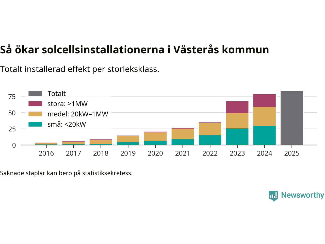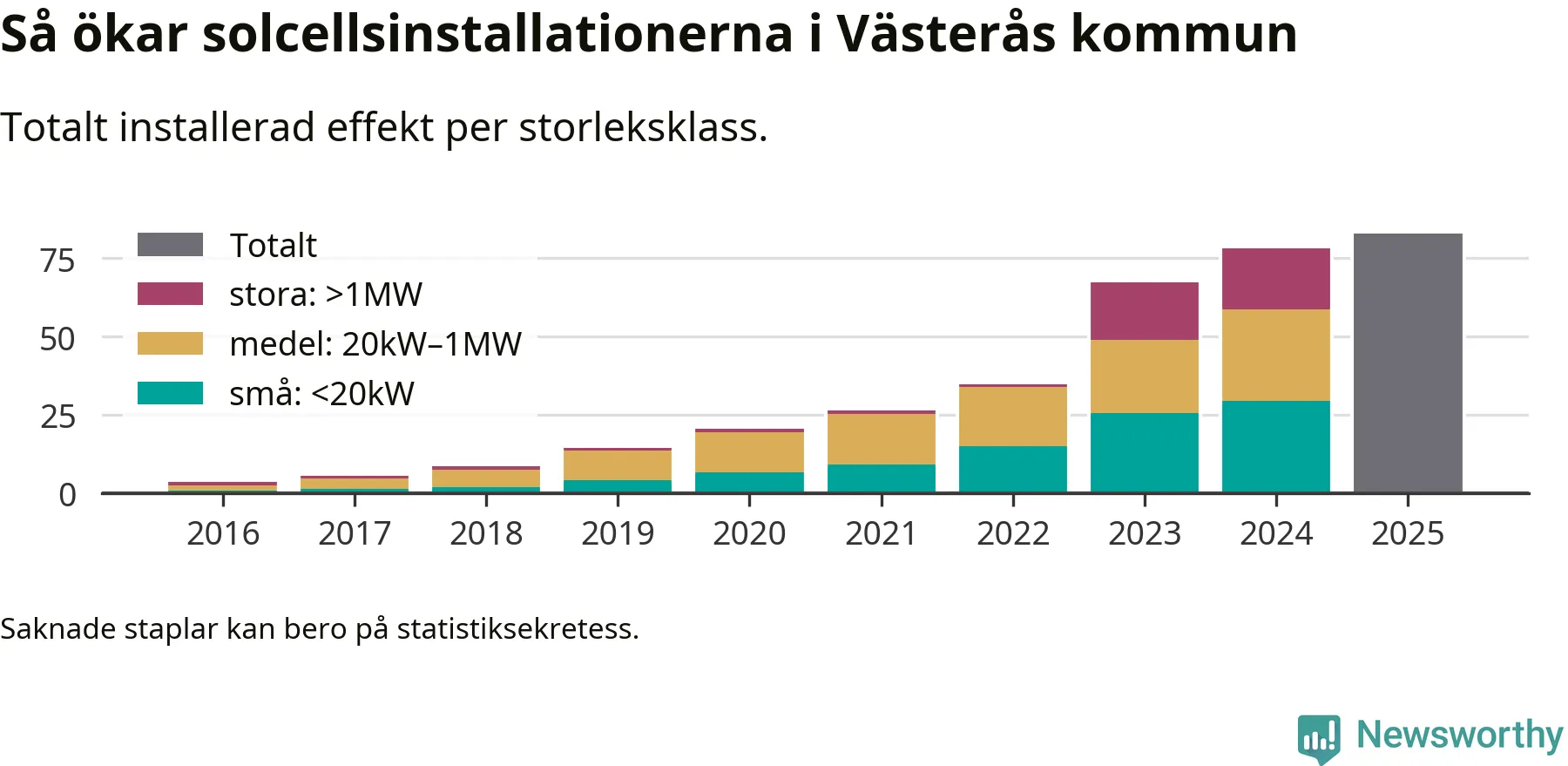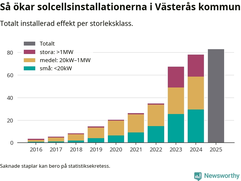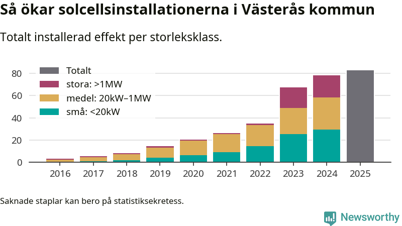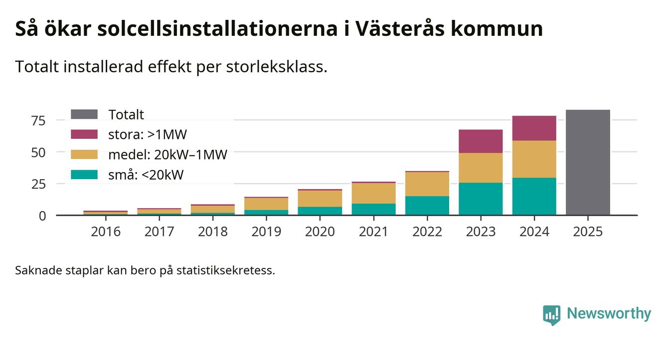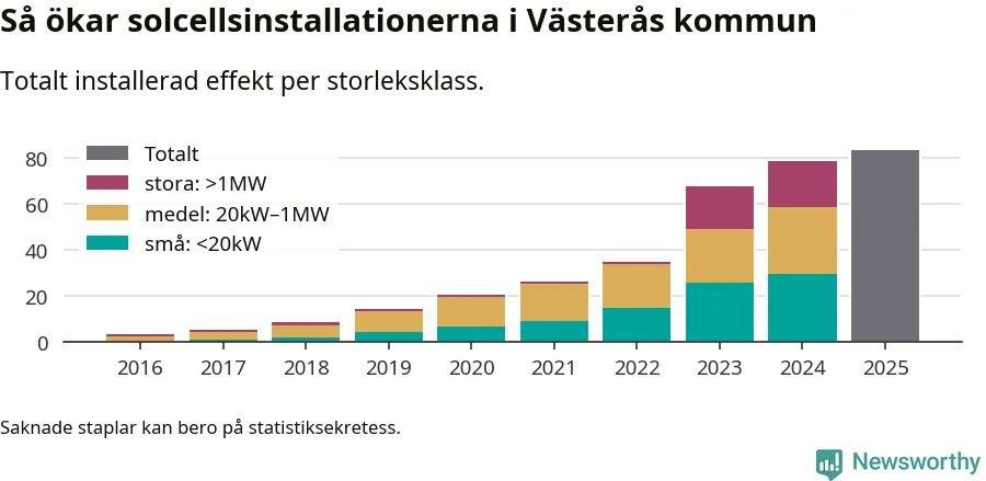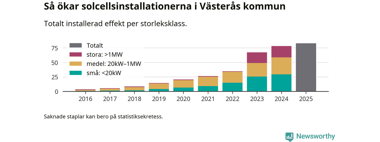 Det är framför allt de stora anläggningarna som driver tillväxten. Småskalig solel dominerar fortfarande produktionen – mer än hälften av effekten finns i anläggningar under 20 kilowatt – men det är bland de stora anläggningarna vi ser den största ökningstakten.