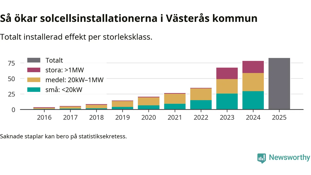 Under 2025 anslöts 4,8 megawatt ny solel till elnätet i Västerås kommun, en ökning med 6 procent jämfört med året innan.
