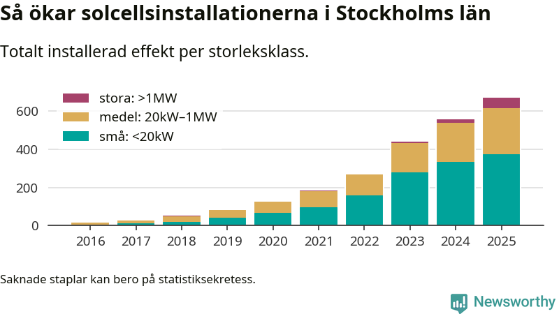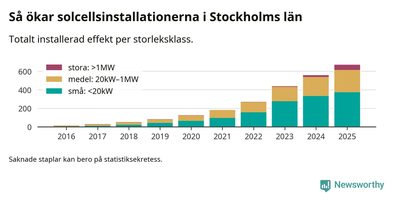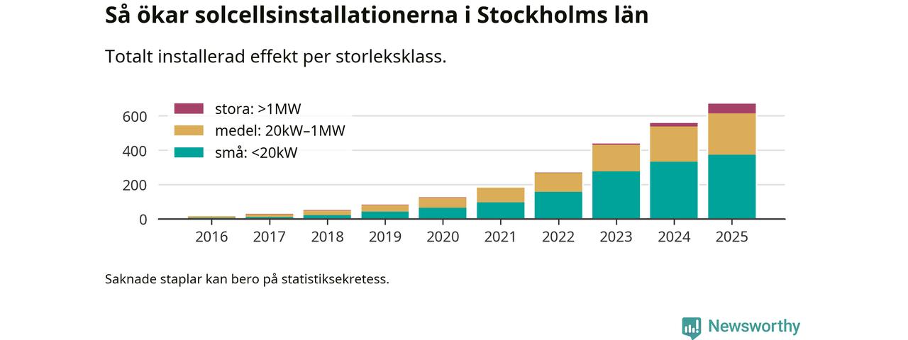 Den största delen av solelen i Stockholm, 56 procent, kommer från småskaliga anläggningar, totalt 35 631 stycken. Det påminner om hur det ser ut i riket som helhet. I hela Sverige står anläggningar under 20 kilowatt för mer än hälften av den installerade effekten. Generellt är deras andel störst i kommuner med många villahushåll, medan större anläggningar dominerar i tätbefolkade kommuner med fler flerfamiljsbostäder – och förstås i de småkommuner som har någon av landets stora markanläggningar för solel.