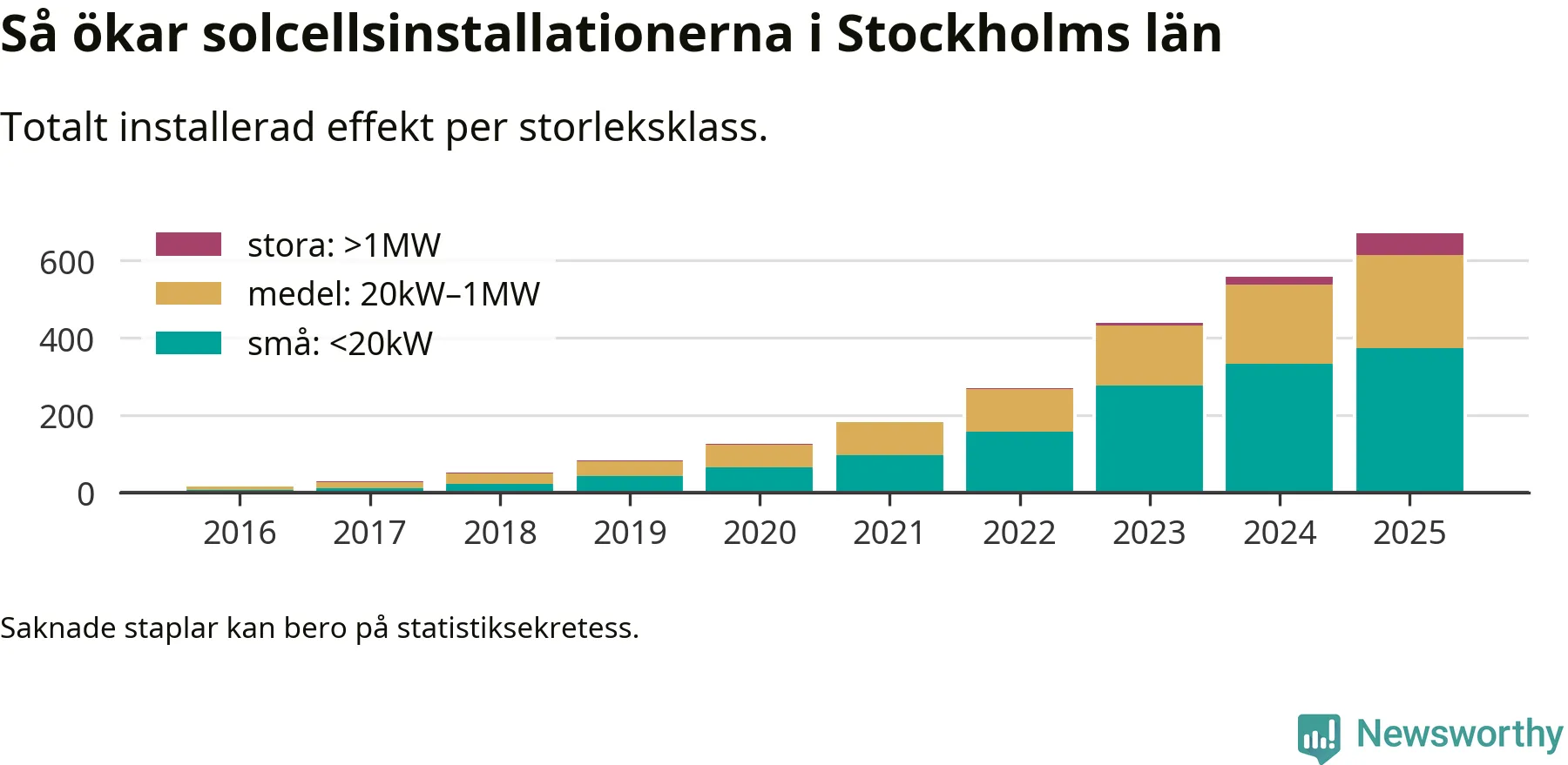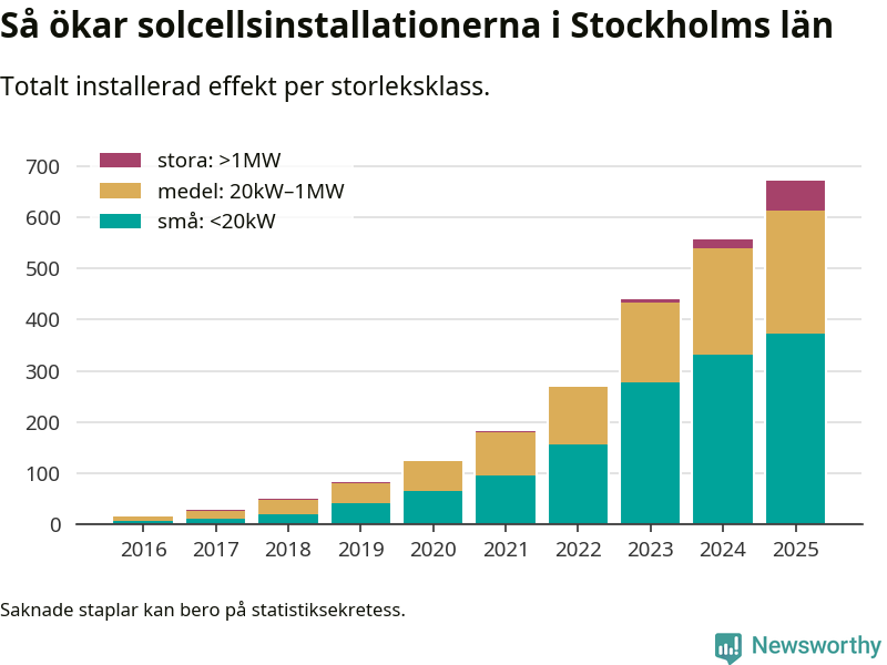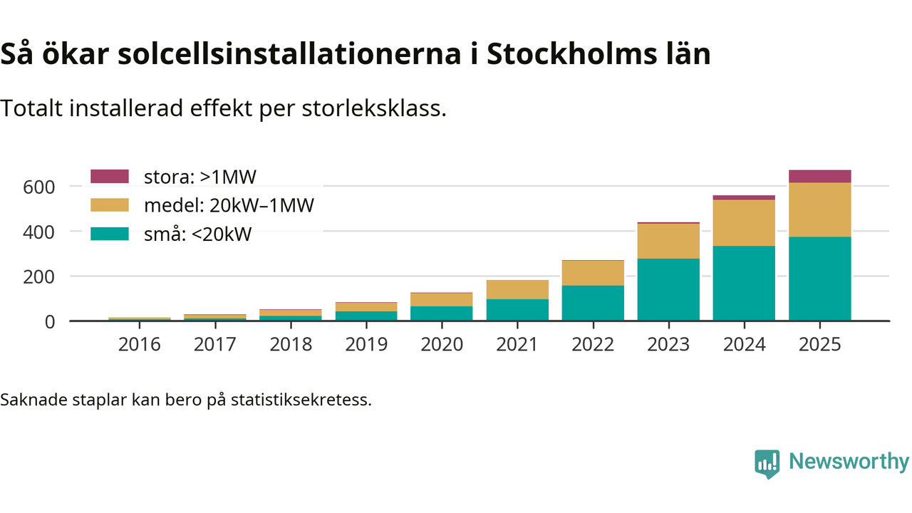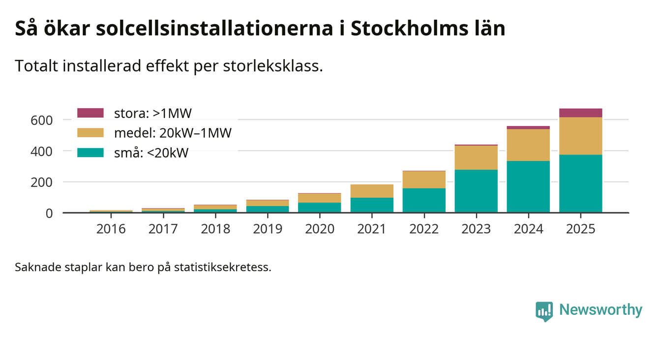 Det är framför allt de stora anläggningarna som driver tillväxten. Småskalig solel dominerar fortfarande produktionen – mer än hälften av effekten finns i anläggningar under 20 kilowatt – men det är bland de stora anläggningarna vi ser den största ökningstakten.