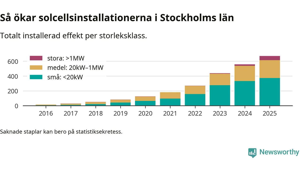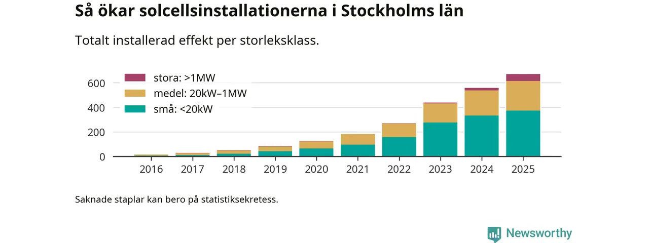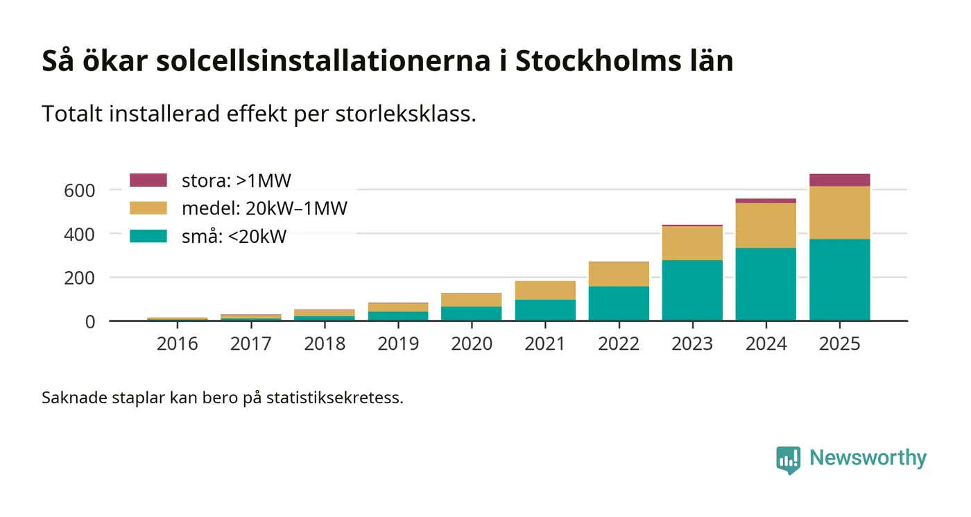 Under 2025 anslöts 113,6 megawatt ny solel till elnätet i Stockholms län, en ökning med 20 procent jämfört med året innan.