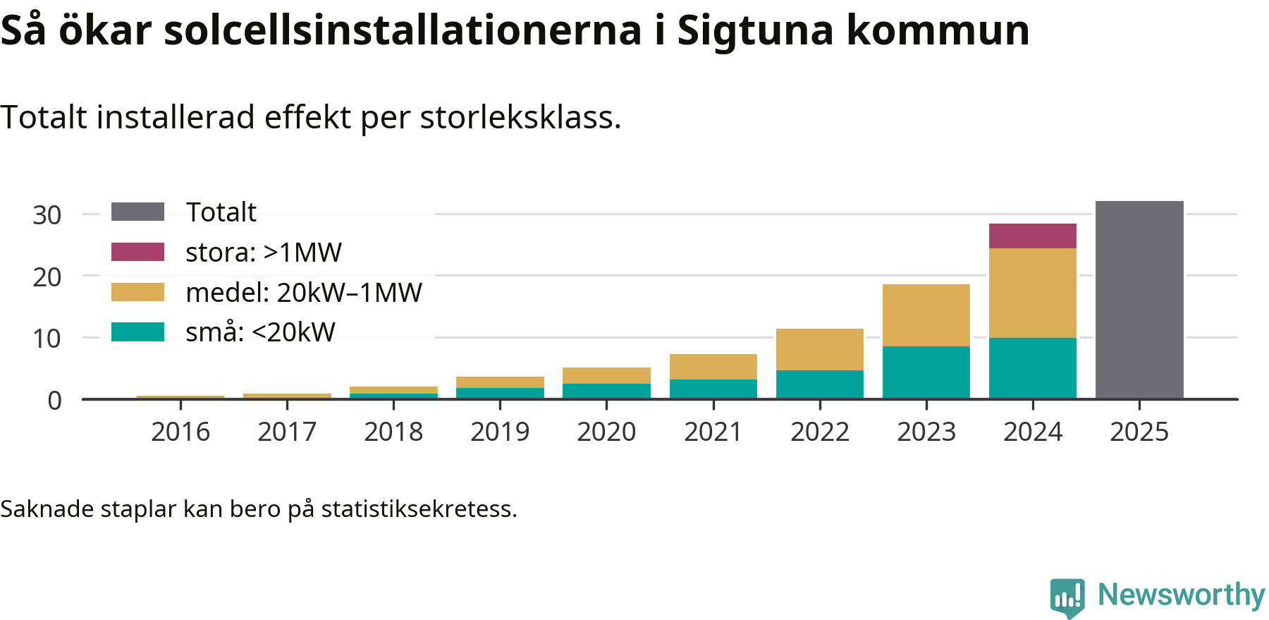 Totalt finns 1 235 nätanslutna anläggningar, om sammanlagt 32 megawatt i kommunen. Det motsvarar, i runda tal, en elproduktion på någonstans mellan 22 och 26 procent av vad hushållen i Sigtuna förbrukar per år.1