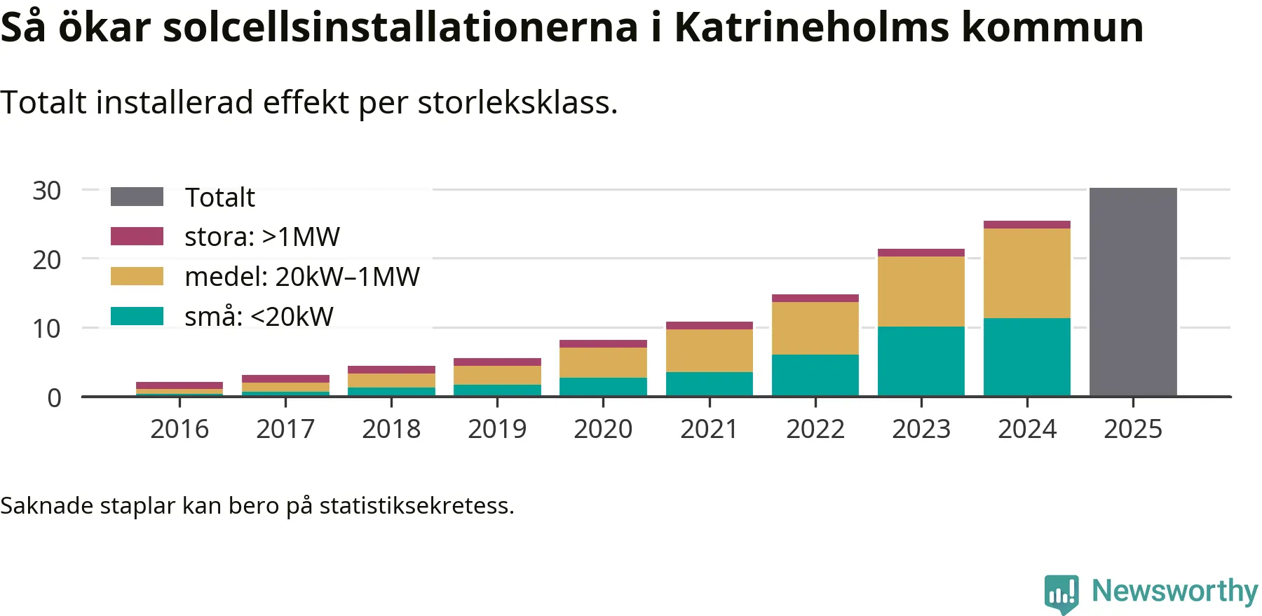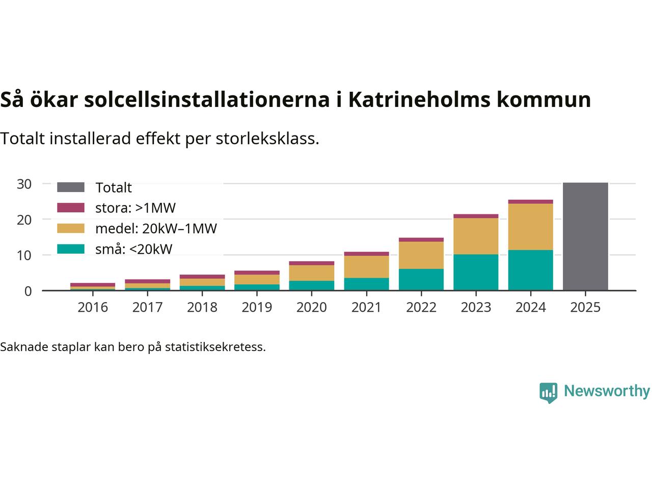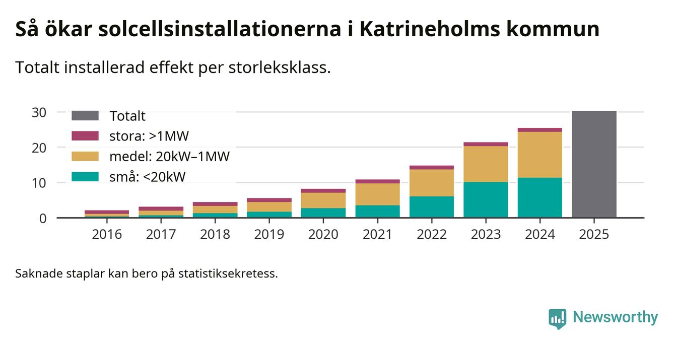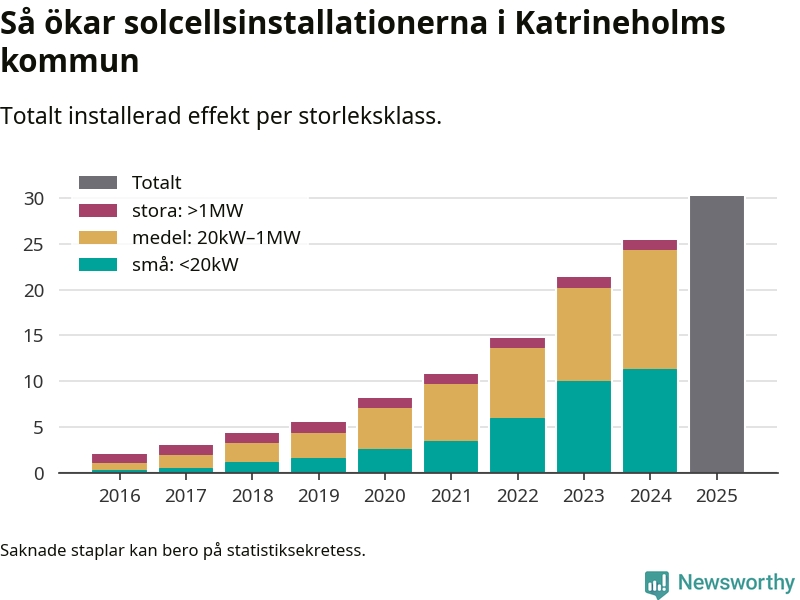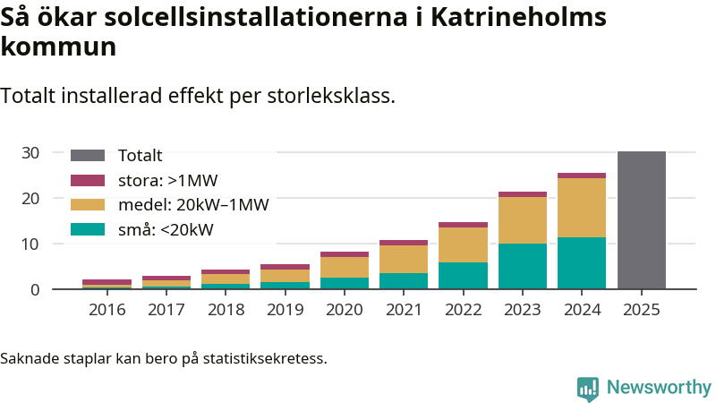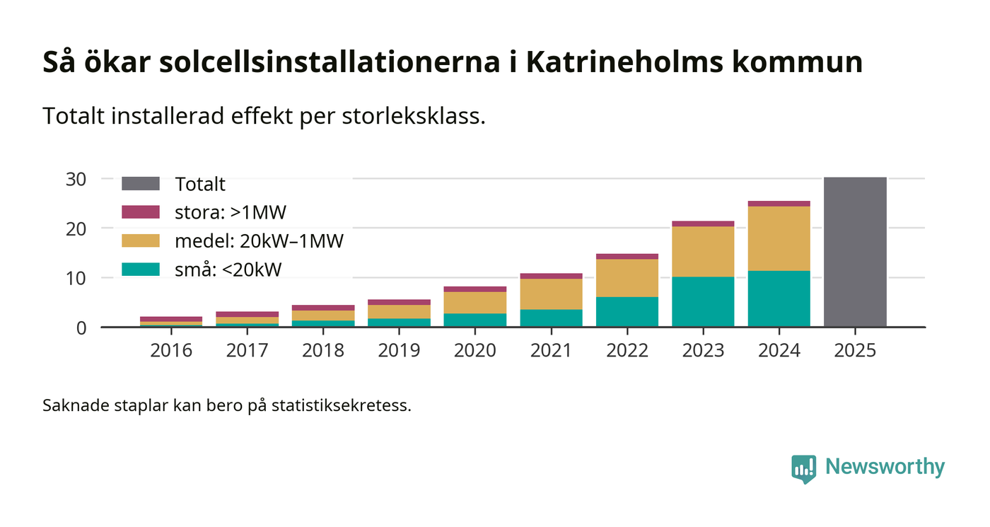 Det är framför allt de stora anläggningarna som driver tillväxten. Småskalig solel dominerar fortfarande produktionen – mer än hälften av effekten finns i anläggningar under 20 kilowatt – men det är bland de stora anläggningarna vi ser den största ökningstakten.